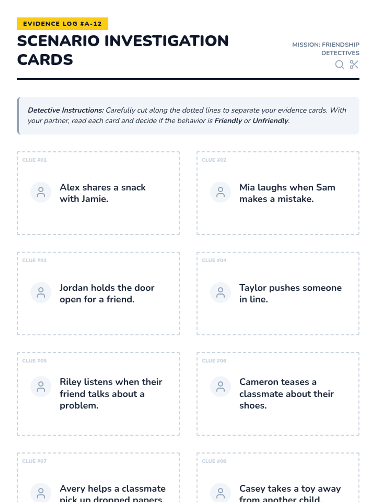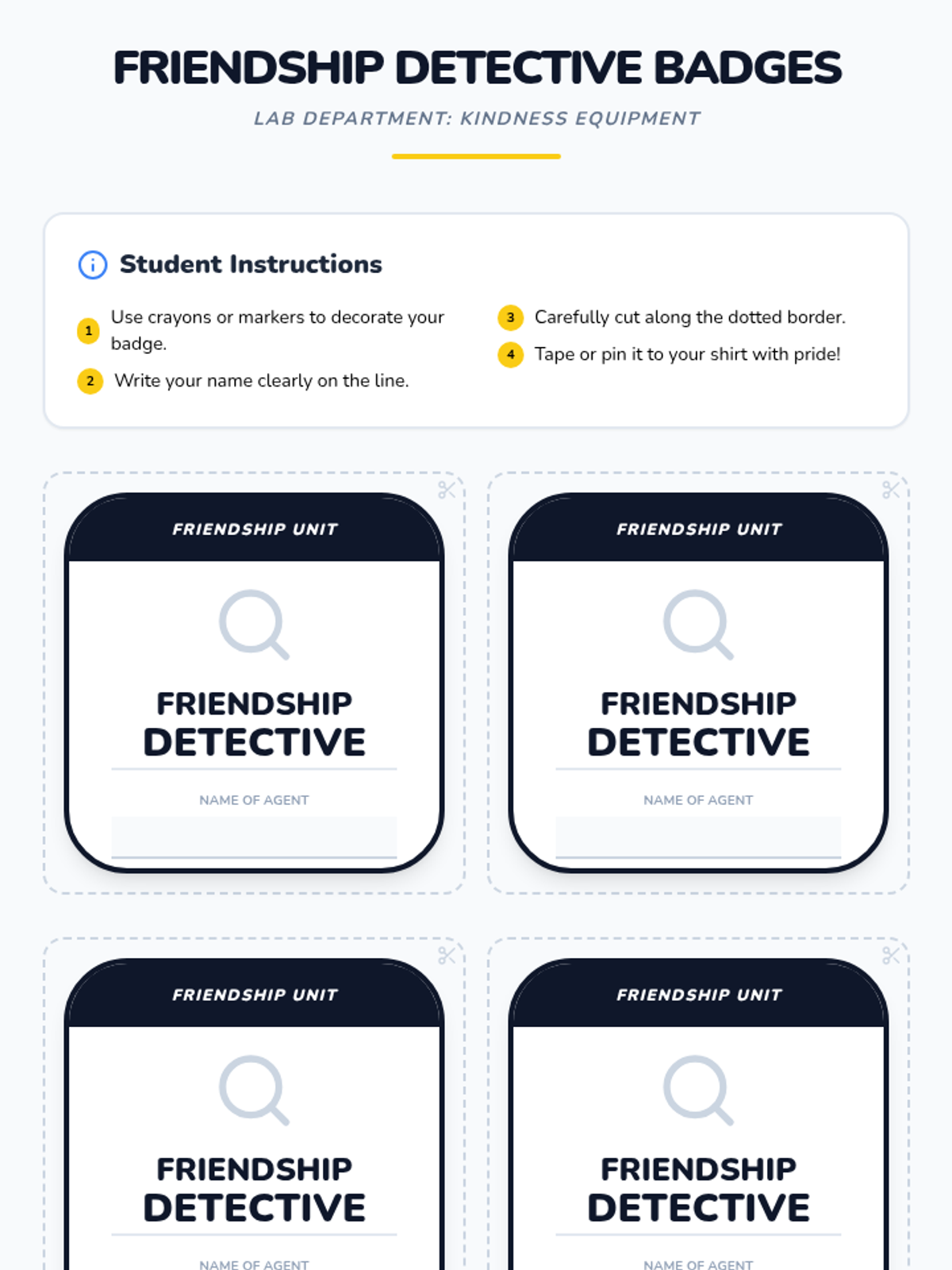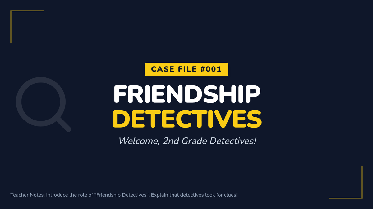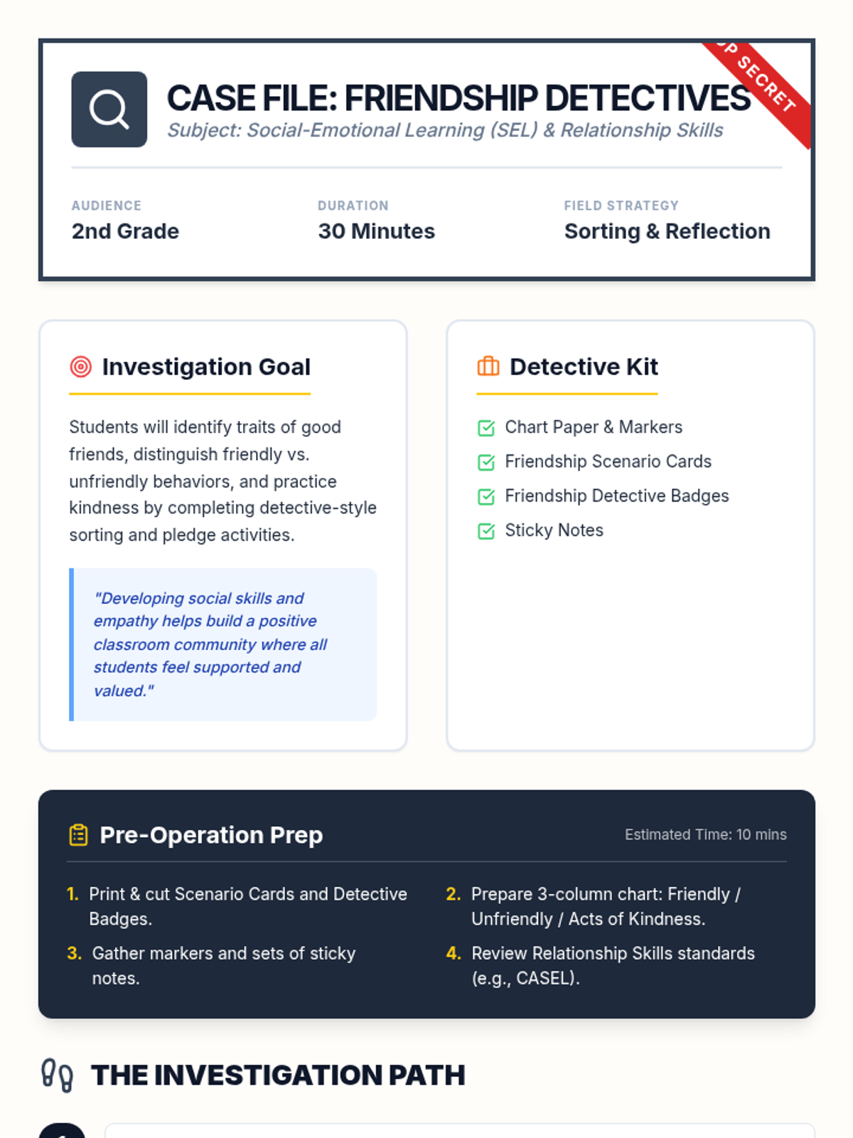 A 30-minute social-emotional learning lesson for 2nd graders where they become 'Friendship Detectives' to identify positive behaviors and practice kindness.