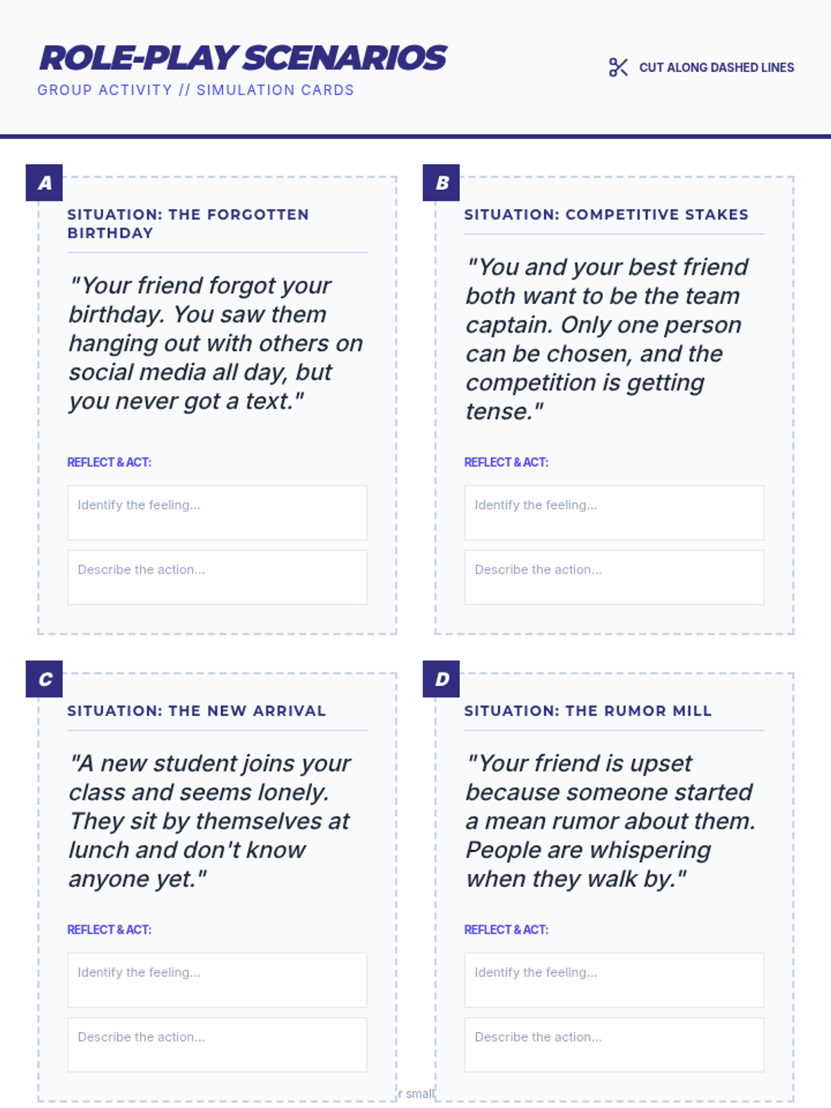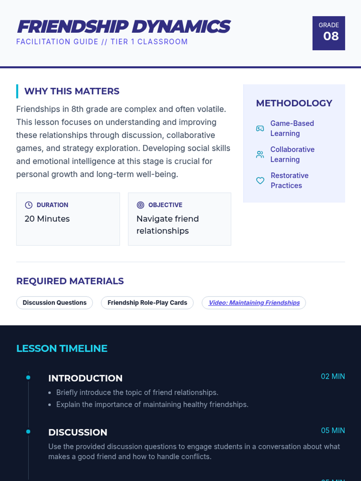Explore the intricacies of 8th-grade friendships through collaborative activities, guided discussion, and strategic role-playing to build emotional intelligence.