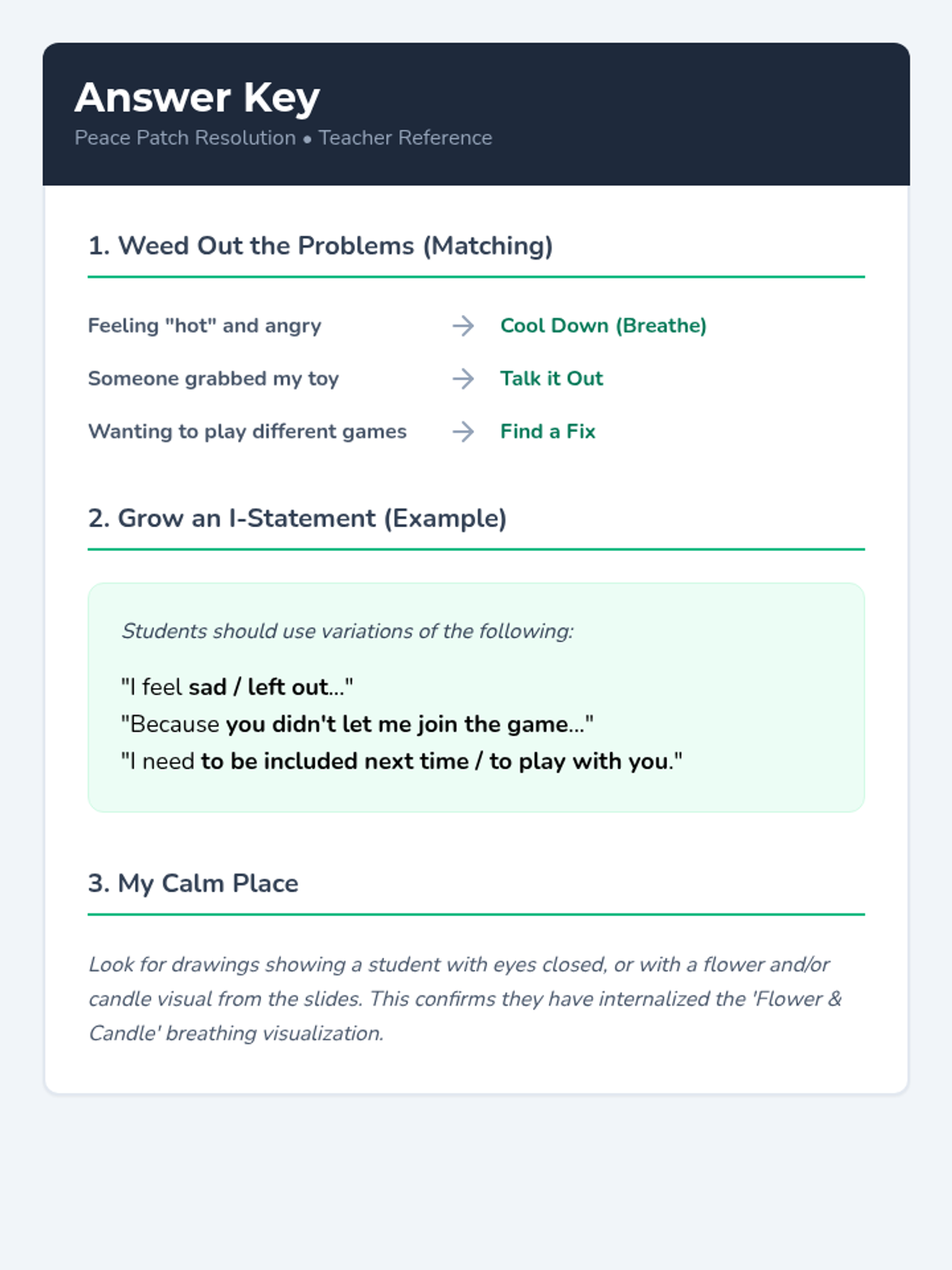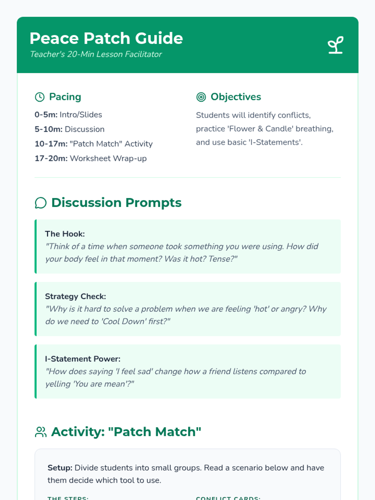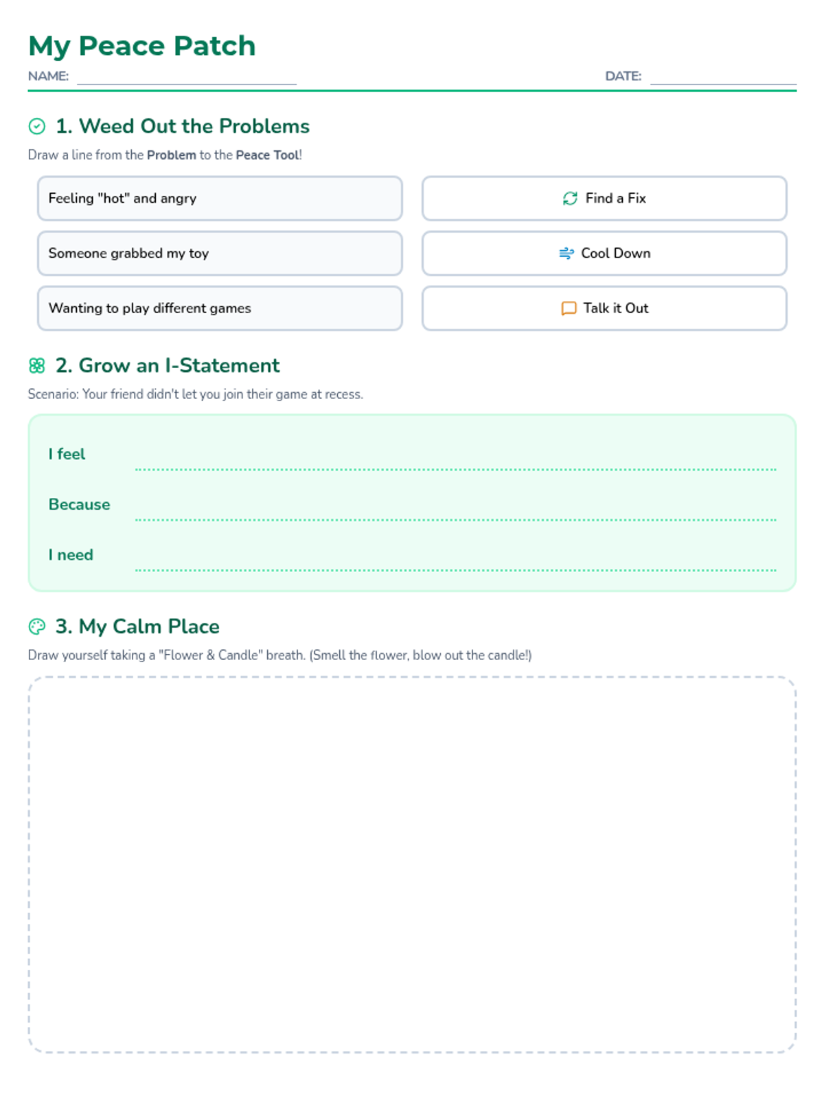 A 20-minute lesson teaching K-4 students conflict resolution strategies through a 'Peace Patch' garden theme, focusing on breathing, I-statements, and finding solutions.