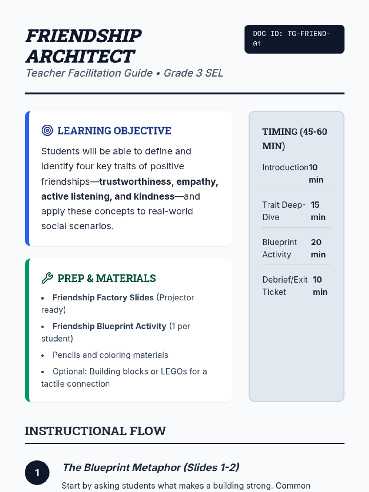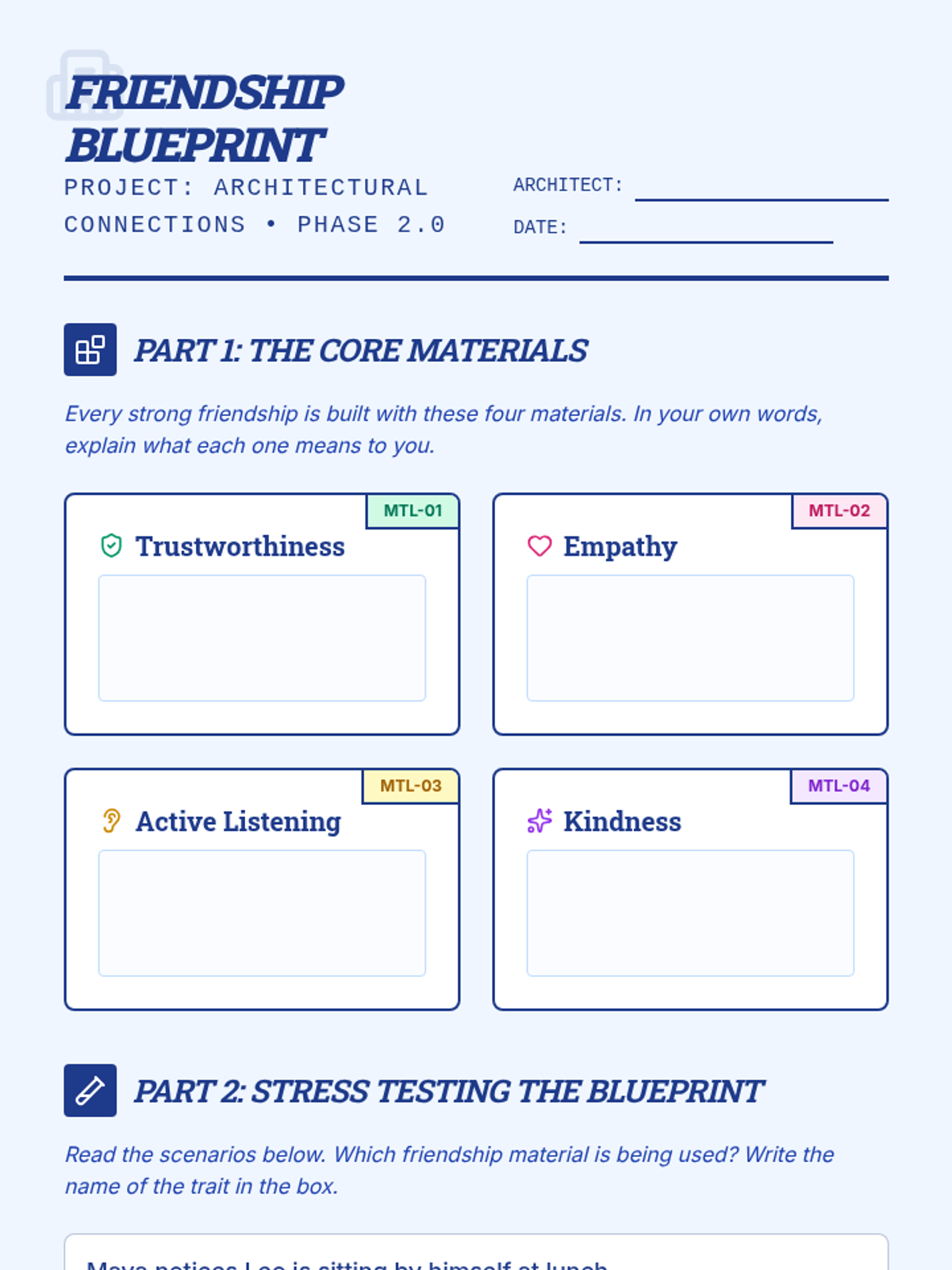 A lesson where 3rd grade students act as 'Friendship Architects' to identify and define the core traits of positive relationships: trustworthiness, empathy, active listening, and kindness.
