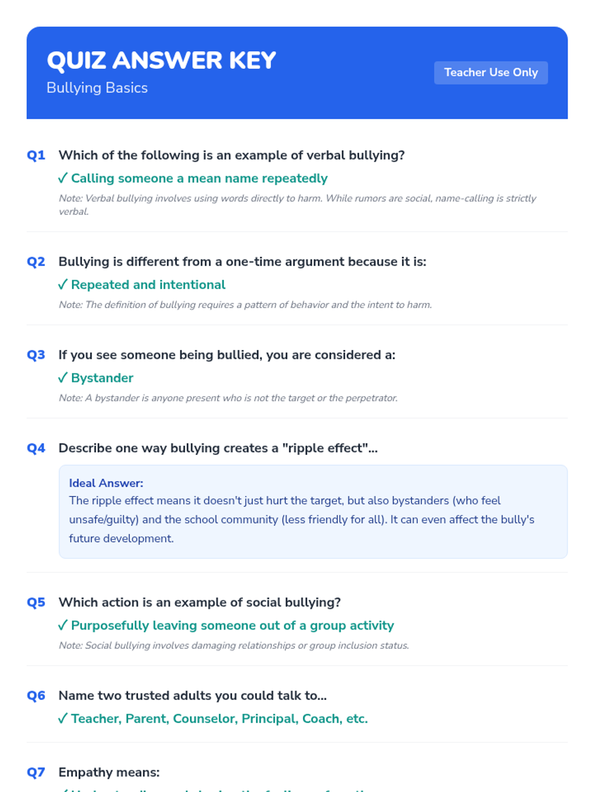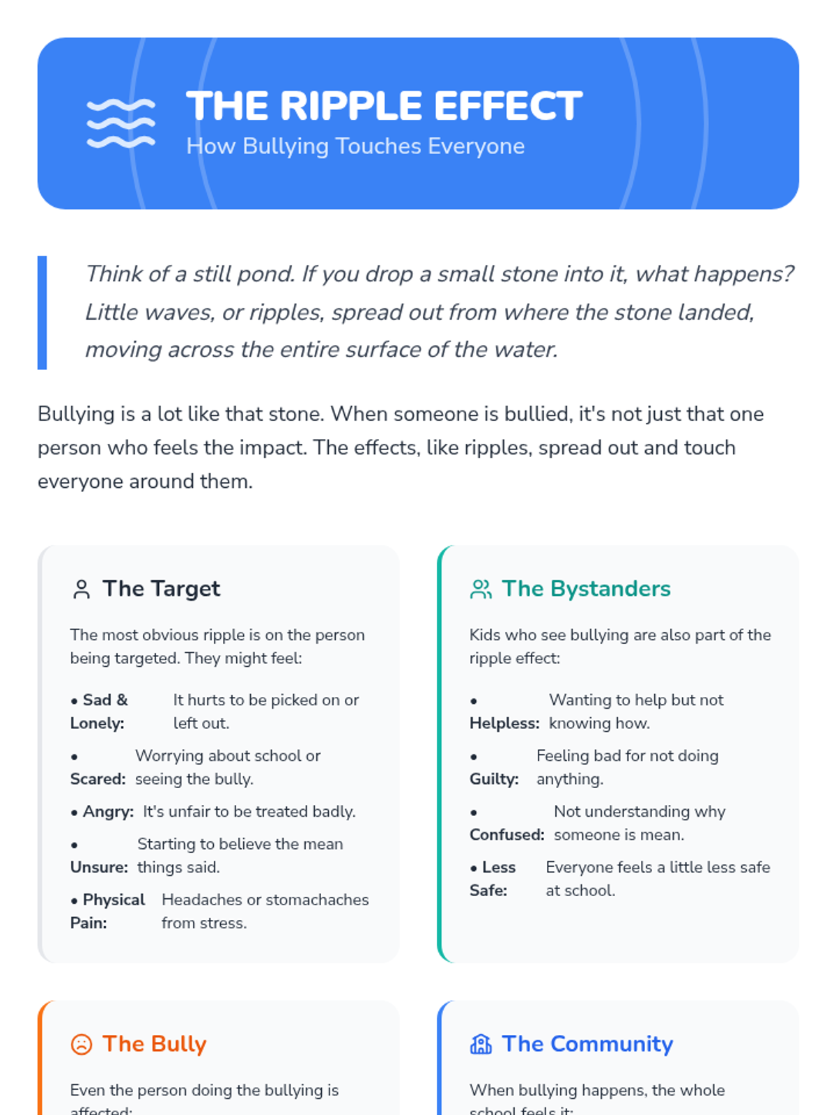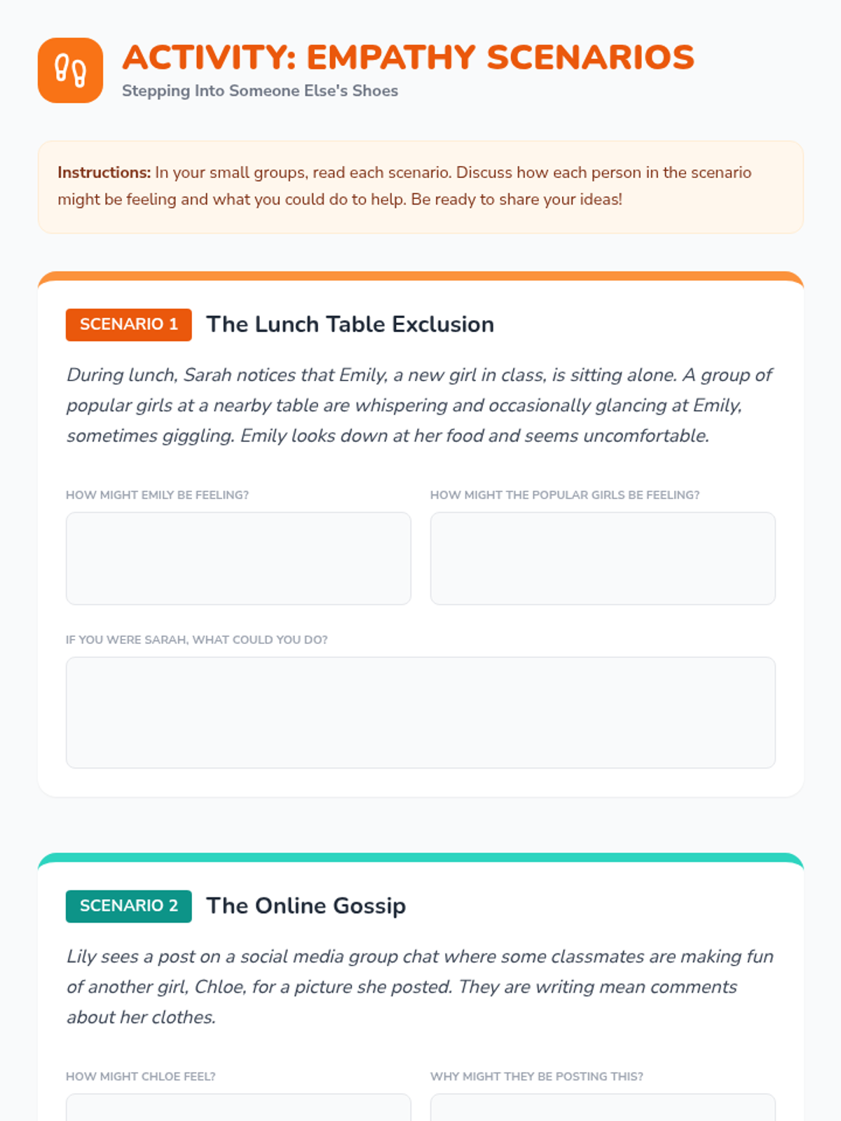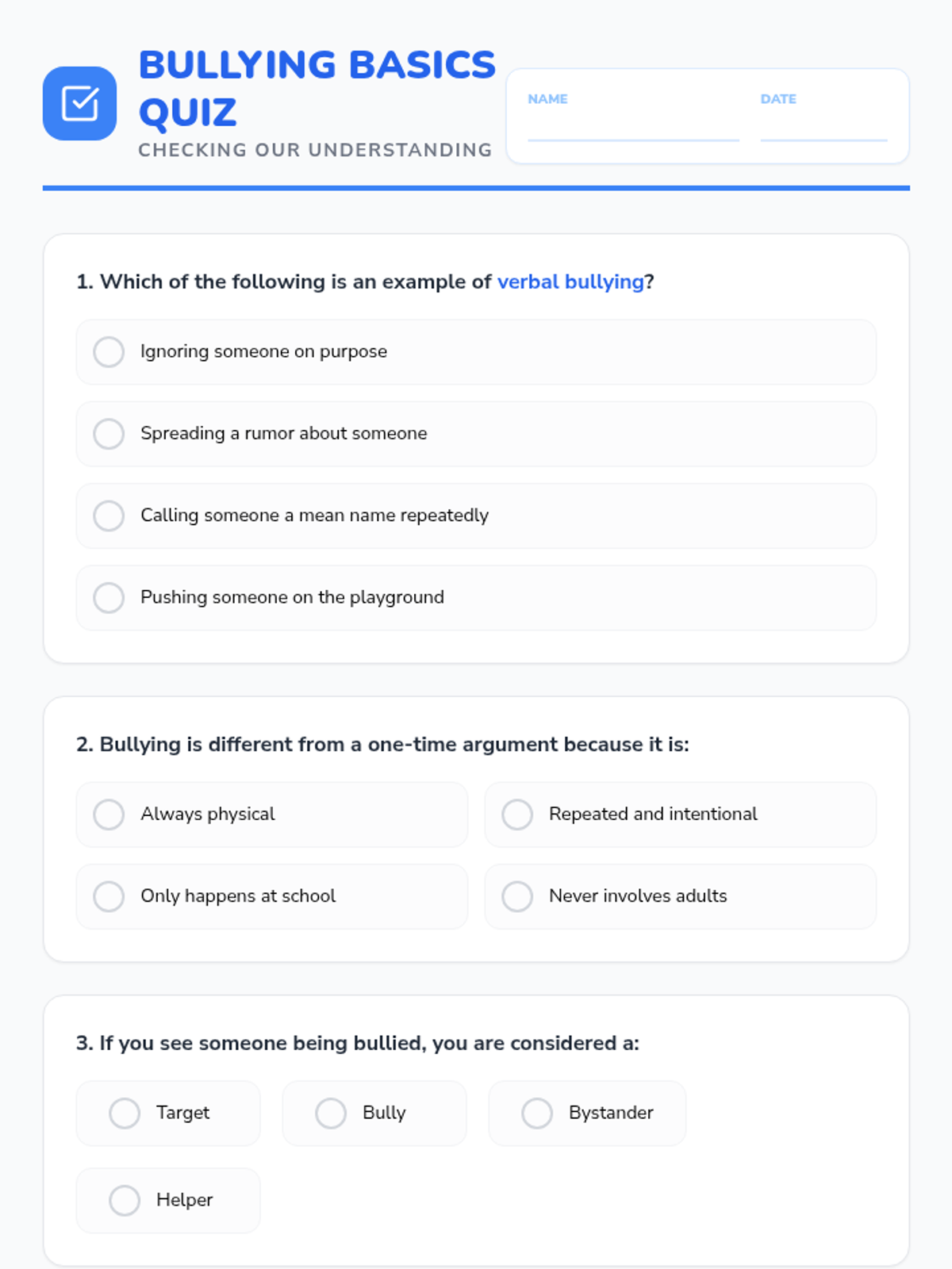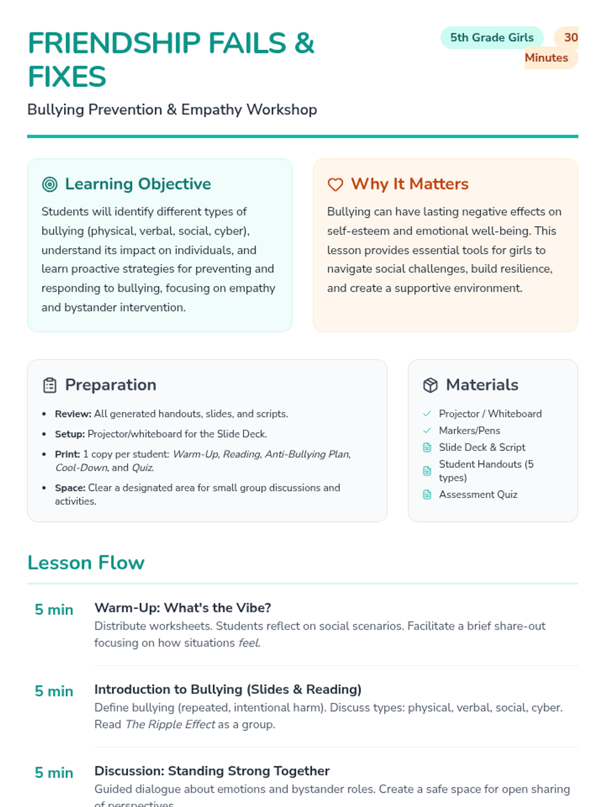 This lesson helps 5th-grade girls understand different types of bullying, its impact, and strategies for prevention and intervention. It focuses on fostering empathy and promoting positive social interactions within a small group setting.