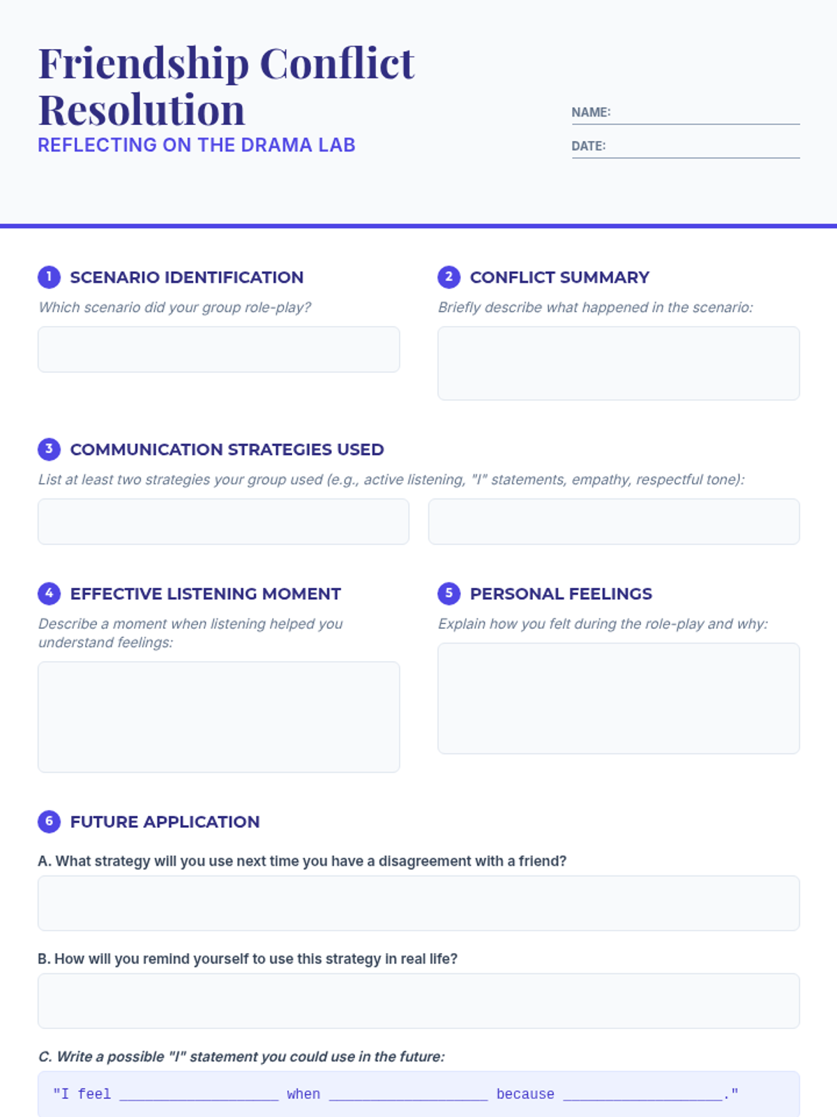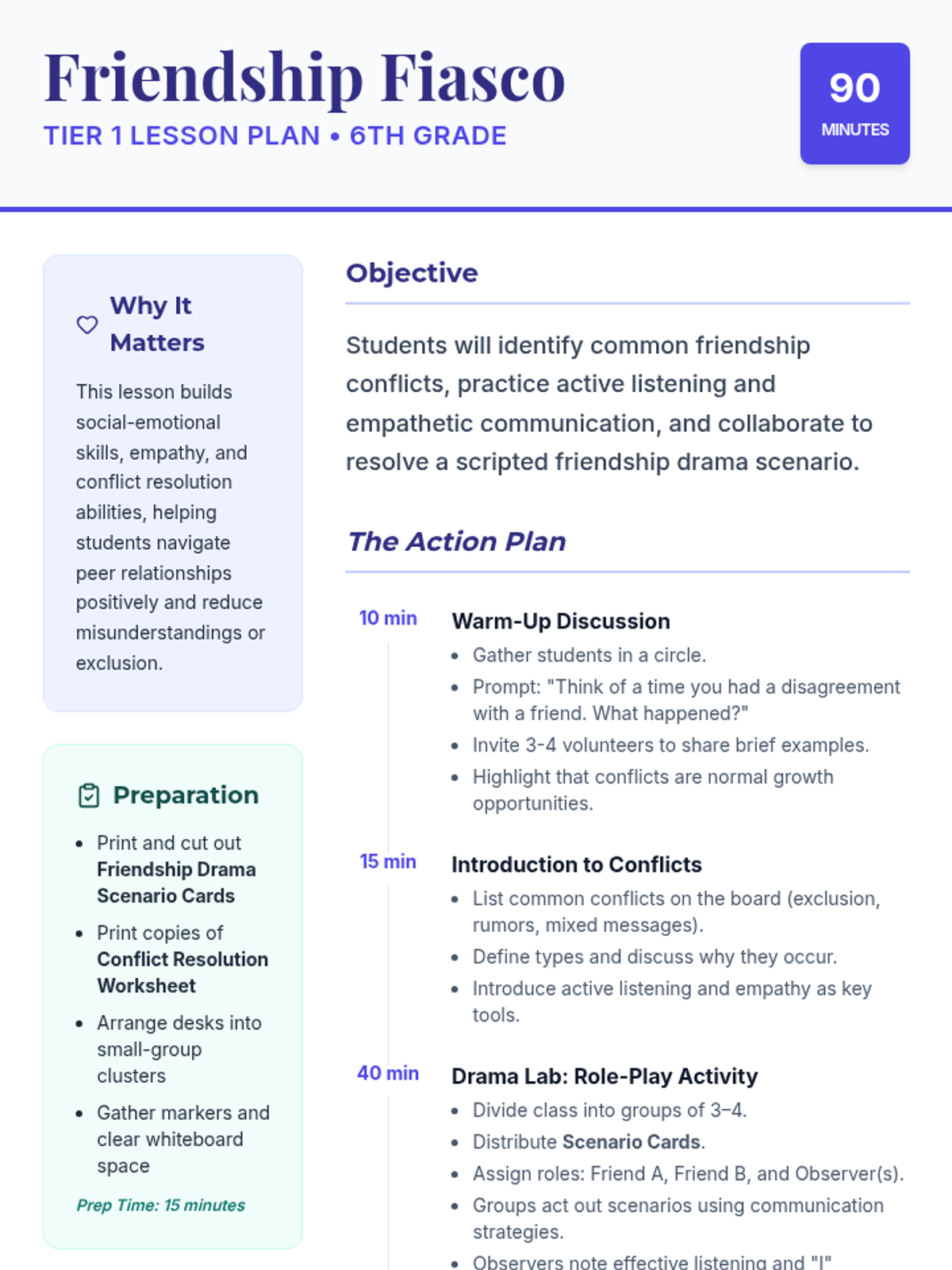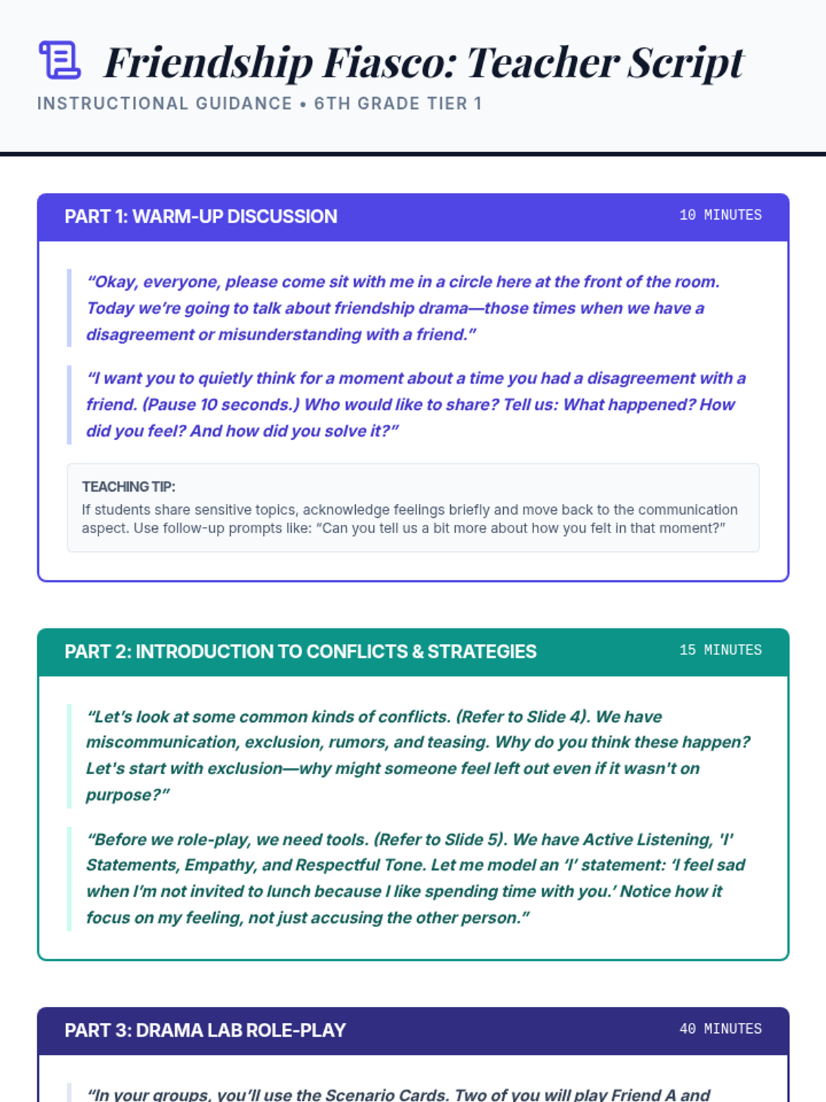 A 90-minute Tier 1 SEL lesson for 6th graders focused on identifying friendship conflicts, practicing active listening, and using 'I' statements through dramatic role-play scenarios.