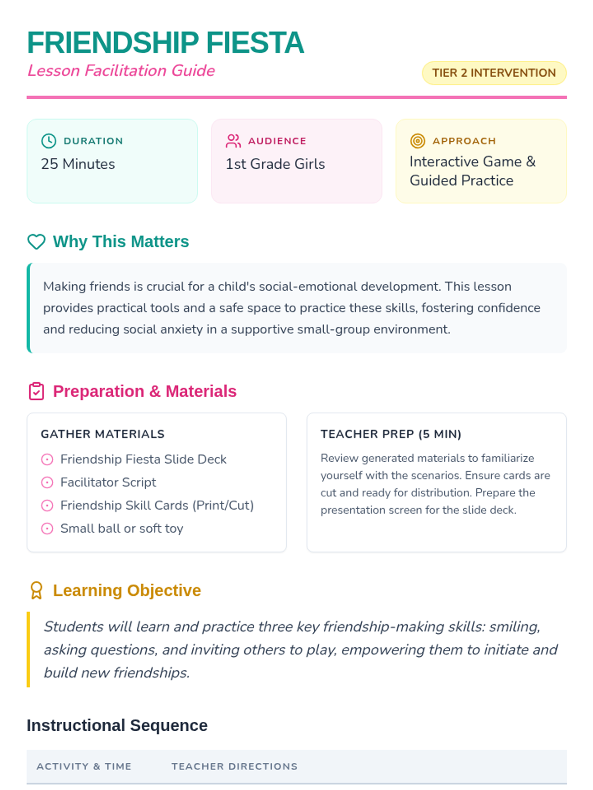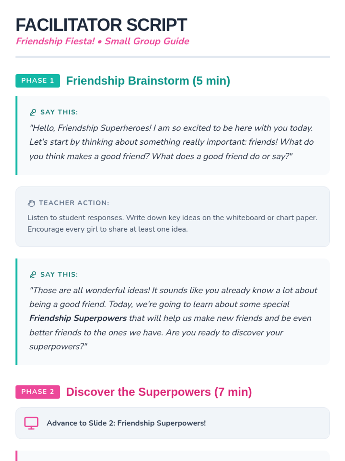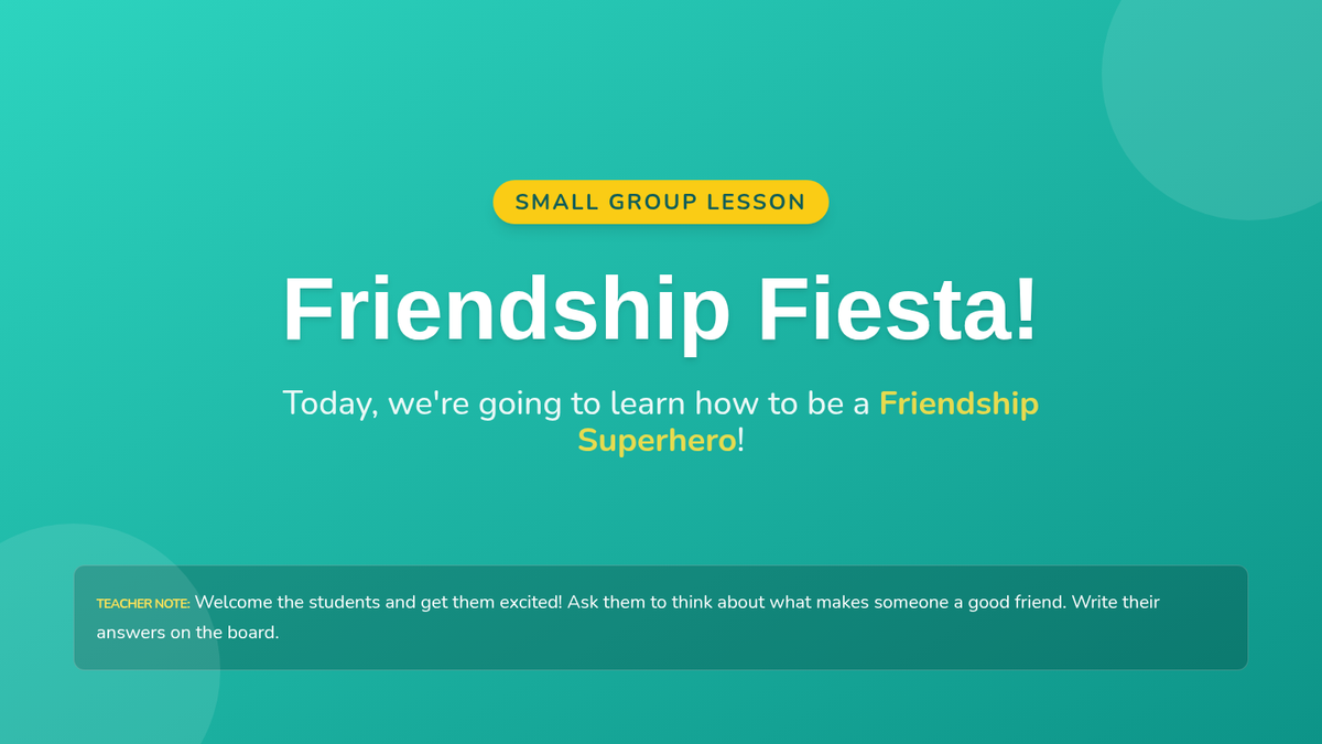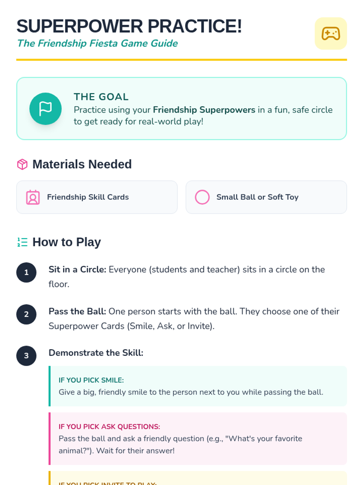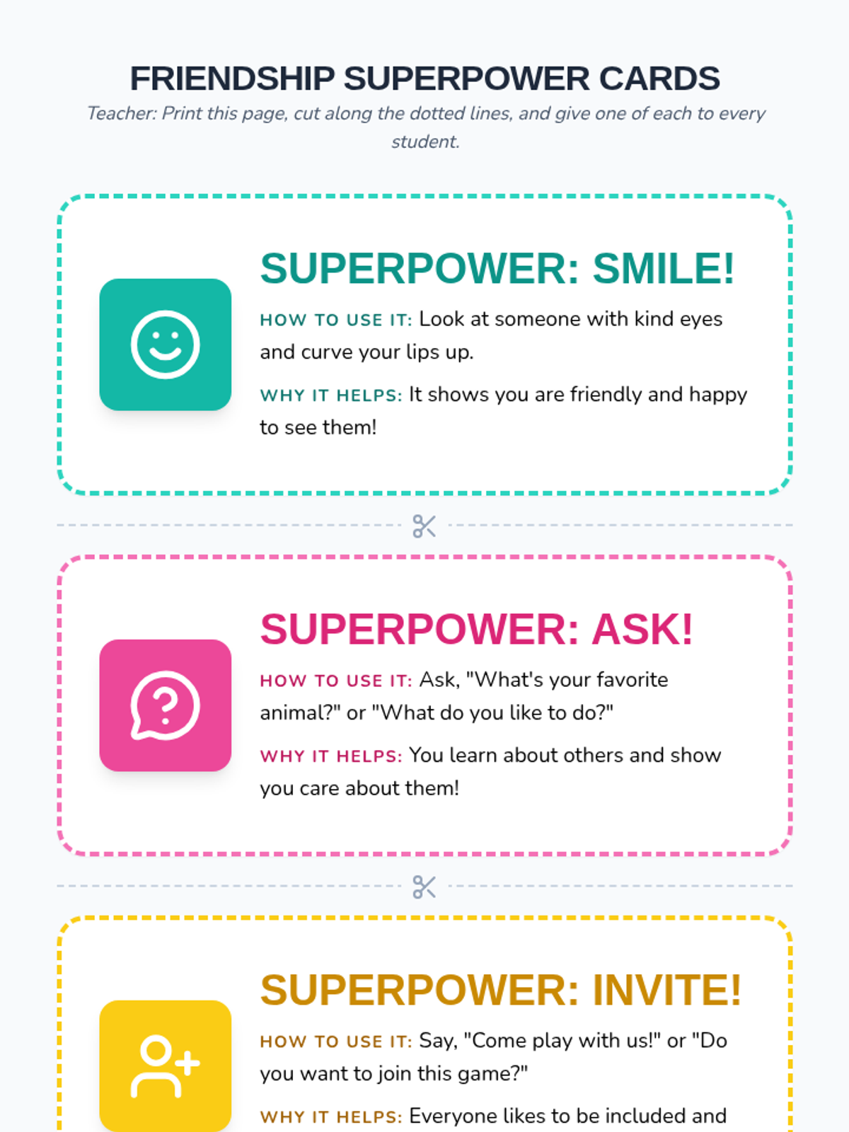 A 25-minute small-group lesson for 1st-grade girls focusing on three key 'Friendship Superpowers': smiling, asking questions, and inviting others to play. Students will discover these skills through a visual presentation and practice them in an interactive circle game.