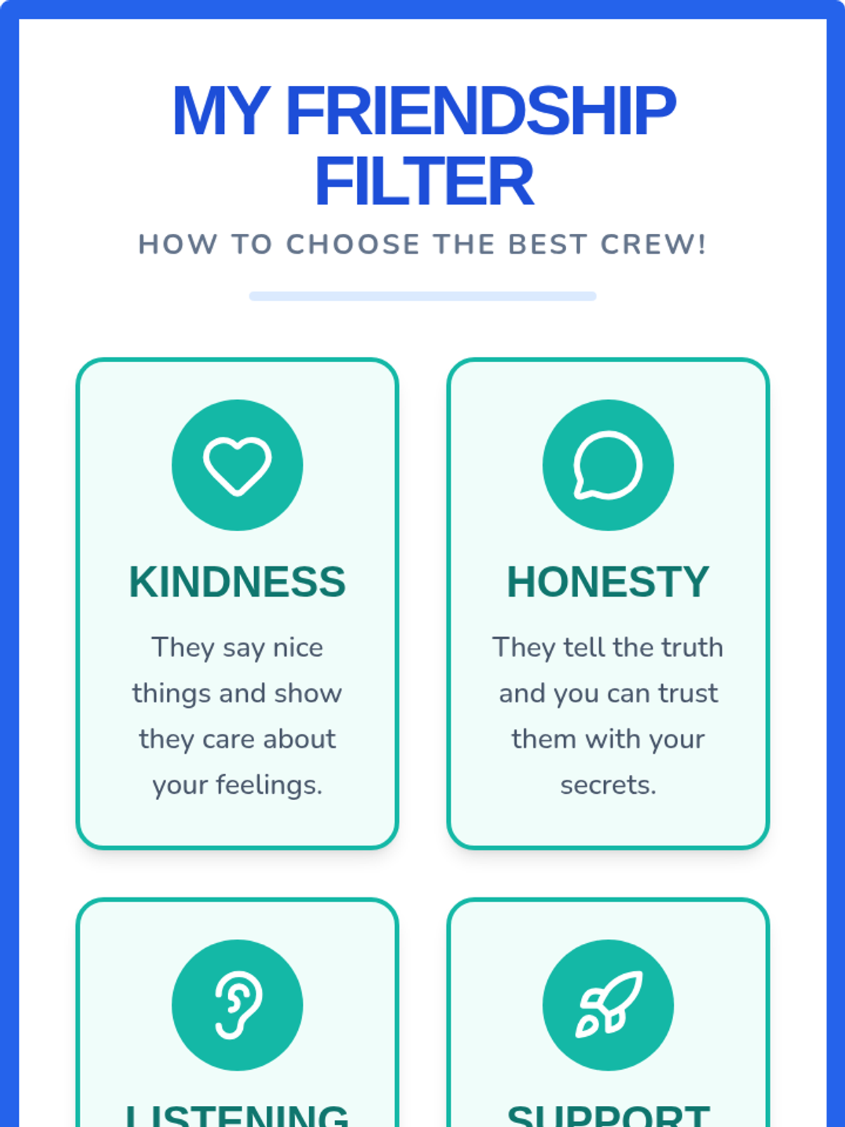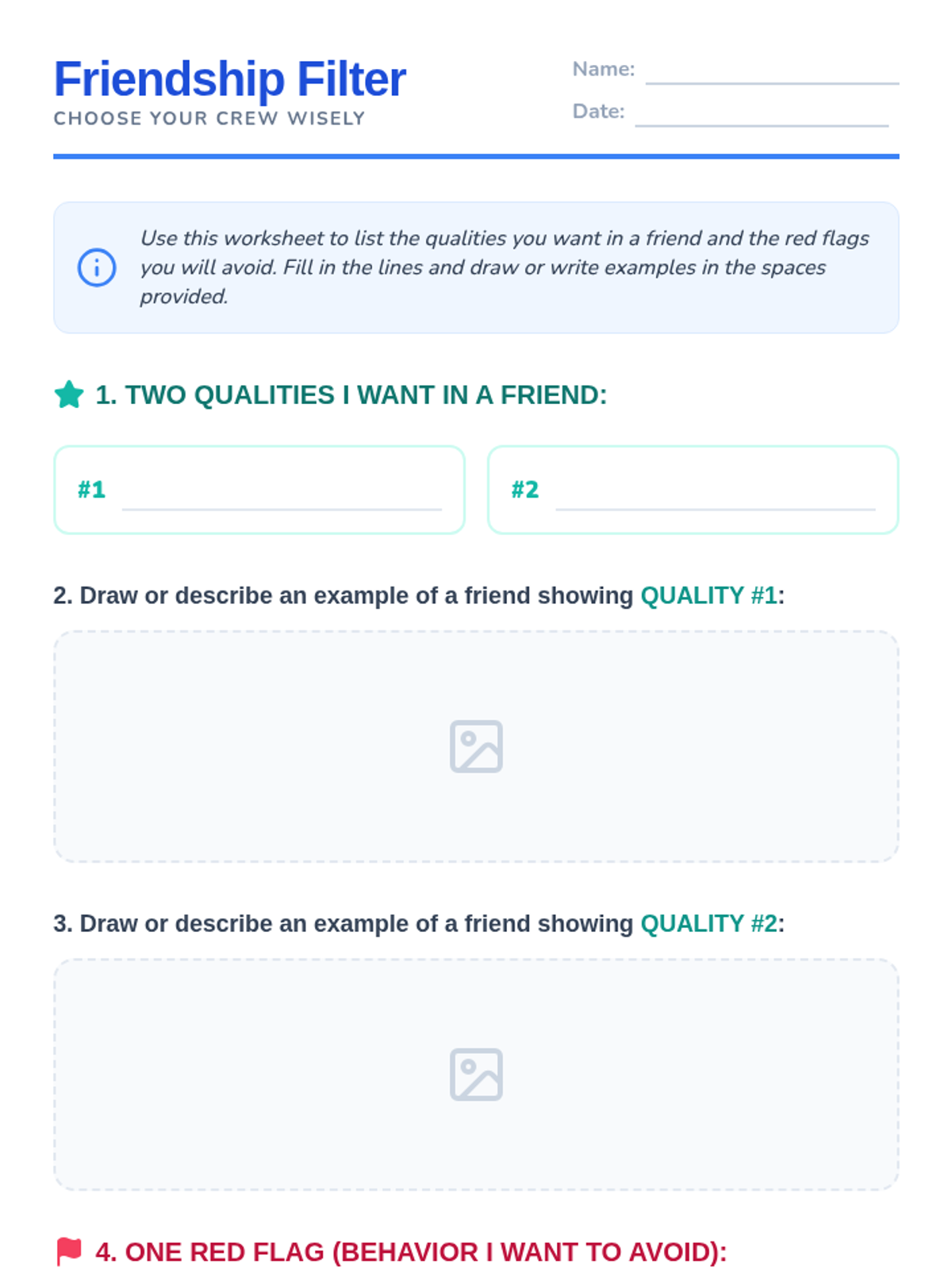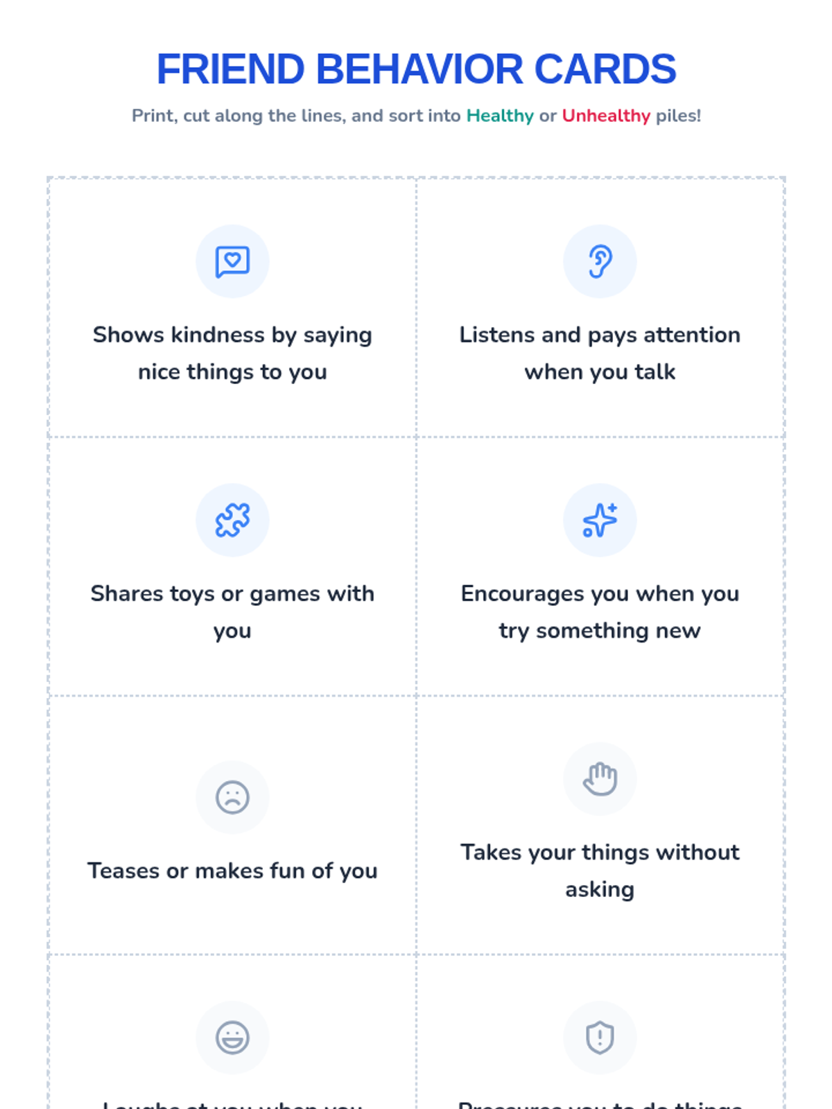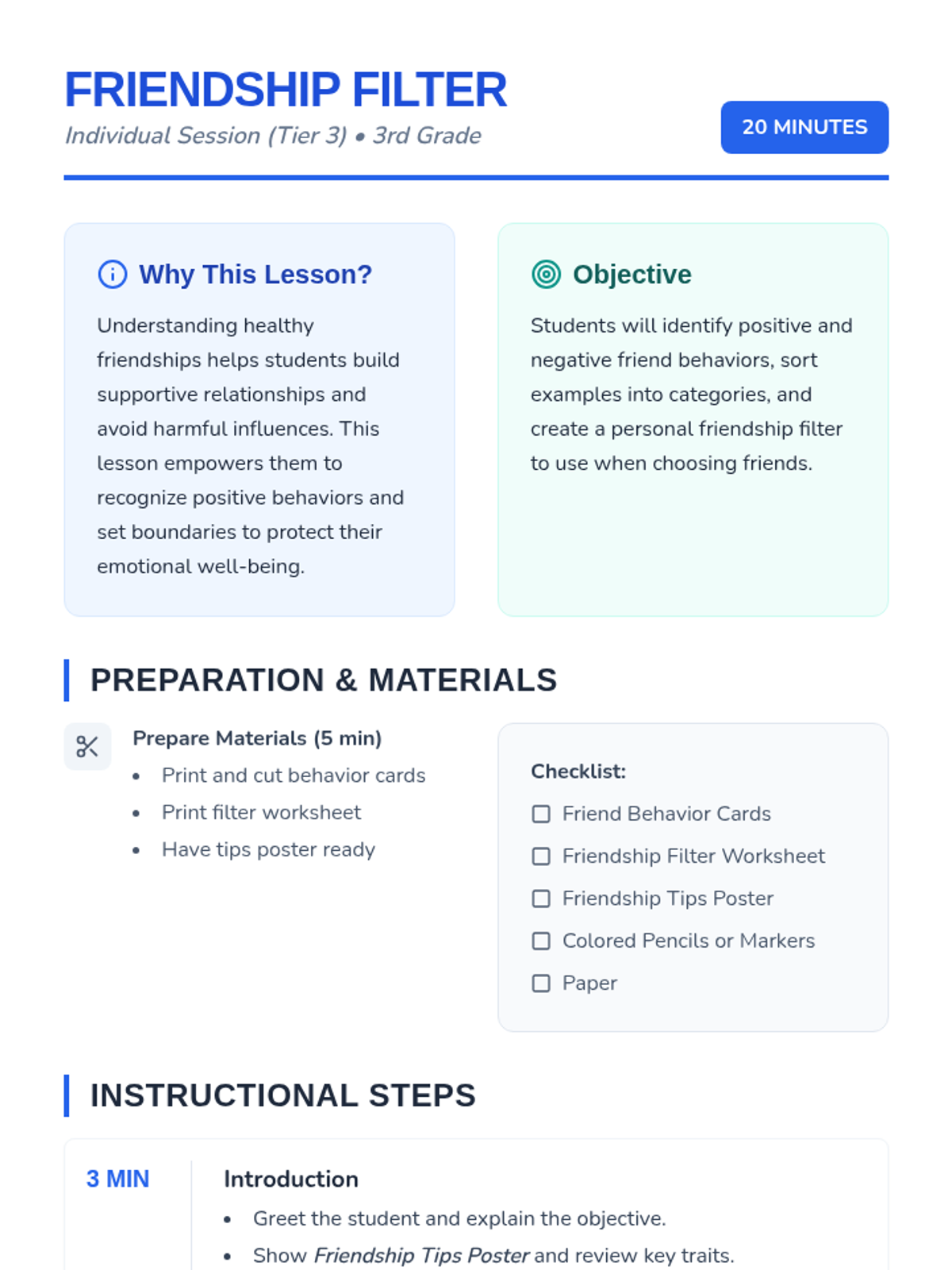 A 20-minute Tier 3 individual session for 3rd graders to learn to identify healthy vs. unhealthy friendship behaviors and create a personal 'filter' for choosing friends.