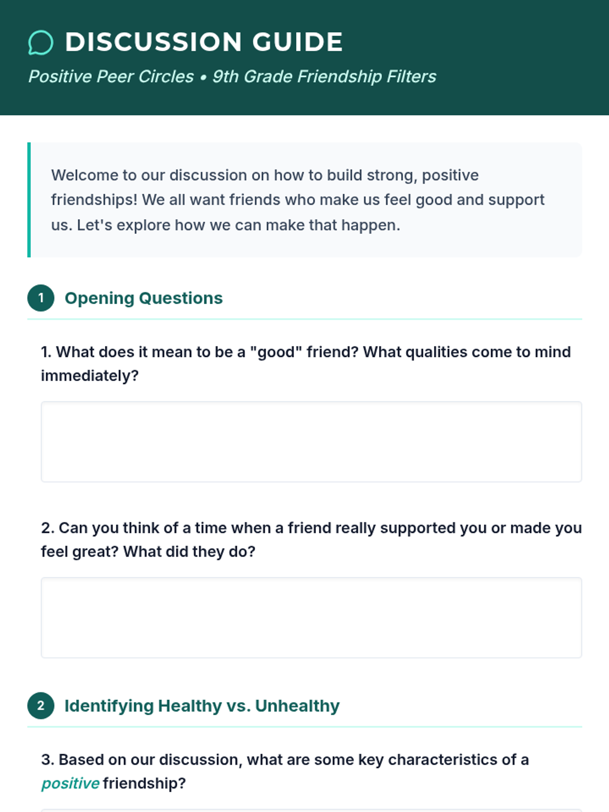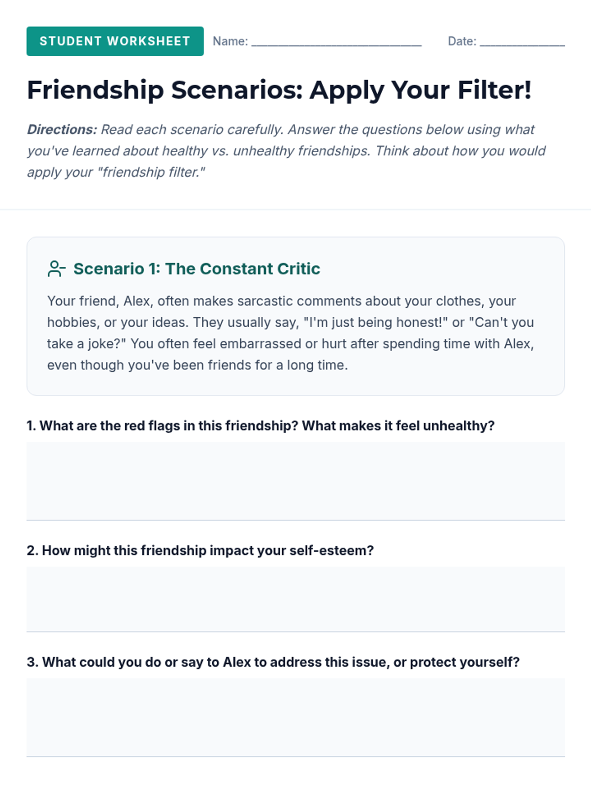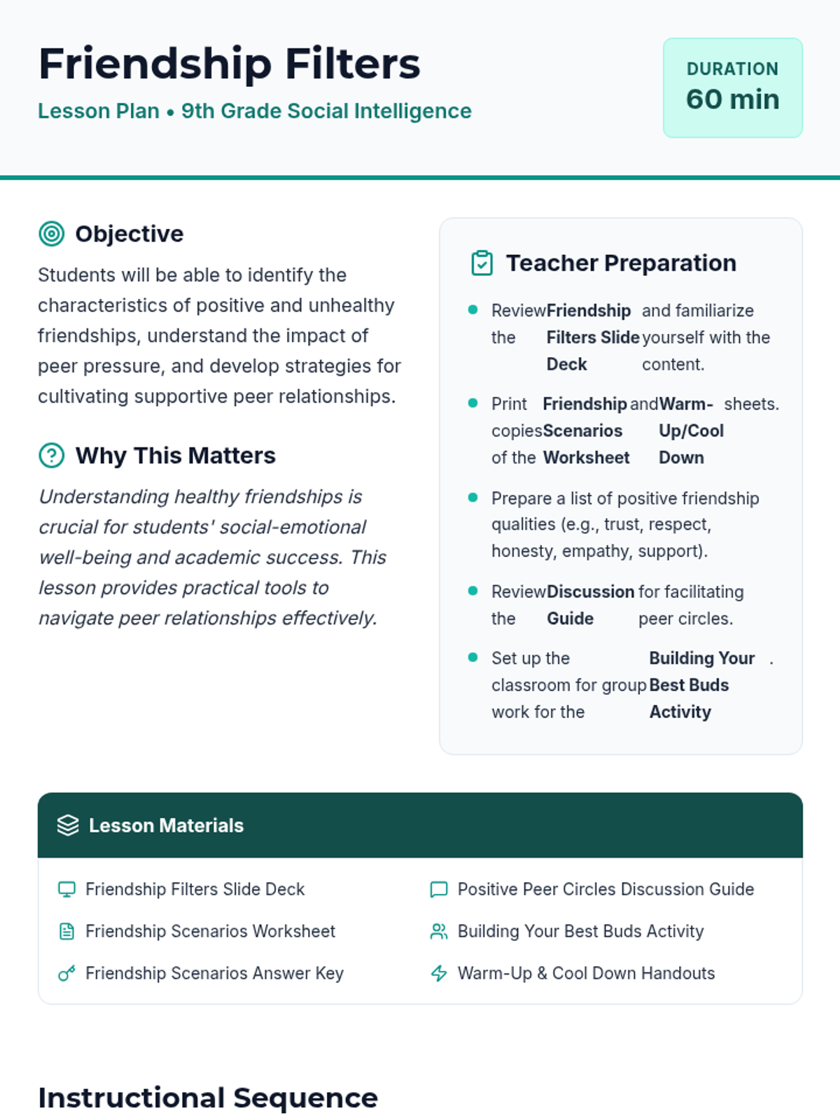 Empower 9th-grade students to critically evaluate their friendships and learn how to foster healthy, supportive peer relationships while recognizing and disengaging from unhealthy ones. This lesson utilizes discussion and scenario-based activities to enhance social intelligence and promote a positive peer environment.