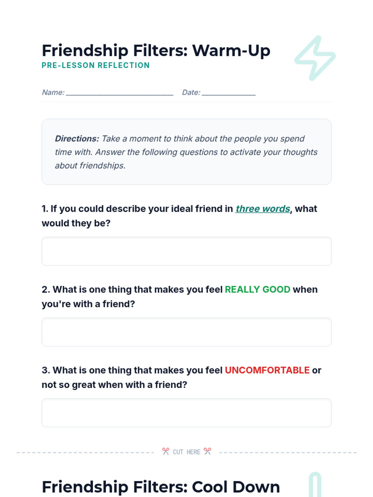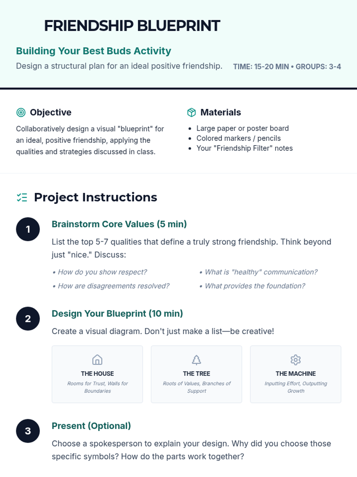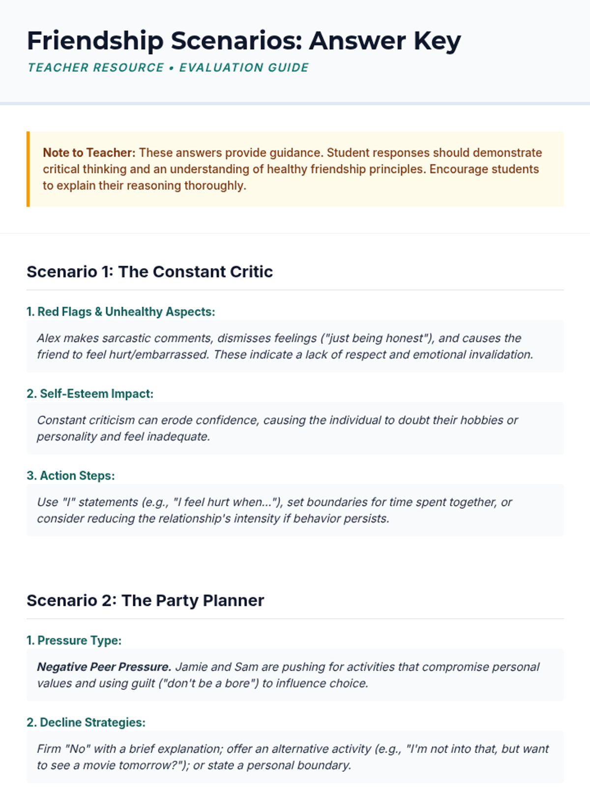 Empower 9th-grade students to critically evaluate their friendships and learn how to foster healthy, supportive peer relationships while recognizing and disengaging from unhealthy ones. This lesson utilizes discussion and scenario-based activities to enhance social intelligence and promote a positive peer environment.