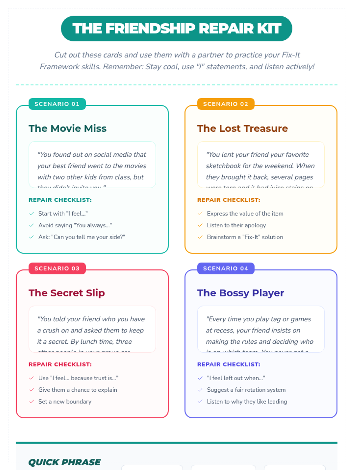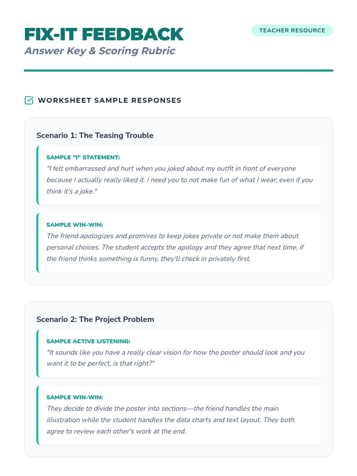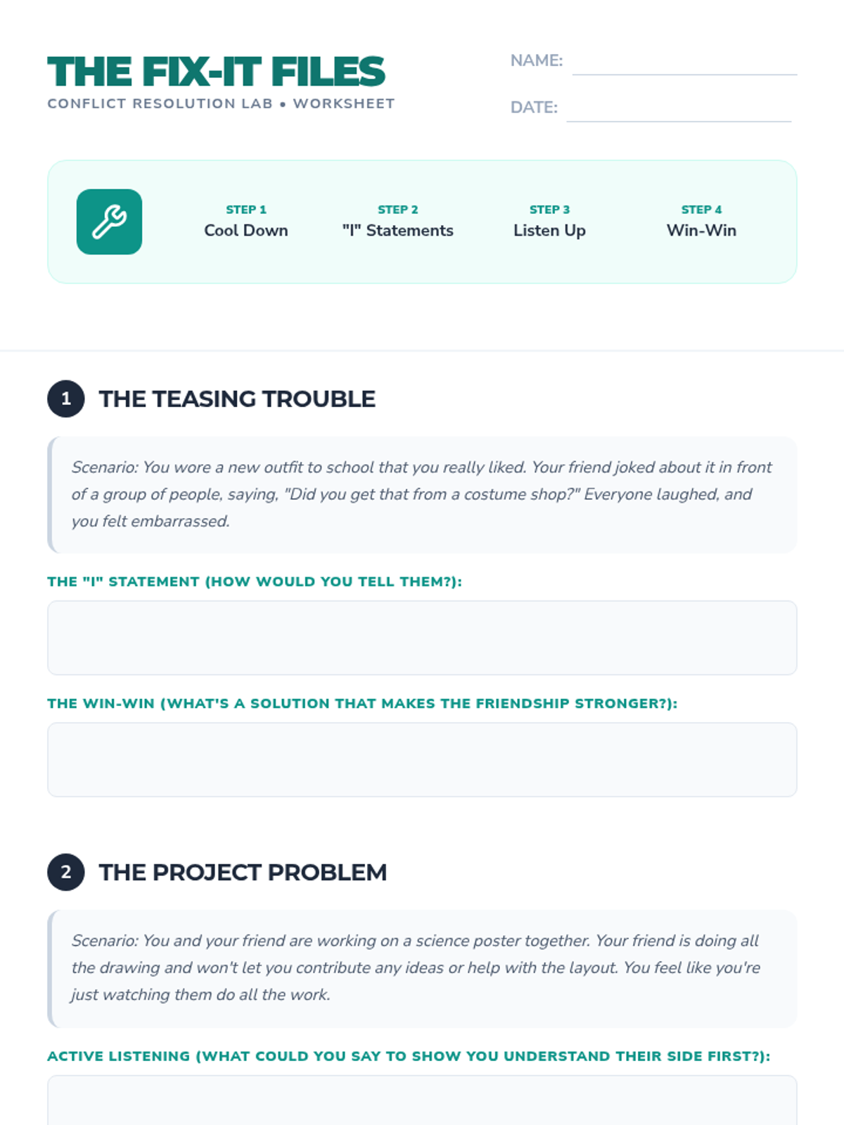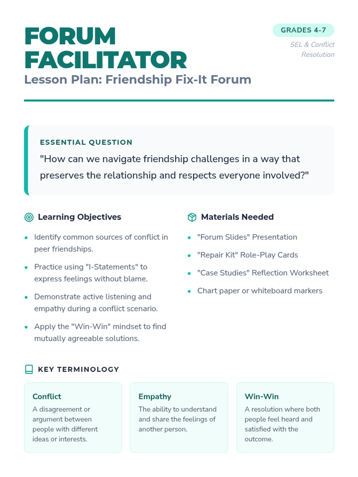 A comprehensive lesson for grades 4-7 on navigating friendship conflicts using empathy, clear communication, and win-win problem-solving strategies. Students engage with case studies and role-playing to build practical social-emotional skills.
