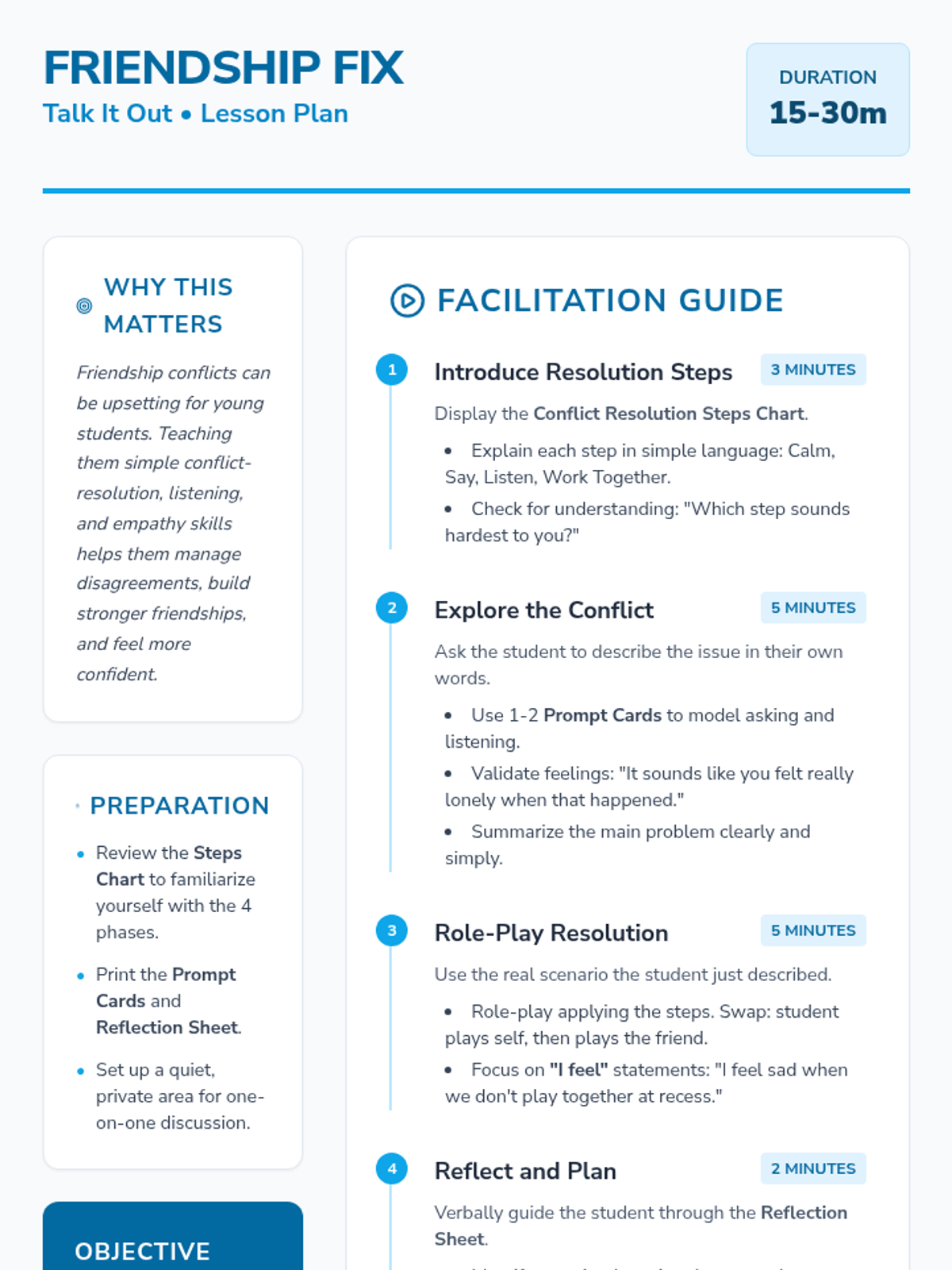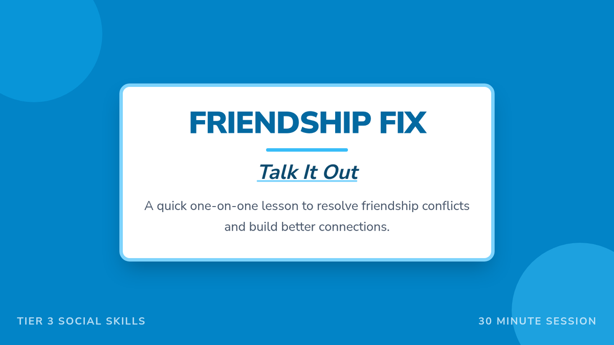 A focused, one-on-one Tier 3 lesson designed to help students navigate friendship conflicts using active listening, 'I' statements, and collaborative problem-solving.