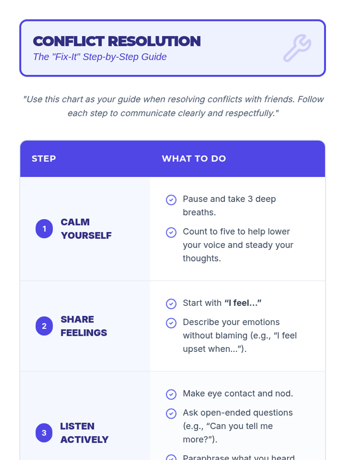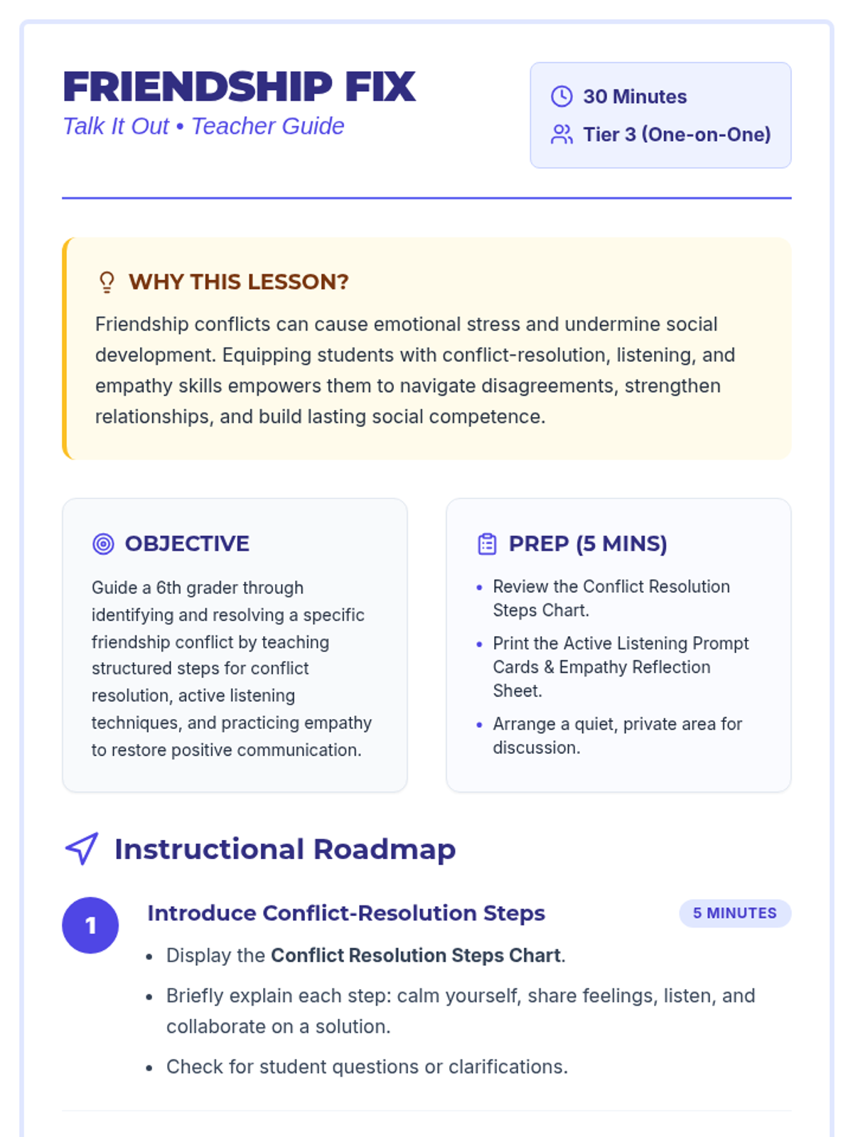 A 30-minute Tier 3 one-on-one lesson for 6th graders to navigate friendship conflicts using active listening and empathy.