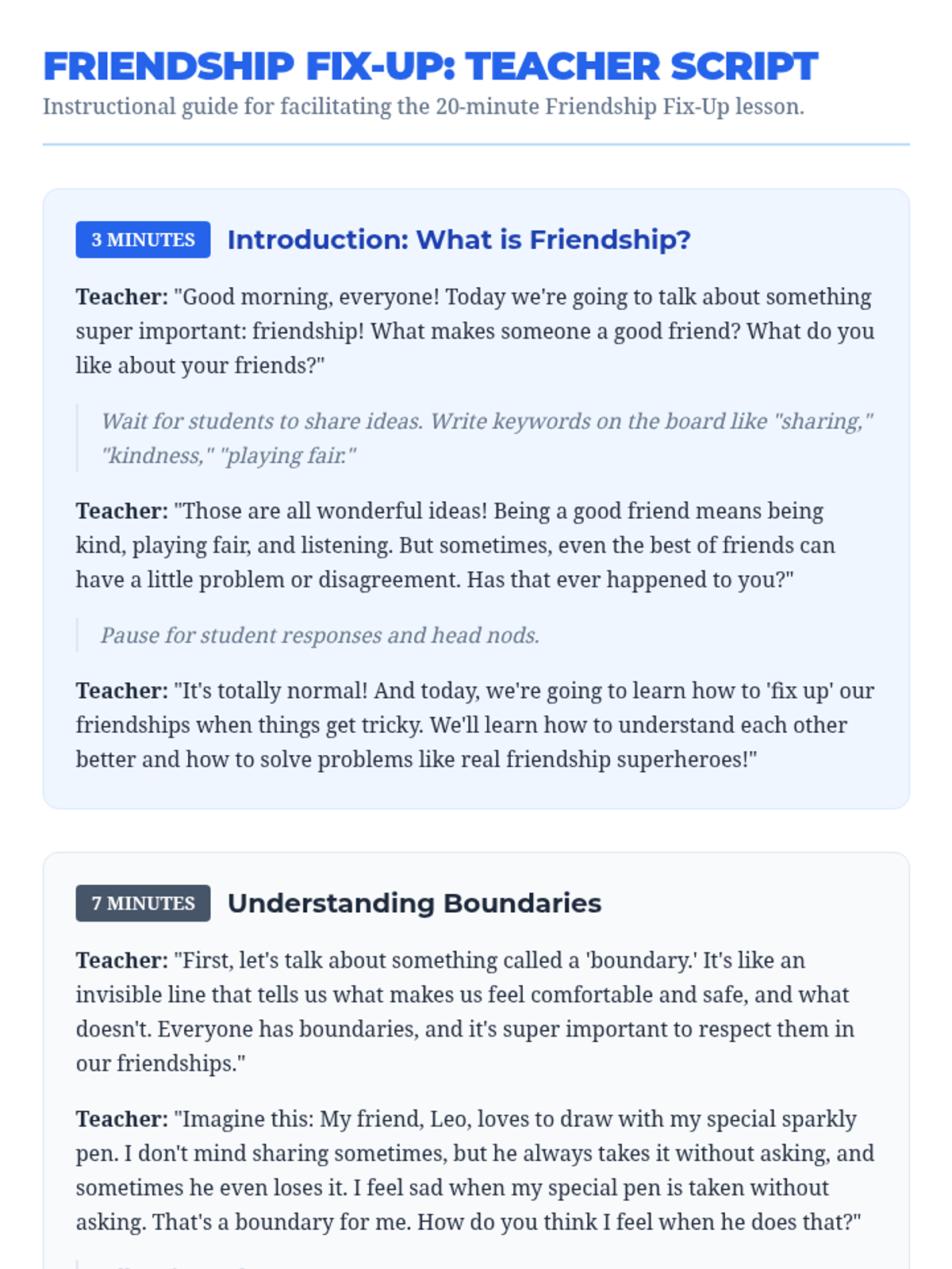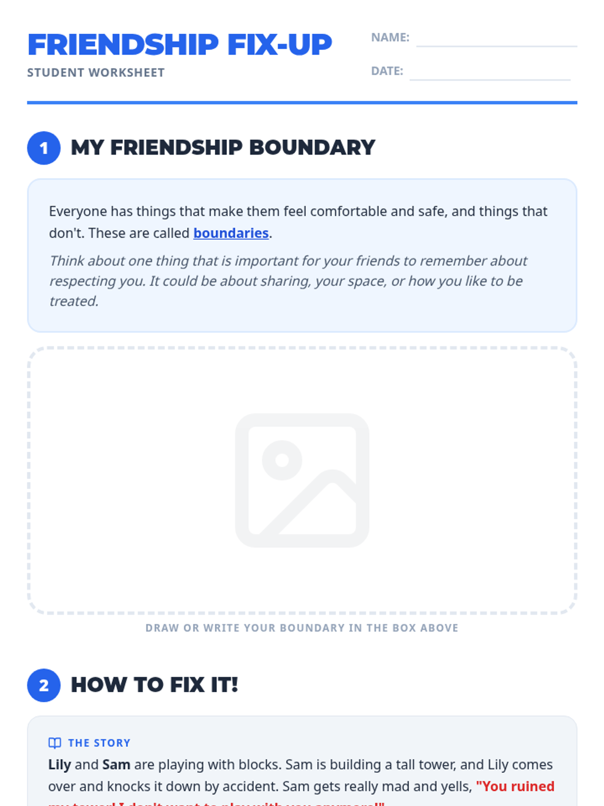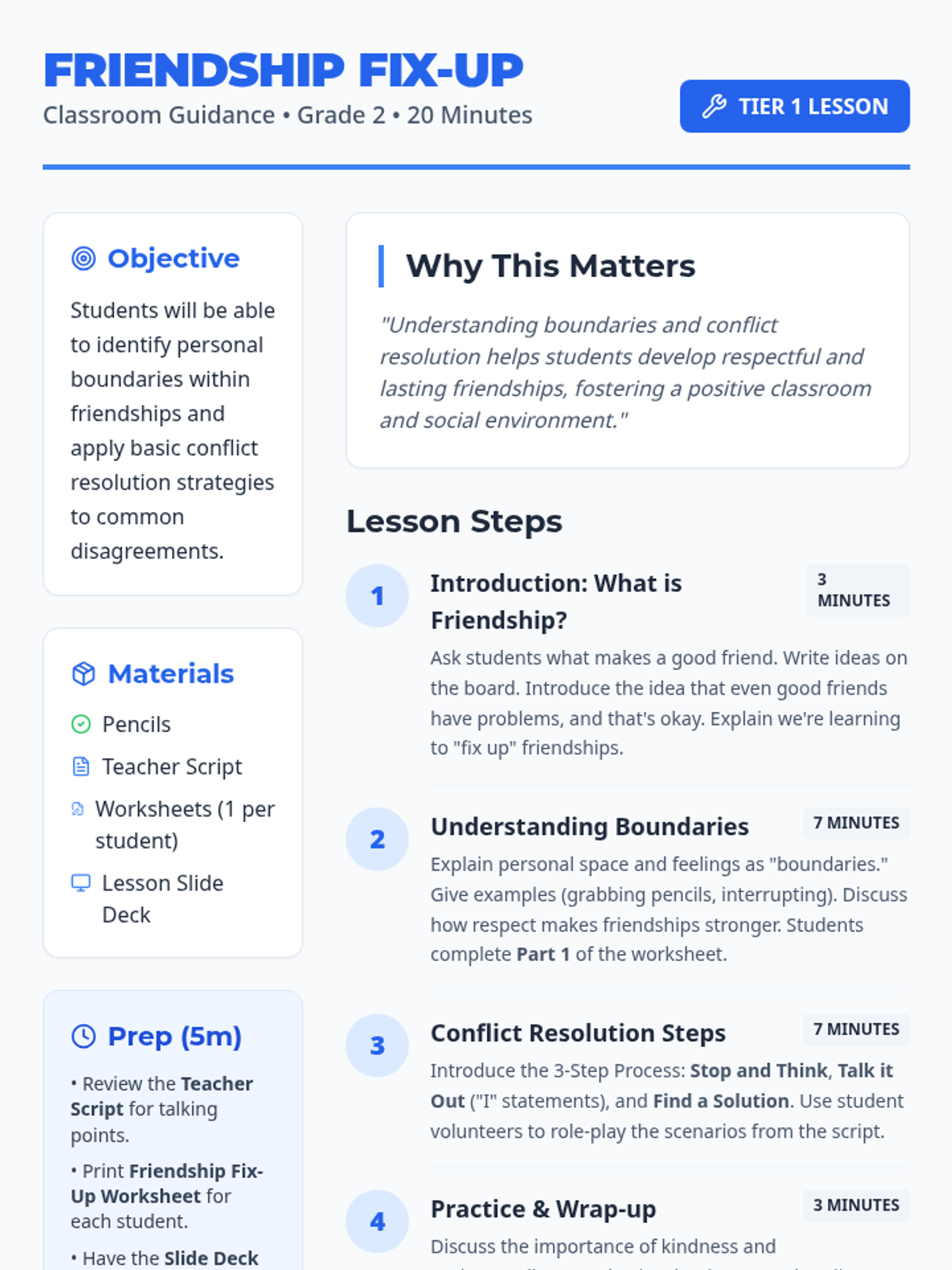 A 20-minute lesson for 2nd graders to learn about setting personal boundaries and using a three-step process to resolve friendship conflicts.