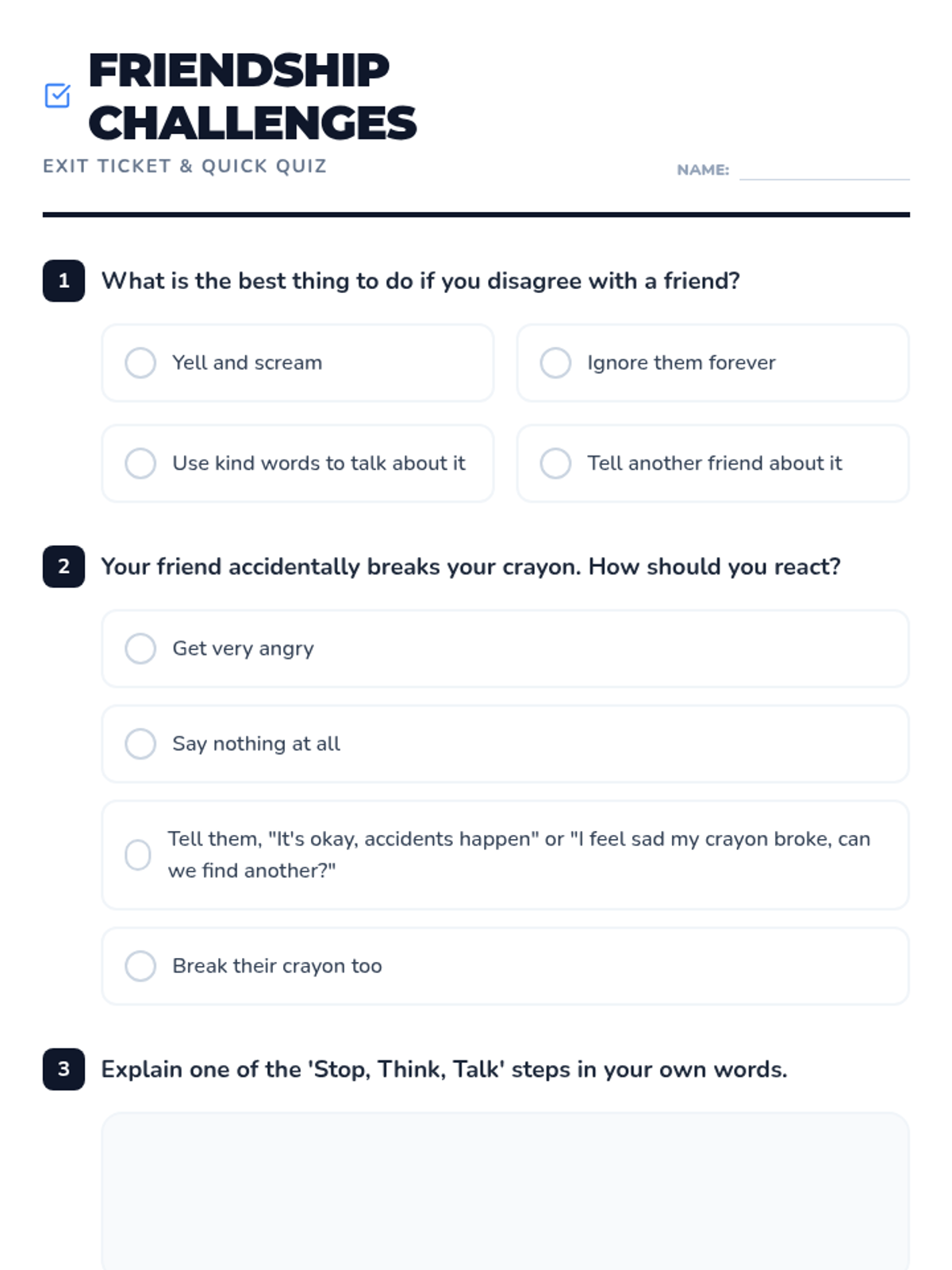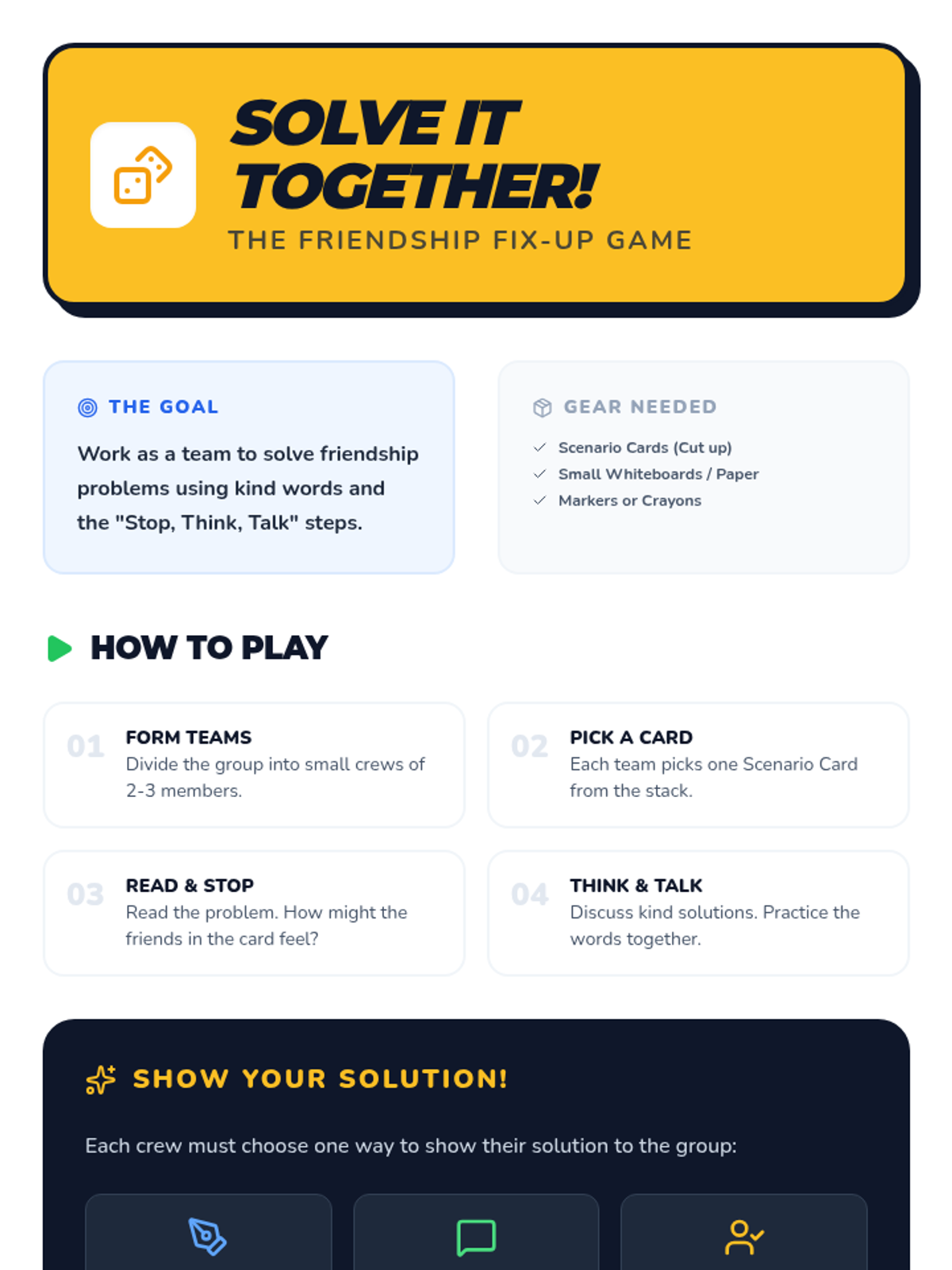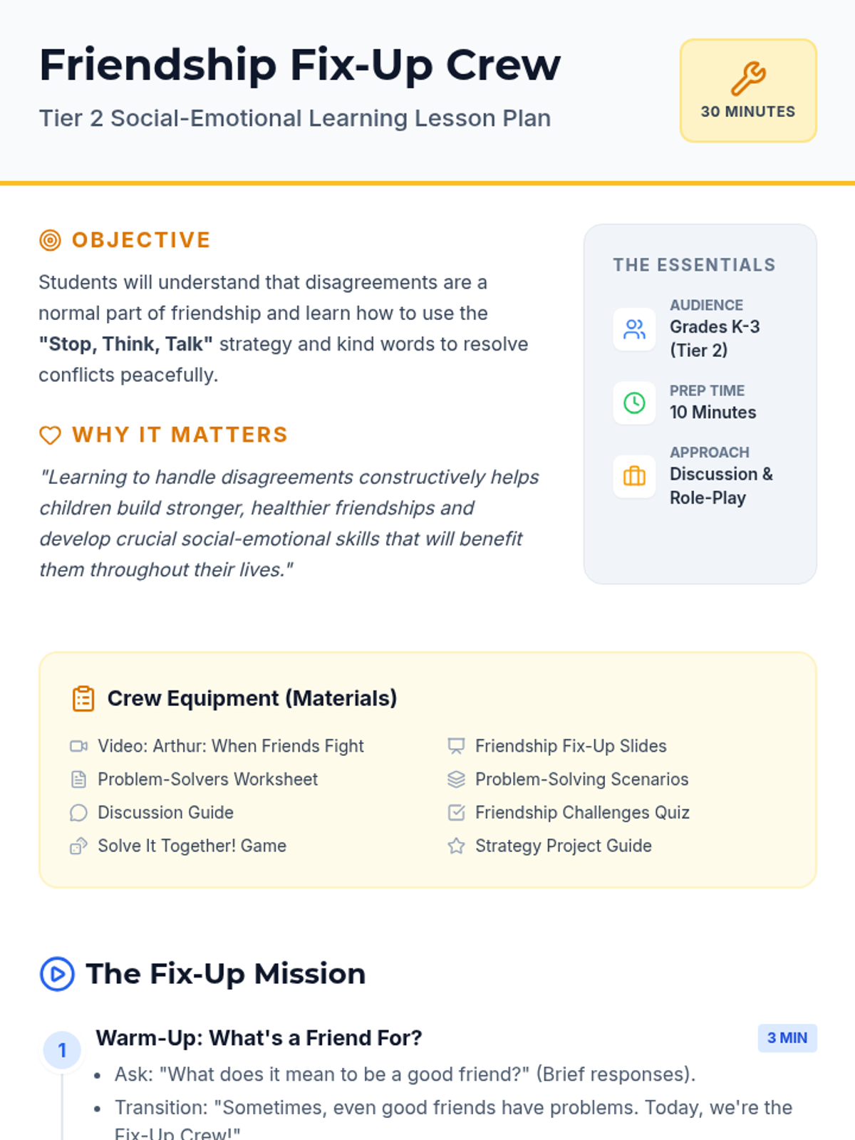 A 30-minute Tier 2 small group lesson for K-3 students focused on resolving friendship conflicts using the 'Stop, Think, Talk' strategy. Students explore empathy and kind communication through video, discussion, and role-play.