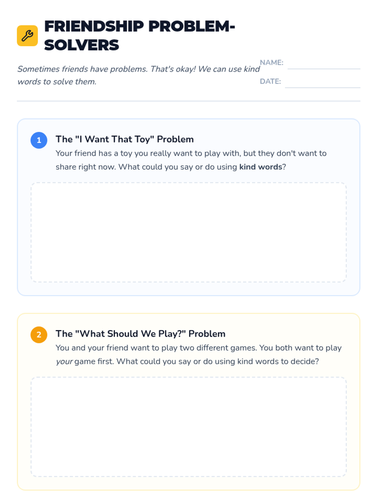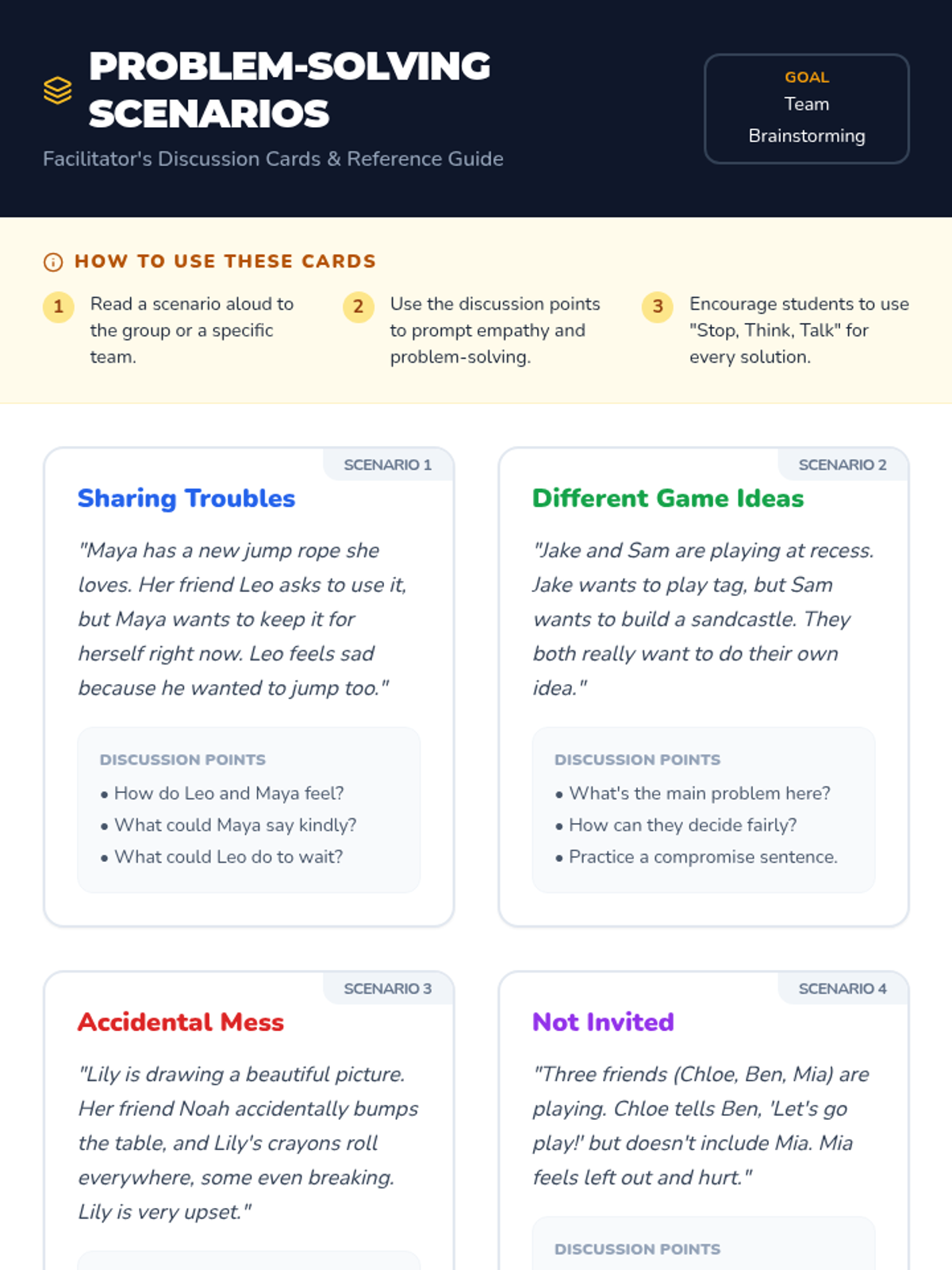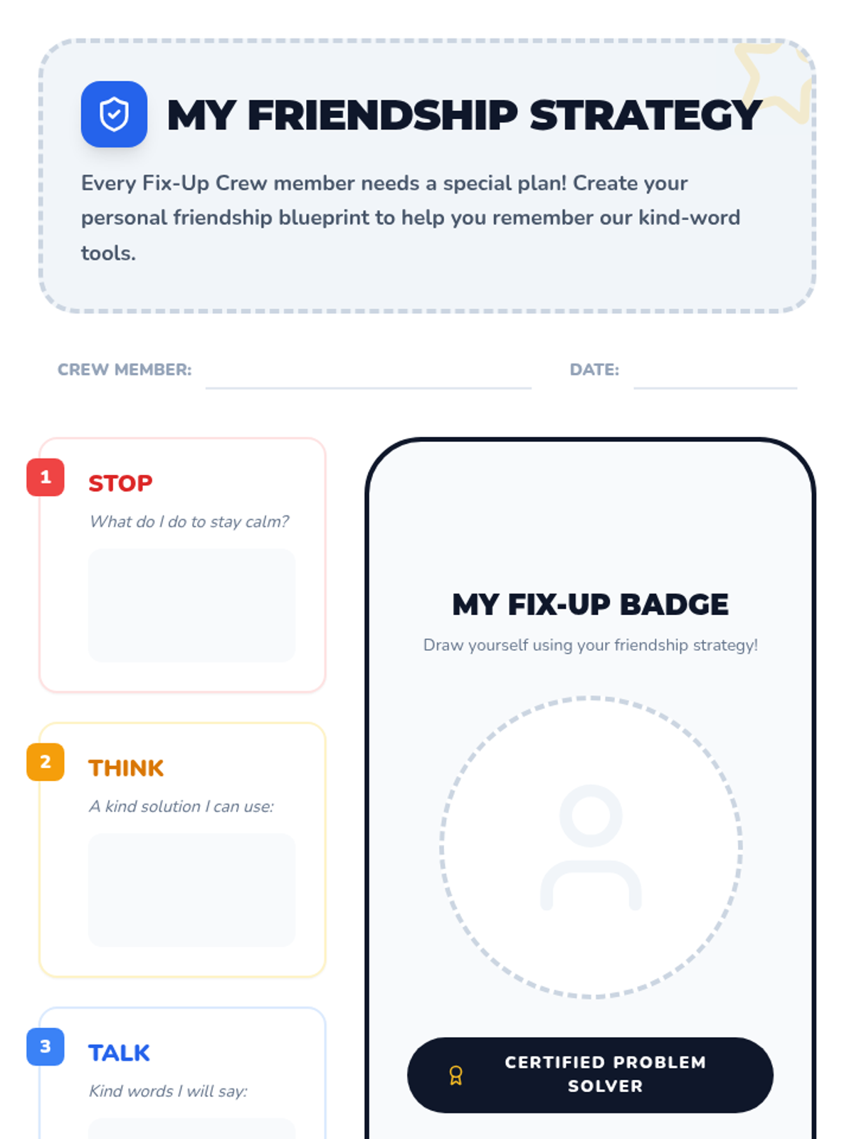 A 30-minute Tier 2 small group lesson for K-3 students focused on resolving friendship conflicts using the 'Stop, Think, Talk' strategy. Students explore empathy and kind communication through video, discussion, and role-play.
