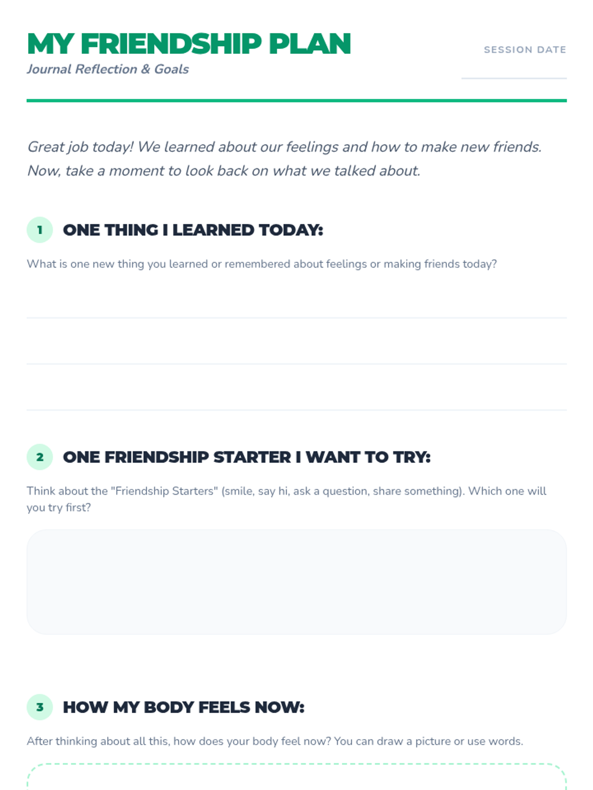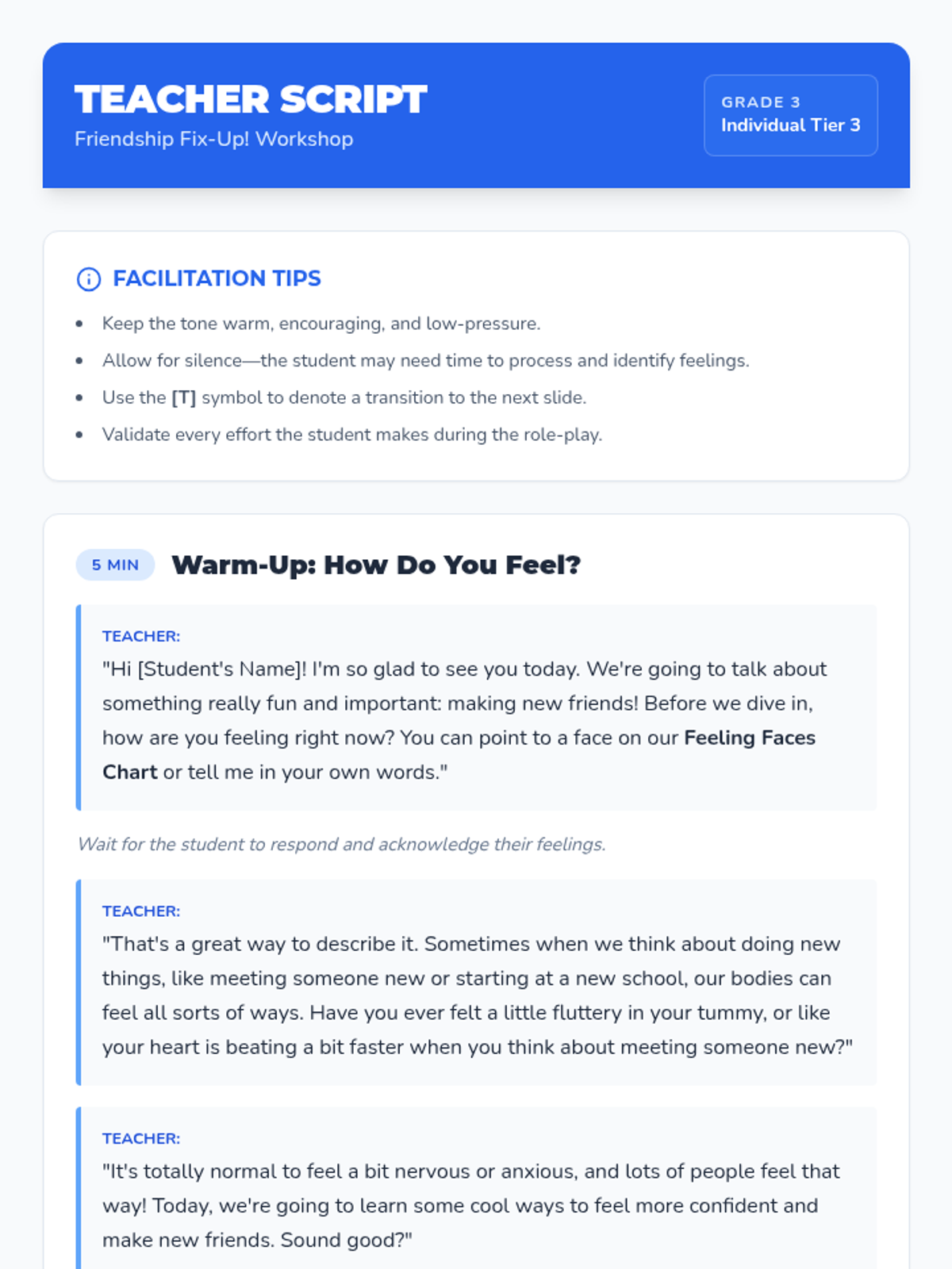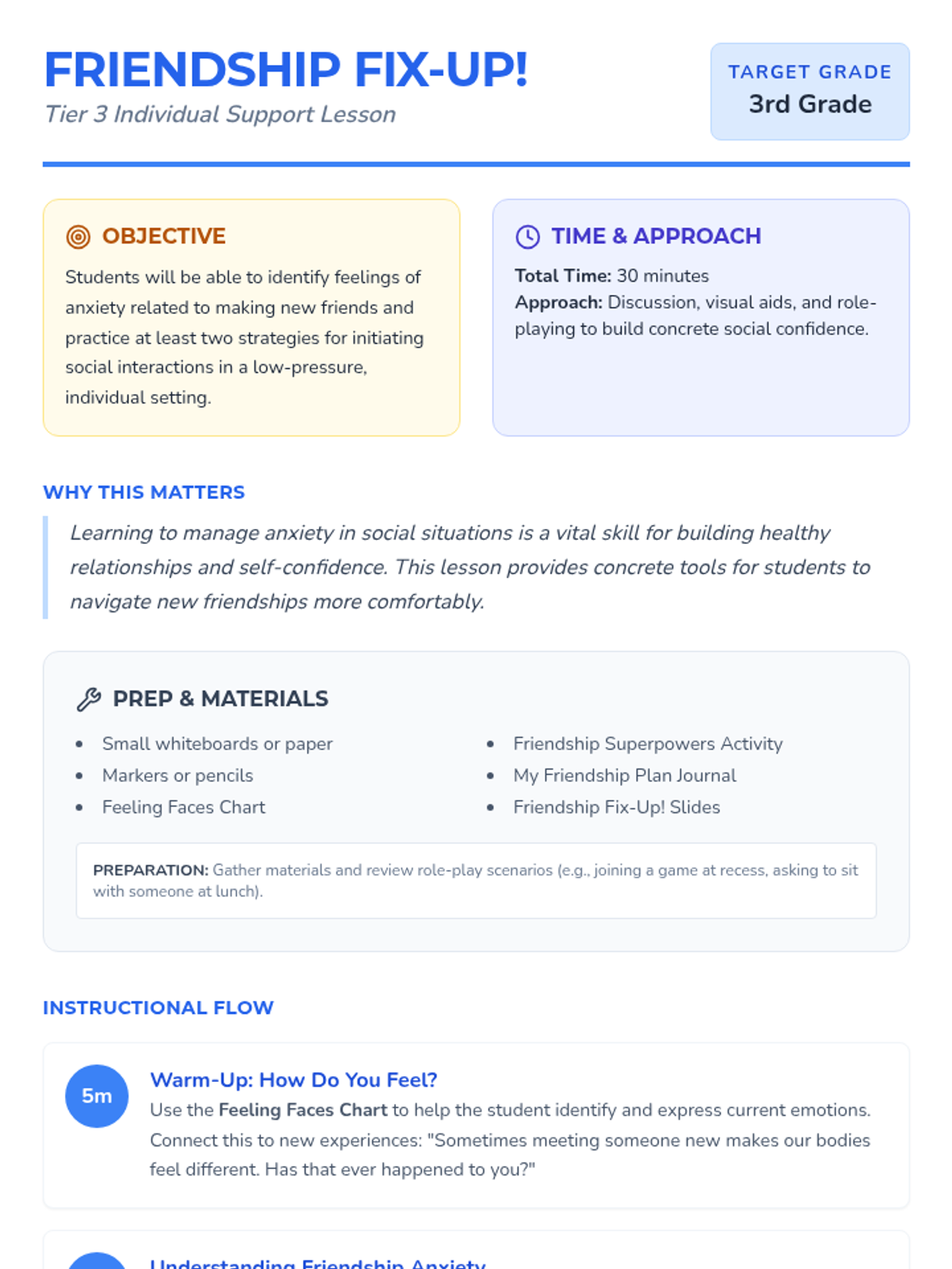 A Tier 3 individual lesson for 3rd graders focused on identifying social anxiety and practicing strategies to initiate positive peer interactions and build confidence.