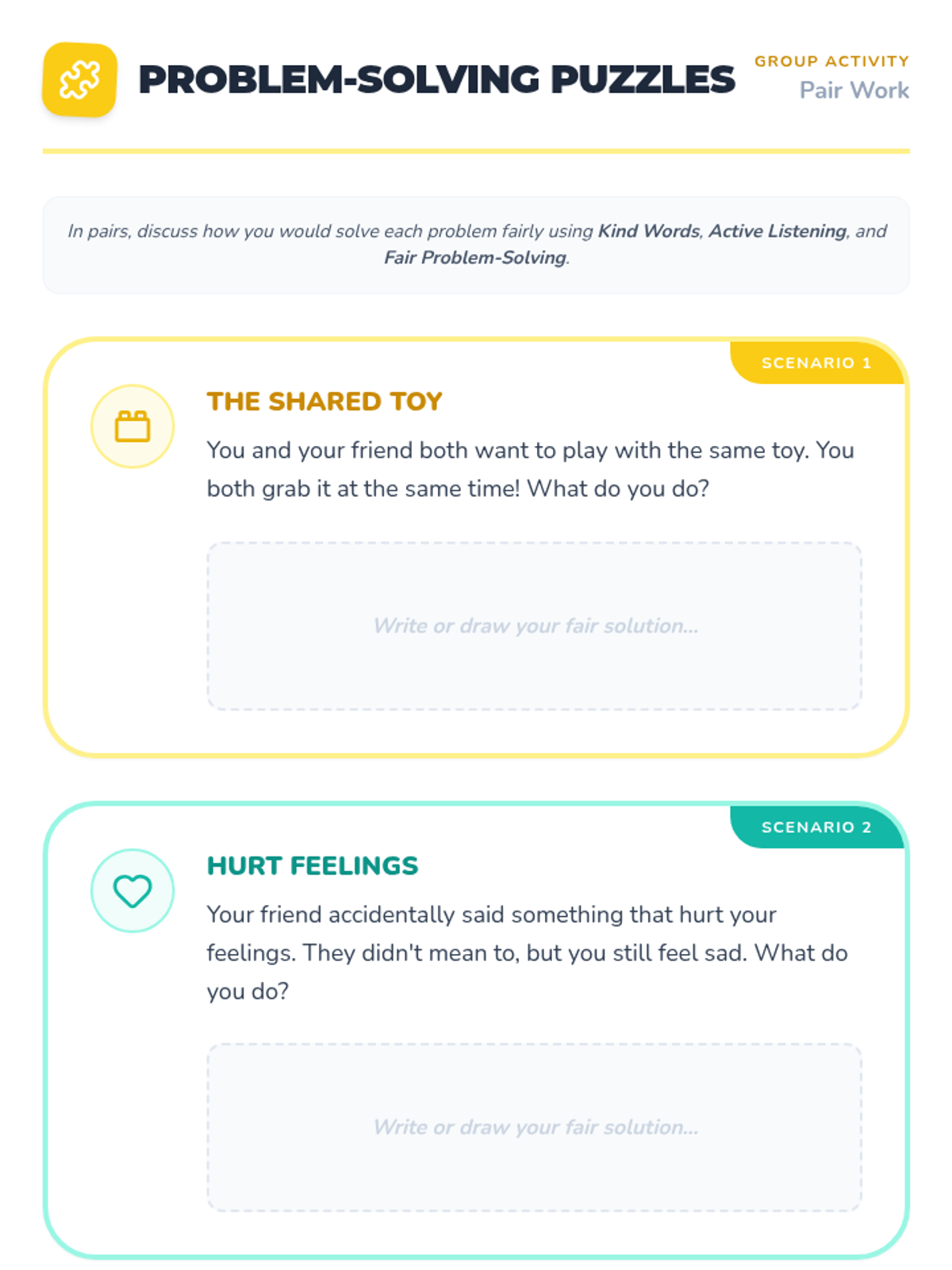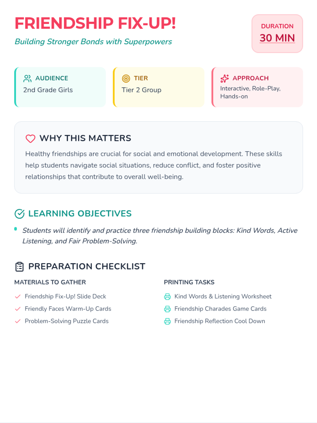 A Tier 2 counseling lesson for 2nd-grade girls focused on building healthy friendships through kind words, active listening, and fair problem-solving.