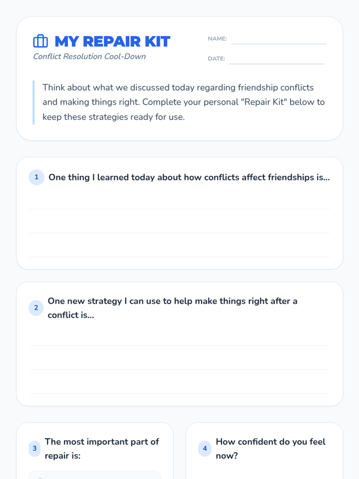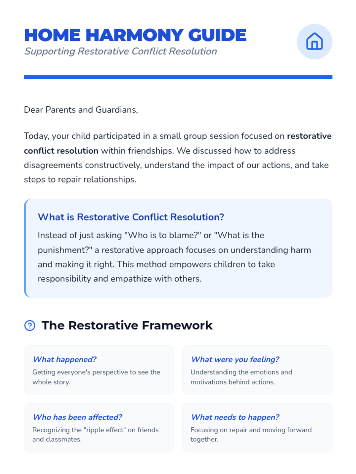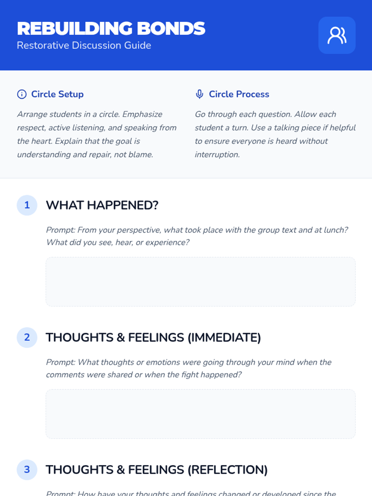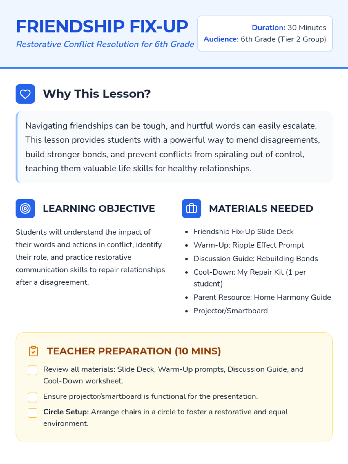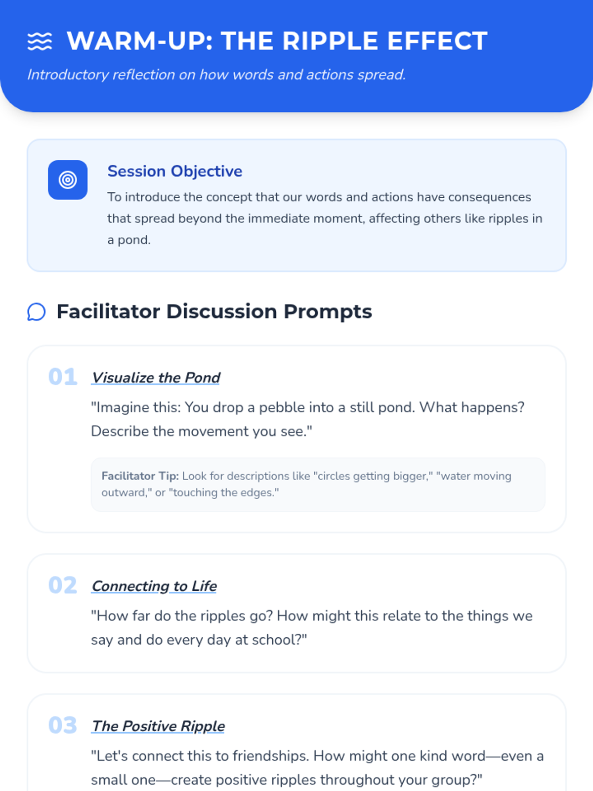 A 30-minute small group counseling session for 6th graders focused on restorative conflict resolution. Students explore the 'ripple effect' of their actions and learn to repair harm using restorative questions.