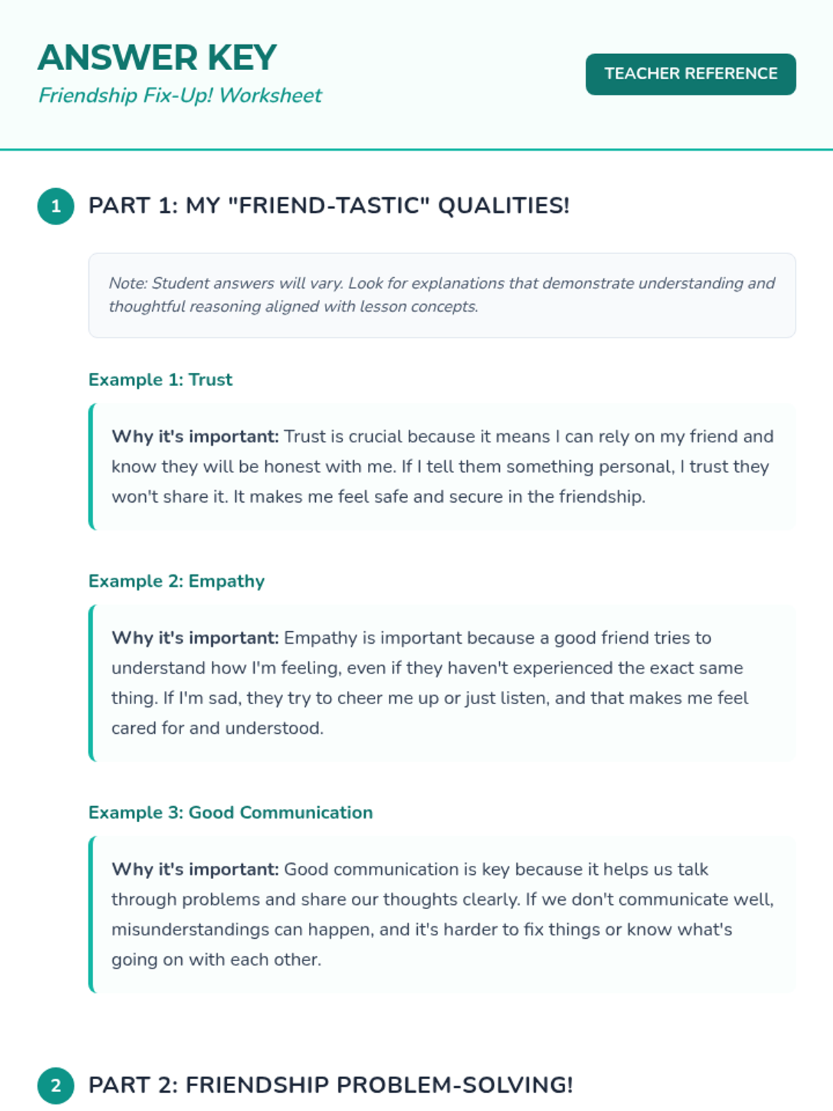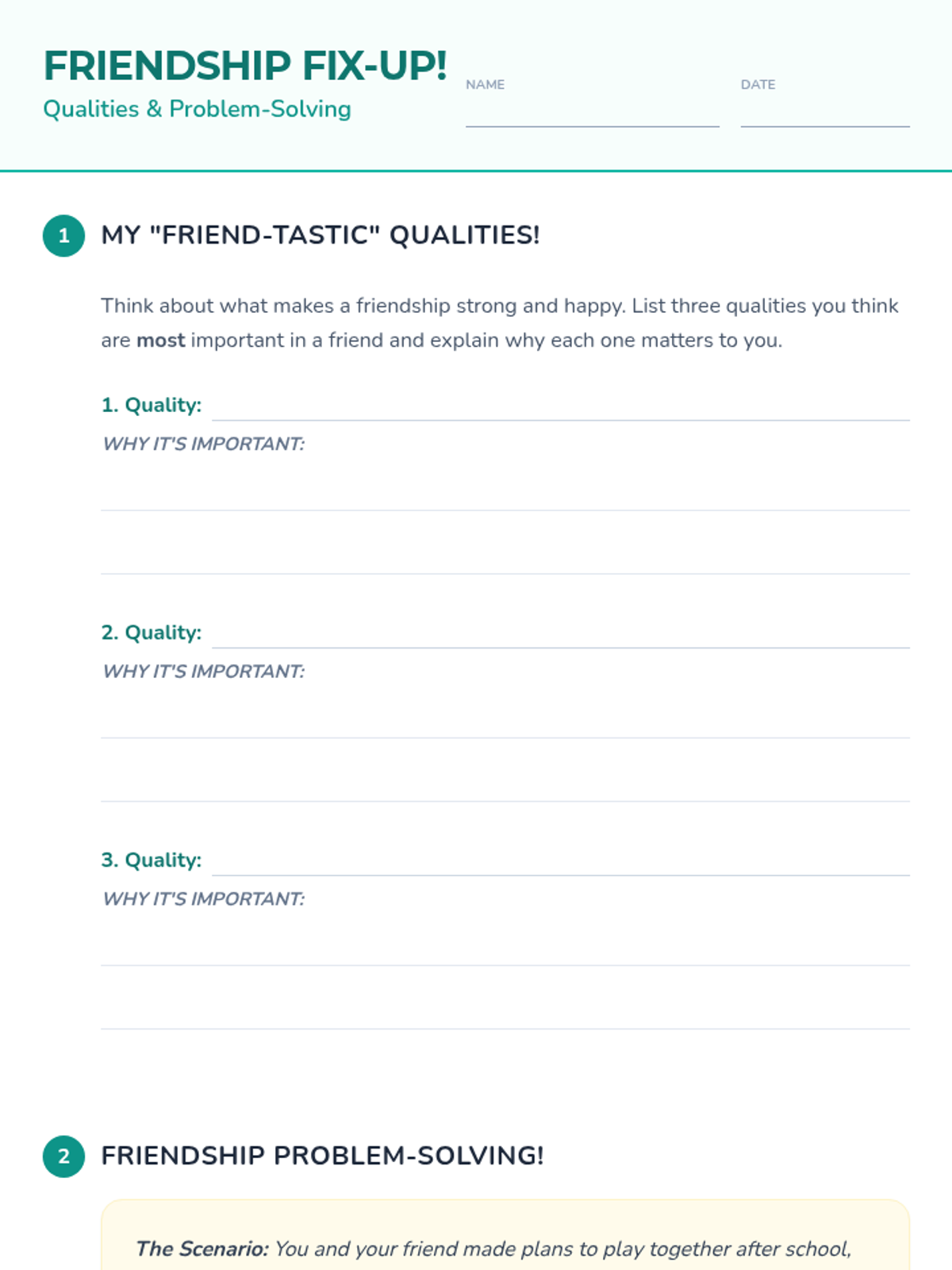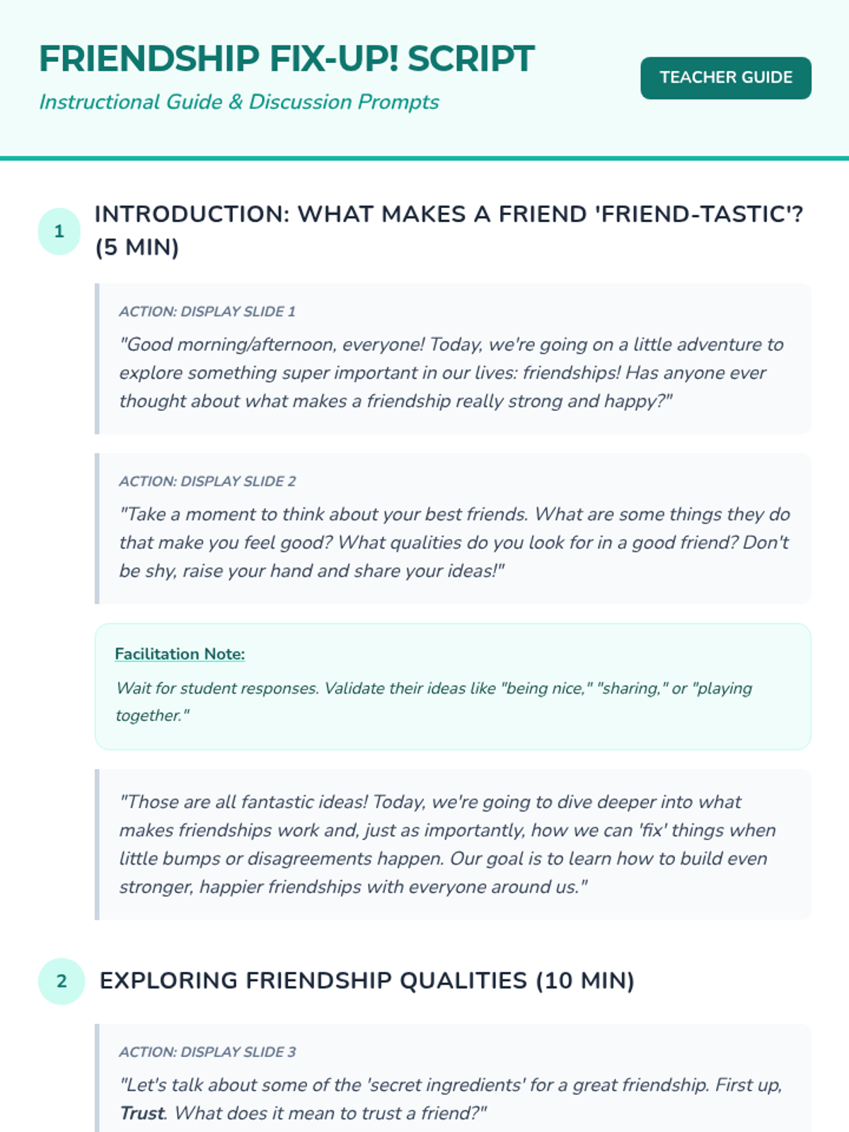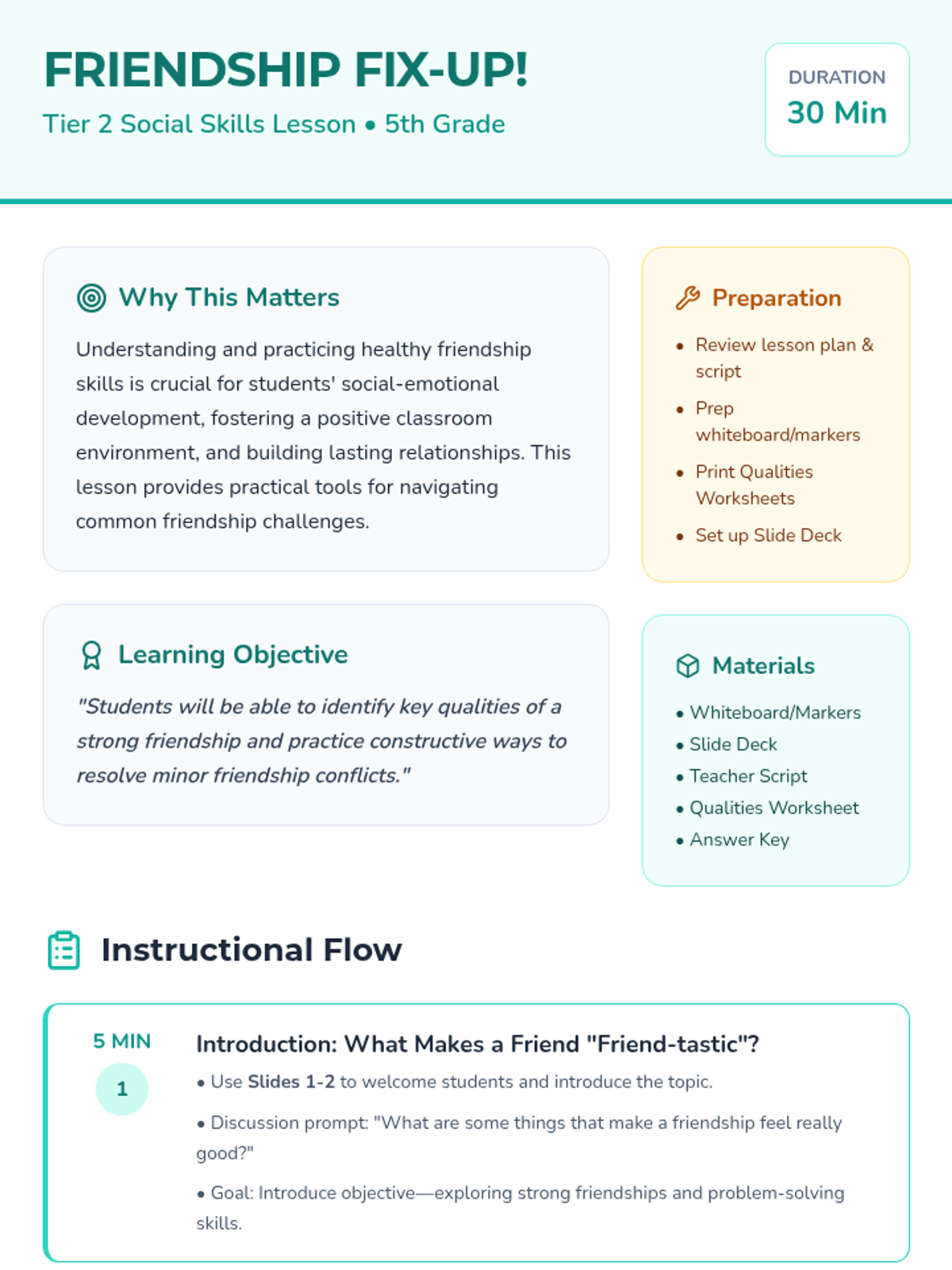 A 30-minute Tier 2 group lesson for 5th graders focused on identifying friendship qualities and practicing conflict resolution skills. Students engage in discussion, role-play, and reflective writing to build stronger interpersonal bonds.