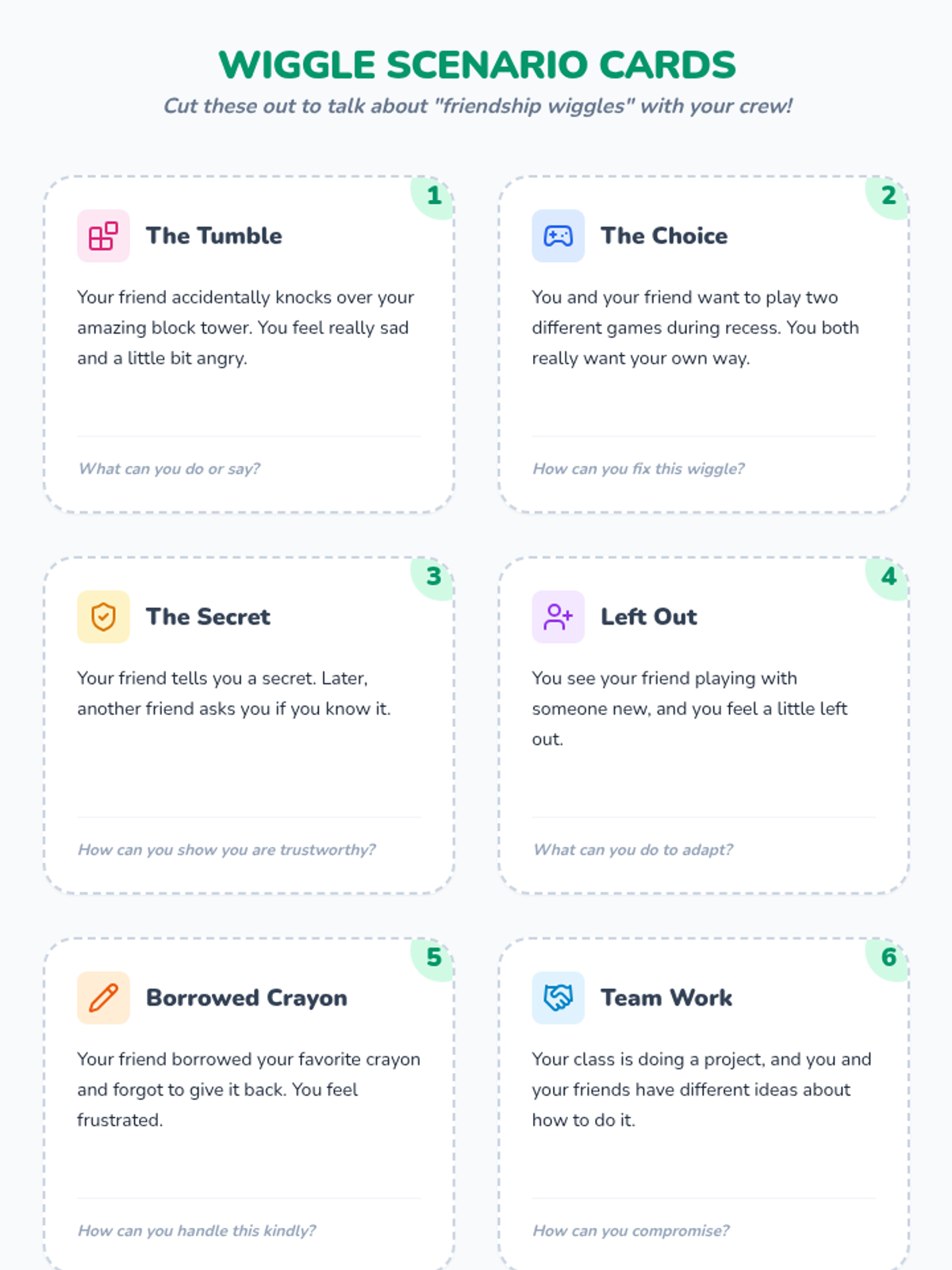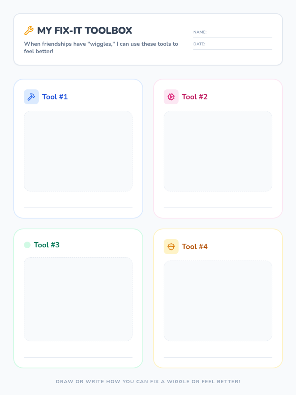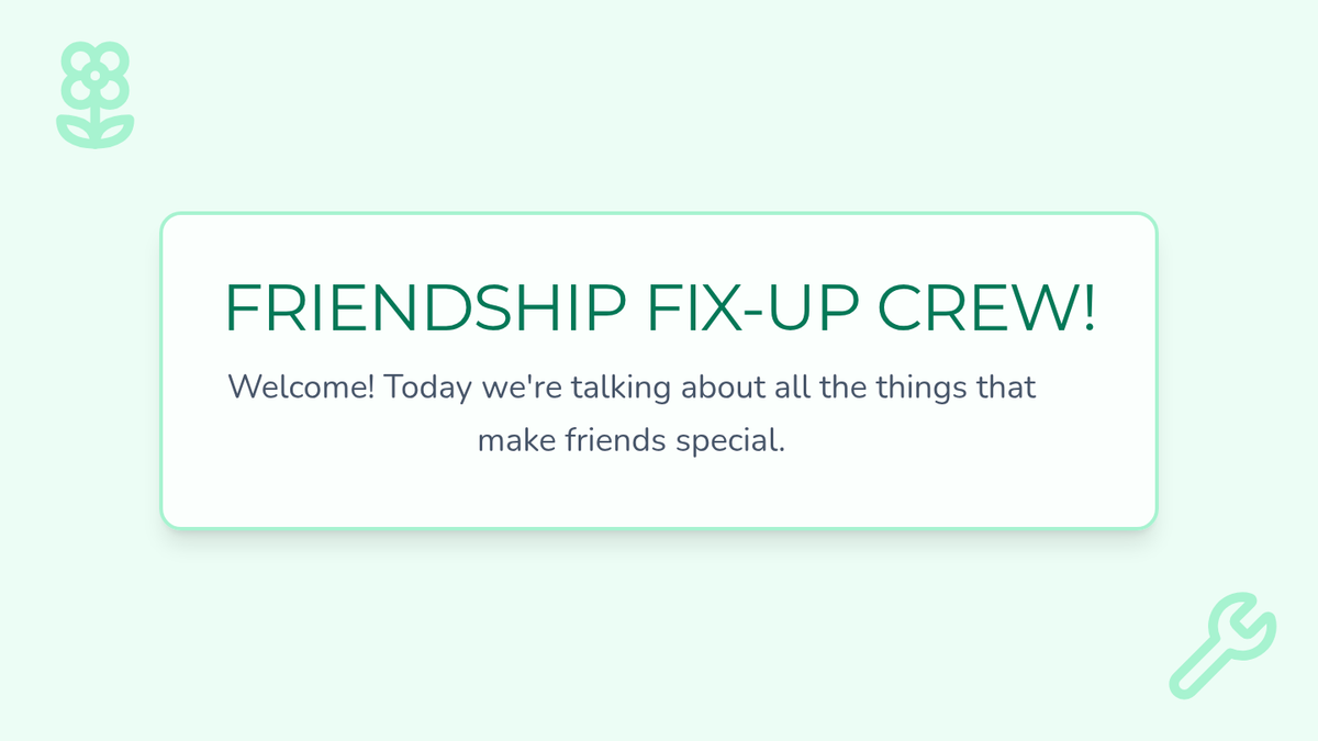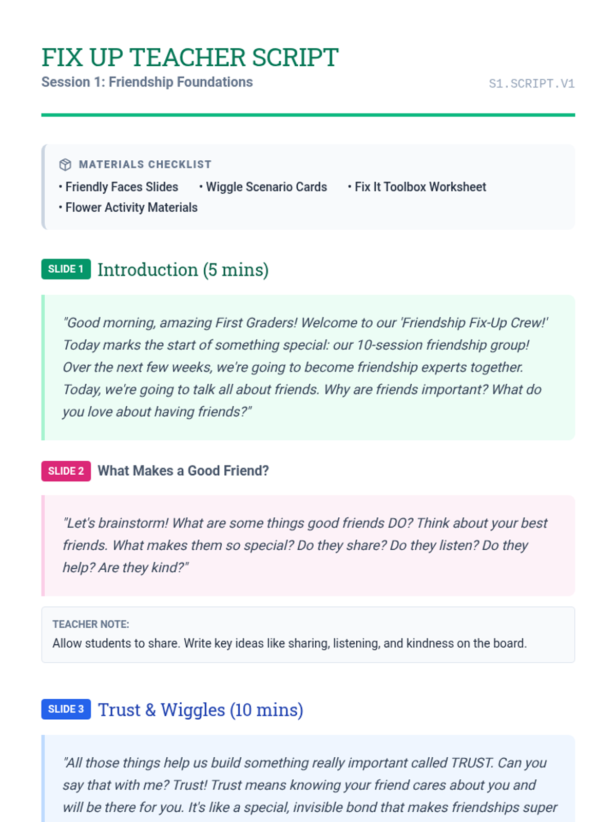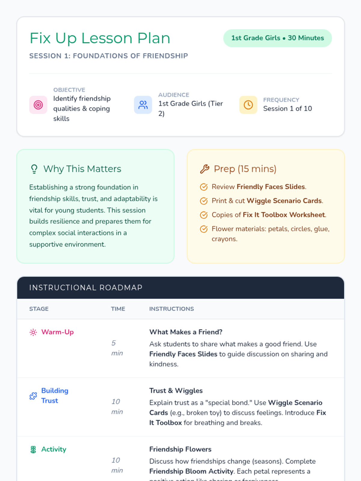 The first of ten sessions for a 1st Grade girls' group, focusing on the basics of friendship, building trust, and handling minor social challenges with 'fix-up' tools.
