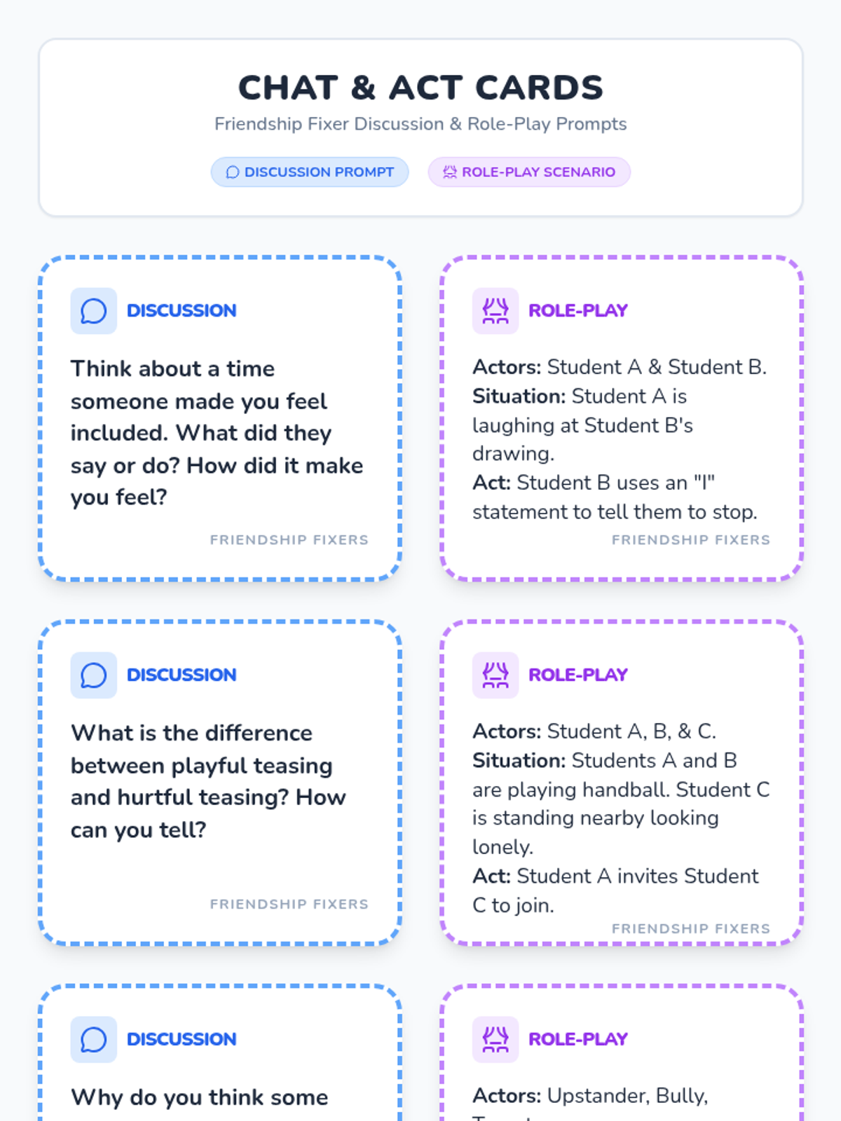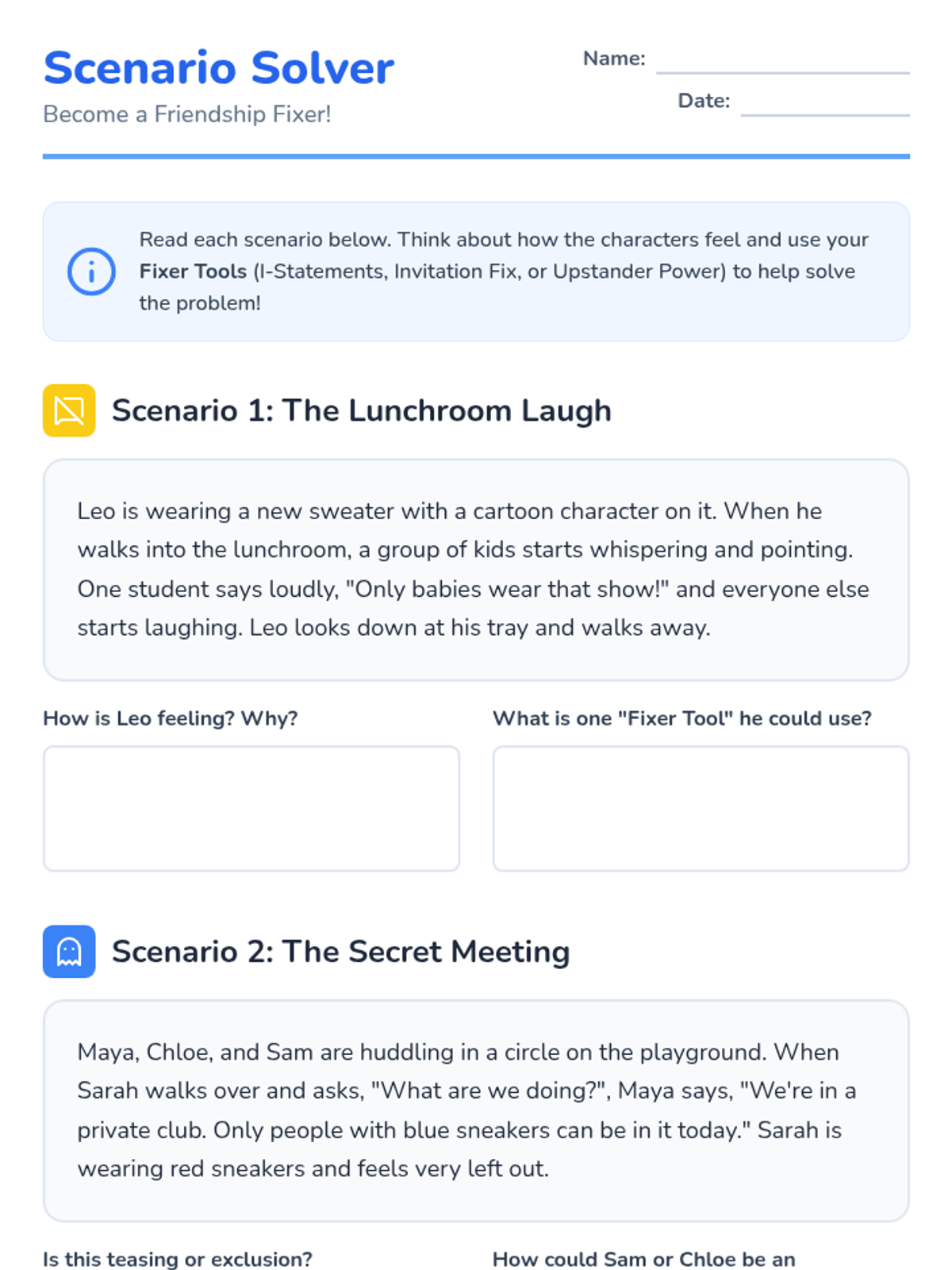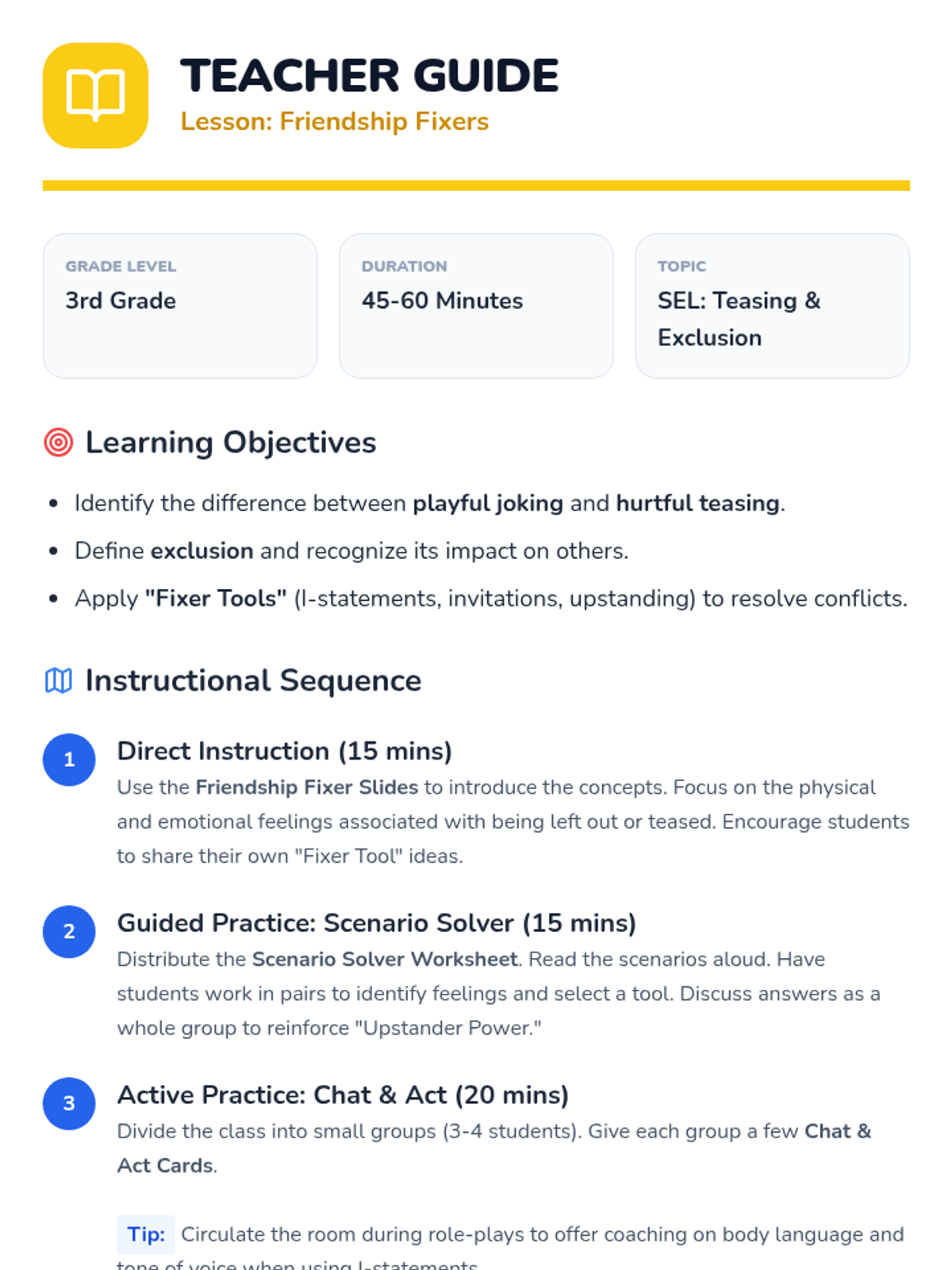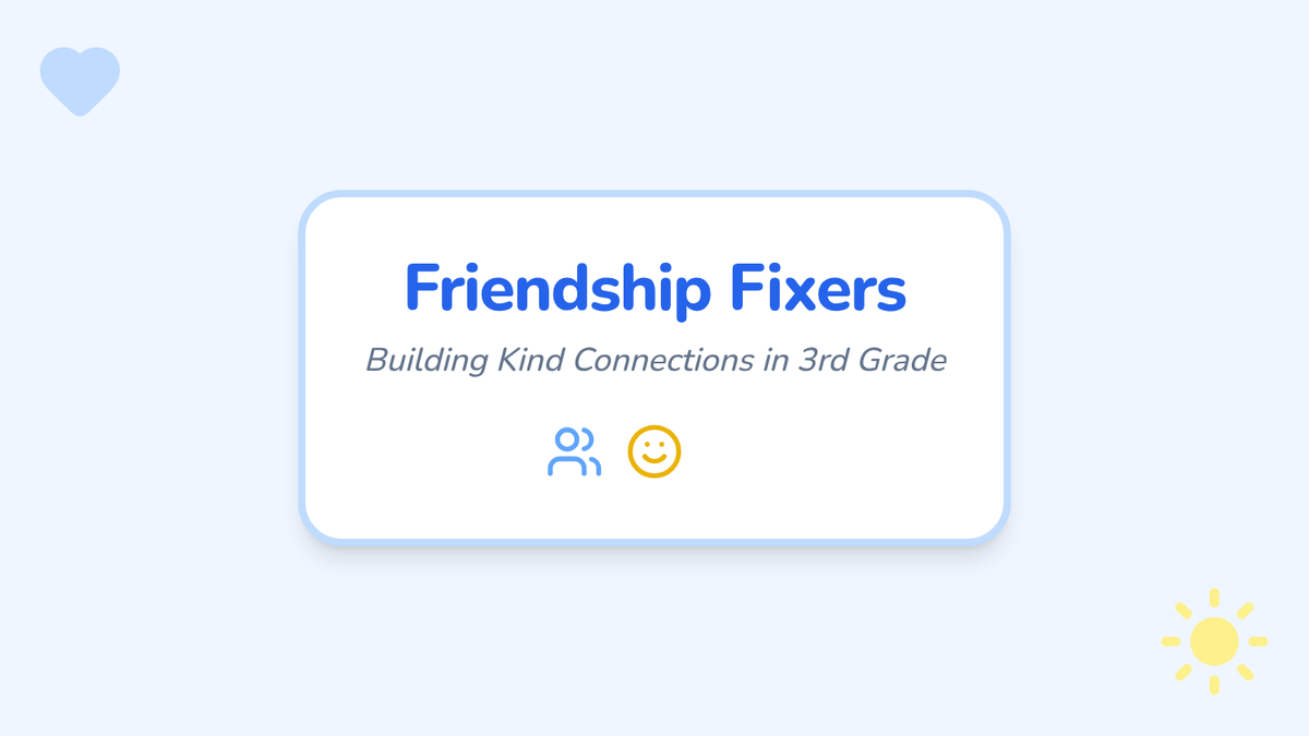 A social-emotional learning lesson designed for 3rd graders to identify and resolve common friendship challenges, specifically focusing on teasing and exclusion. Students will learn practical 'fixer' tools through interactive slides, scenarios, and role-playing.