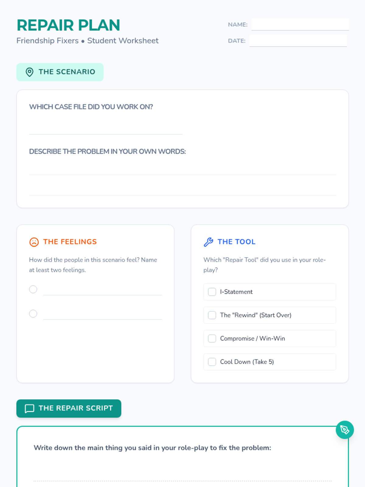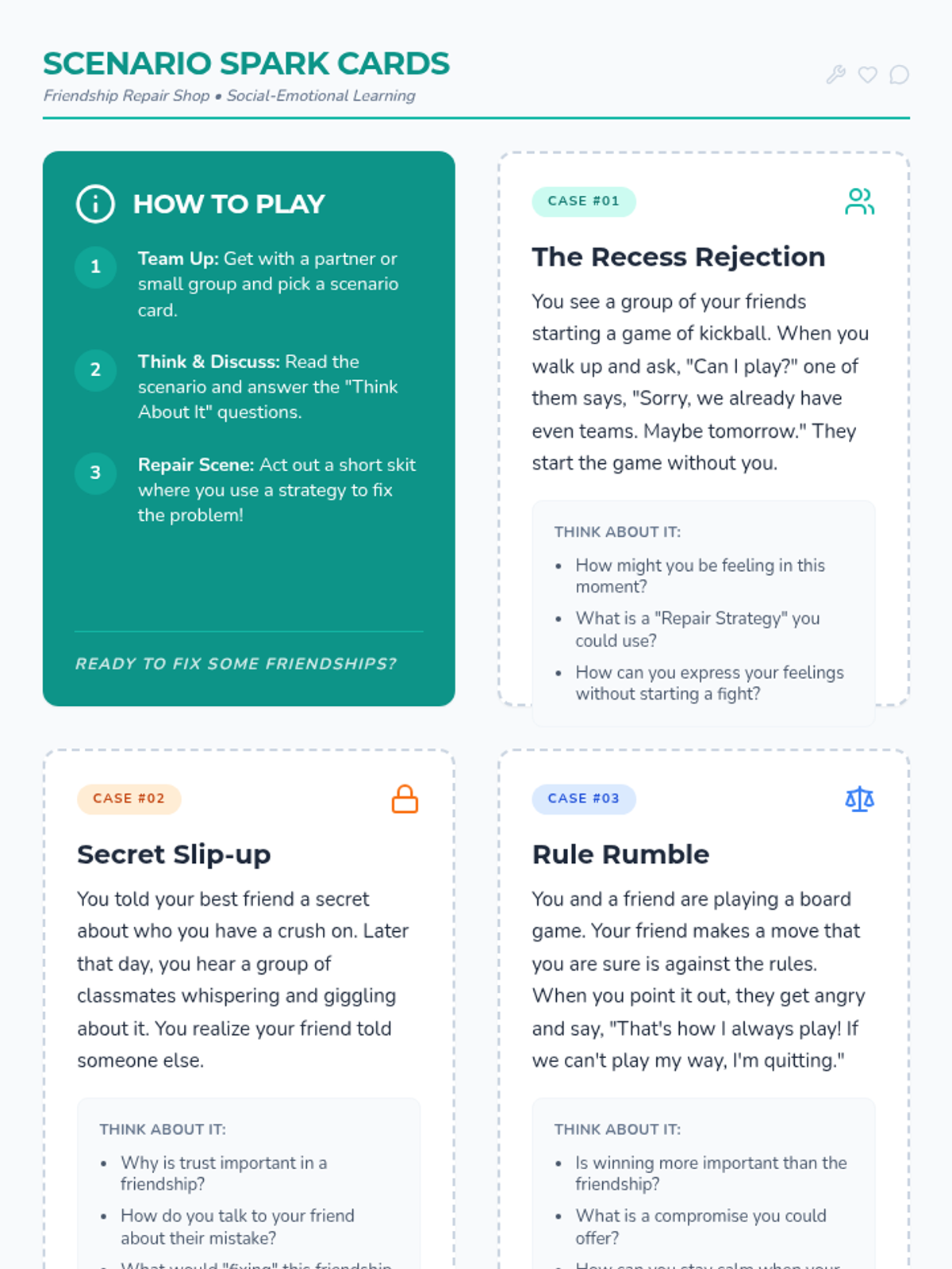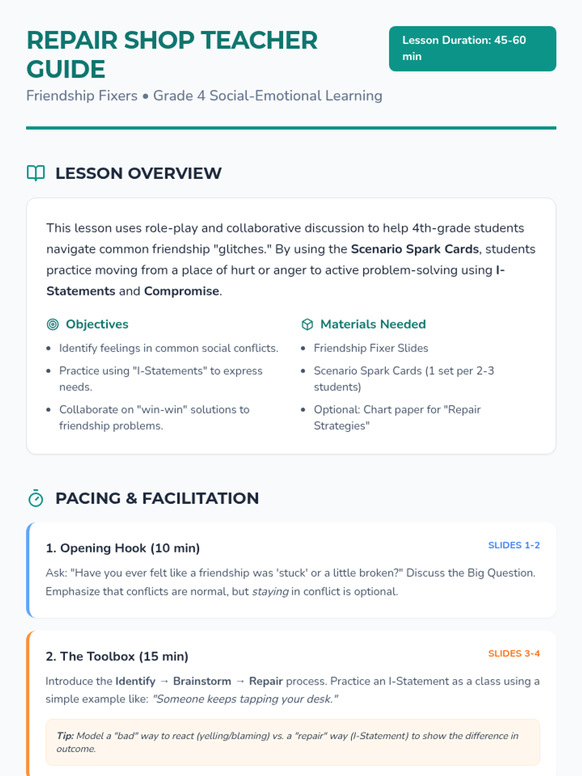 A social-emotional learning lesson focused on navigating common 4th-grade friendship challenges through role-play and collaborative problem-solving. Students use scenario cards to identify feelings, brainstorm solutions, and practice 'repair' strategies.
