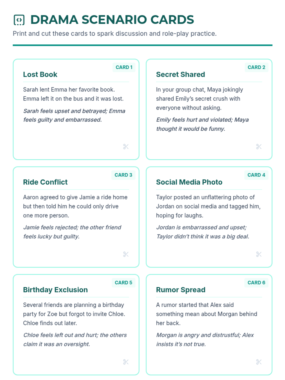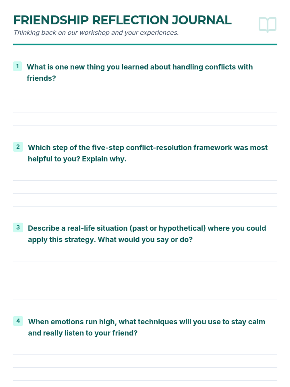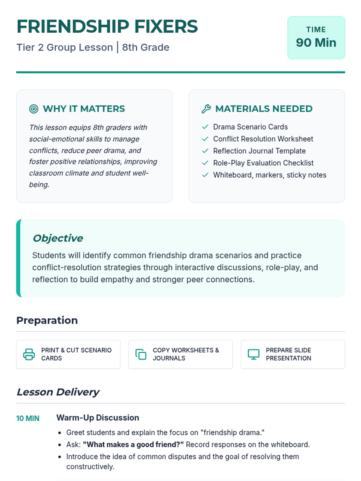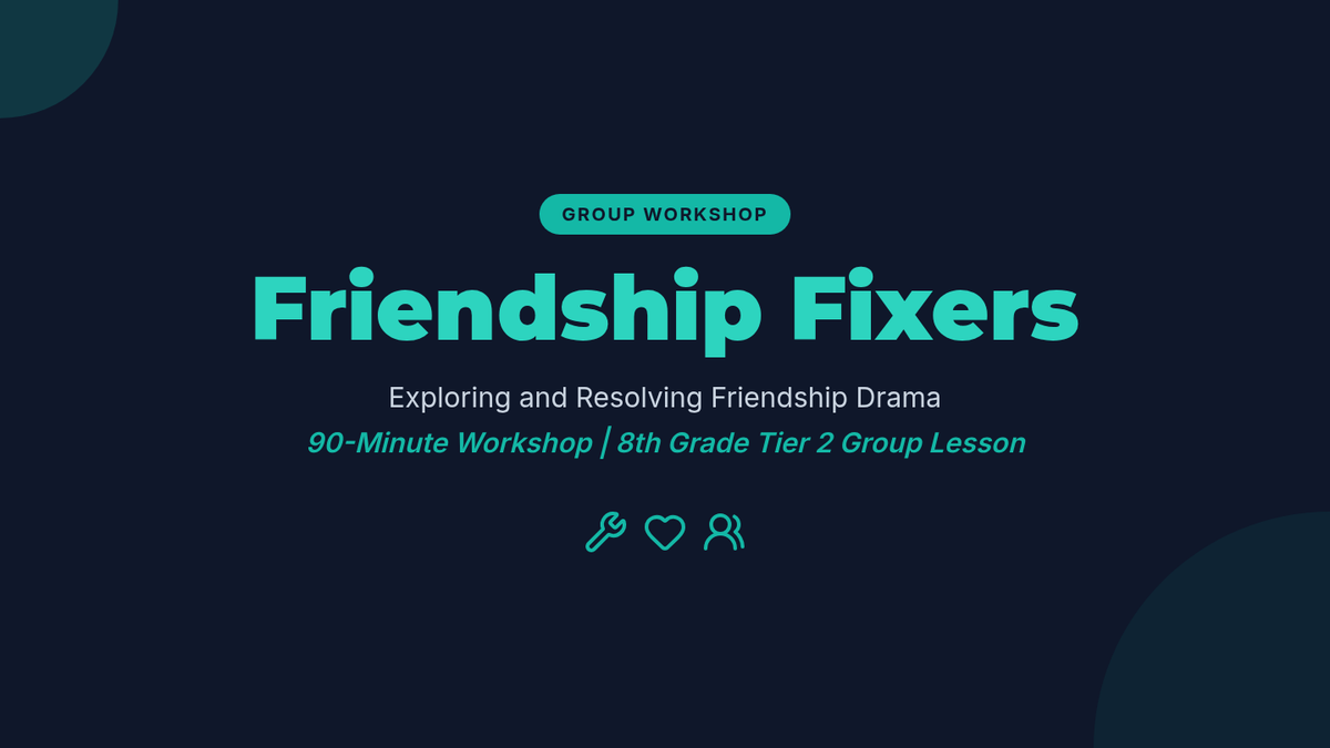 A 90-minute Tier 2 group lesson for 8th graders focused on resolving friendship drama using a five-step conflict resolution framework, role-play, and personal reflection.