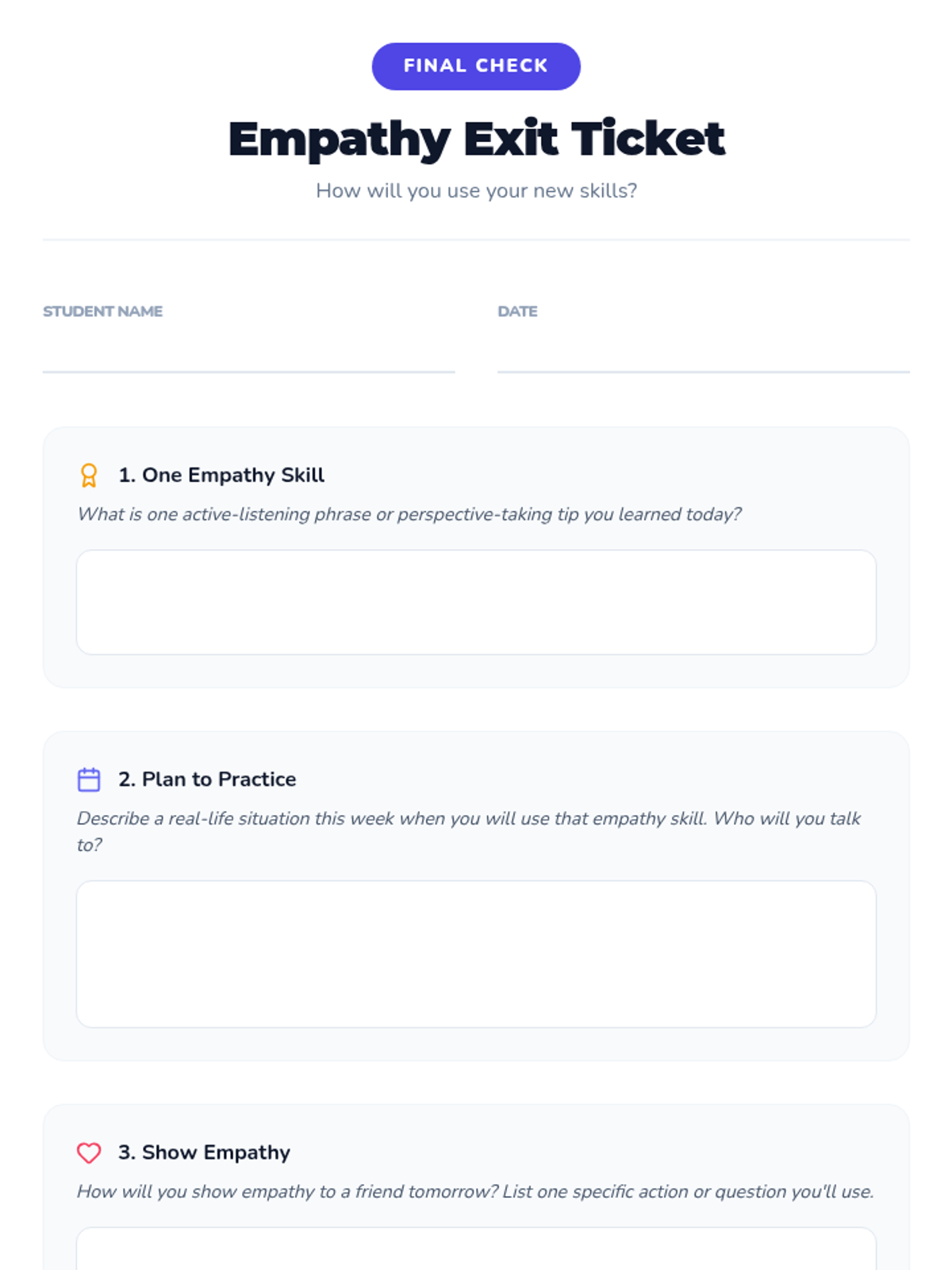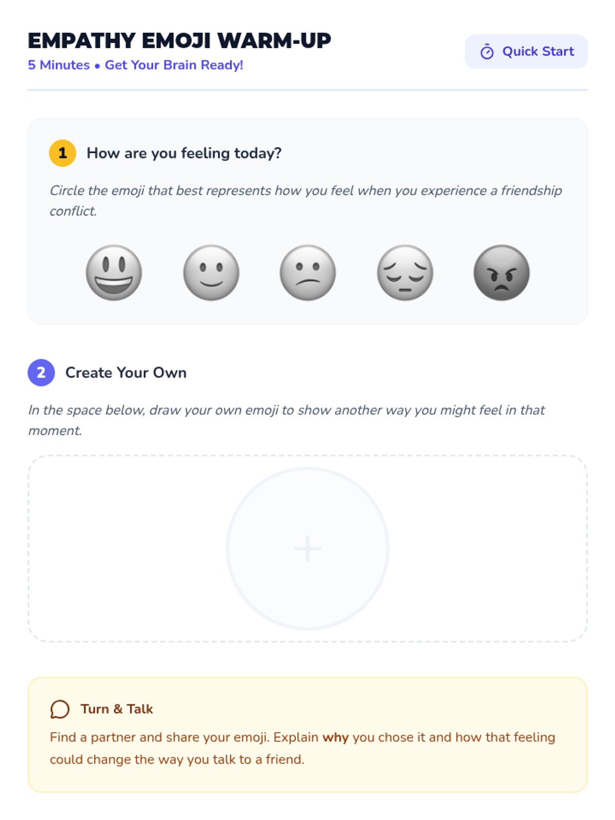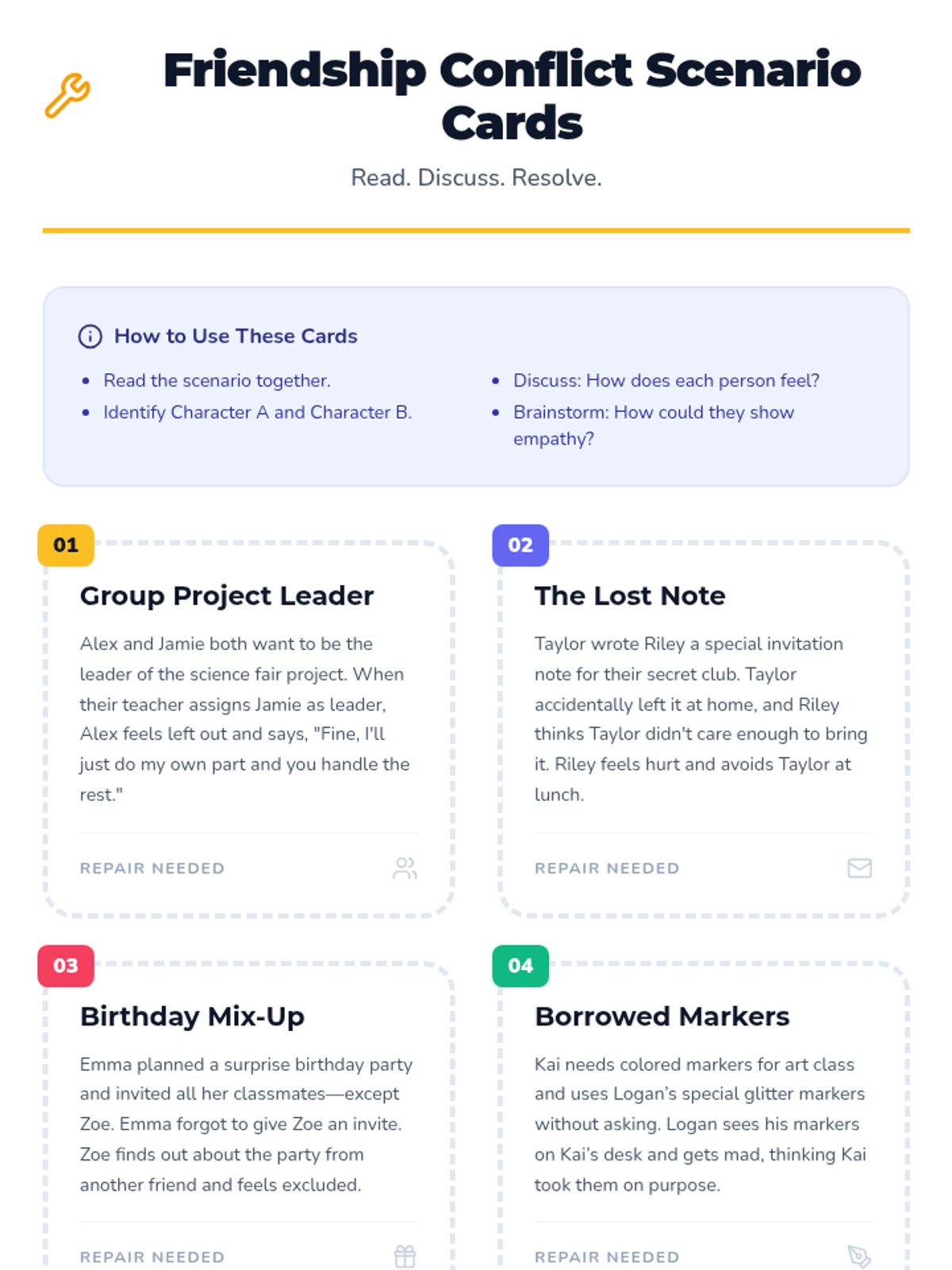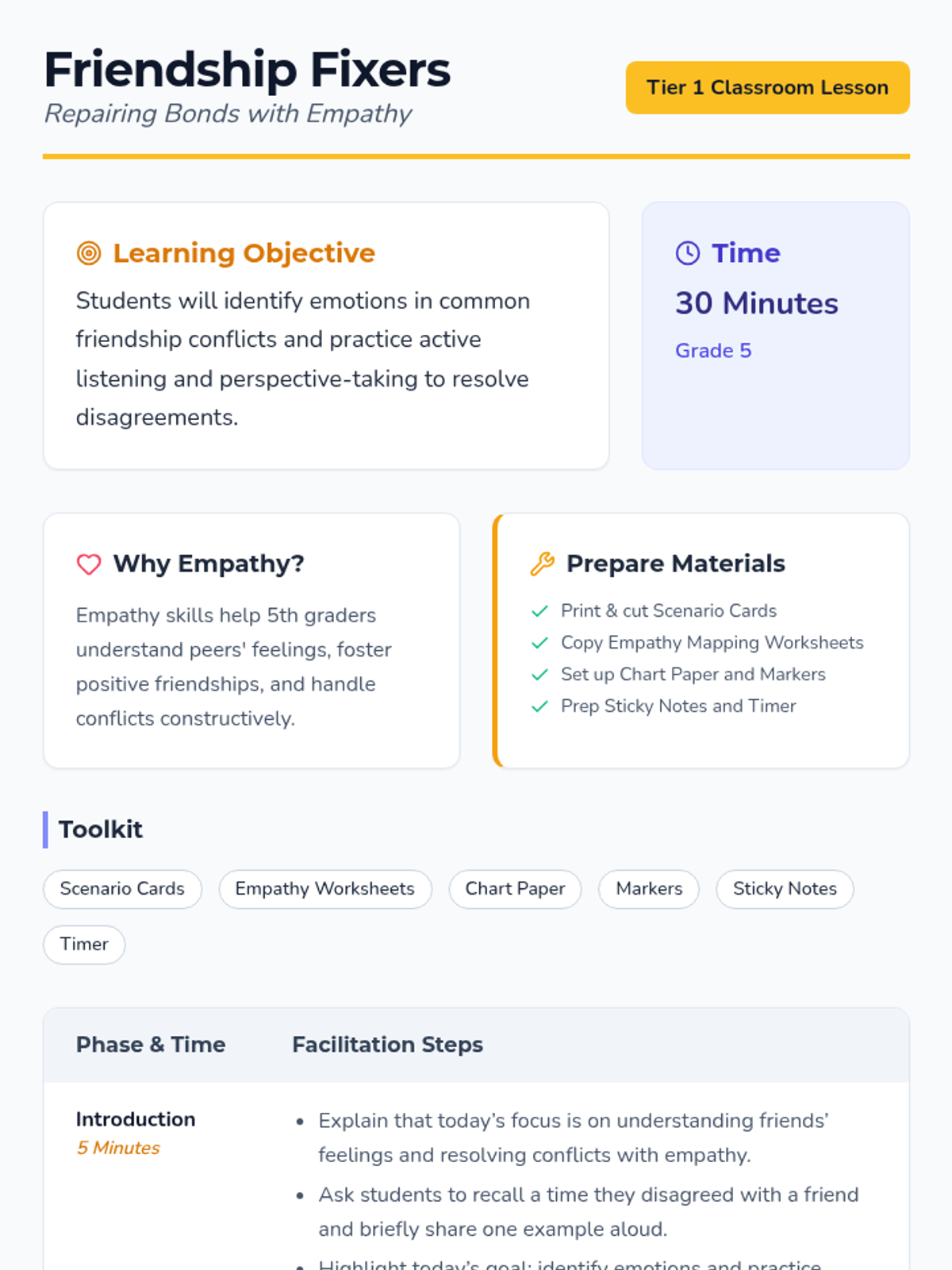 A 30-minute lesson where 5th graders use 'empathy tools' to navigate friendship conflicts, practicing active listening and perspective-taking through scenario mapping and role-play.