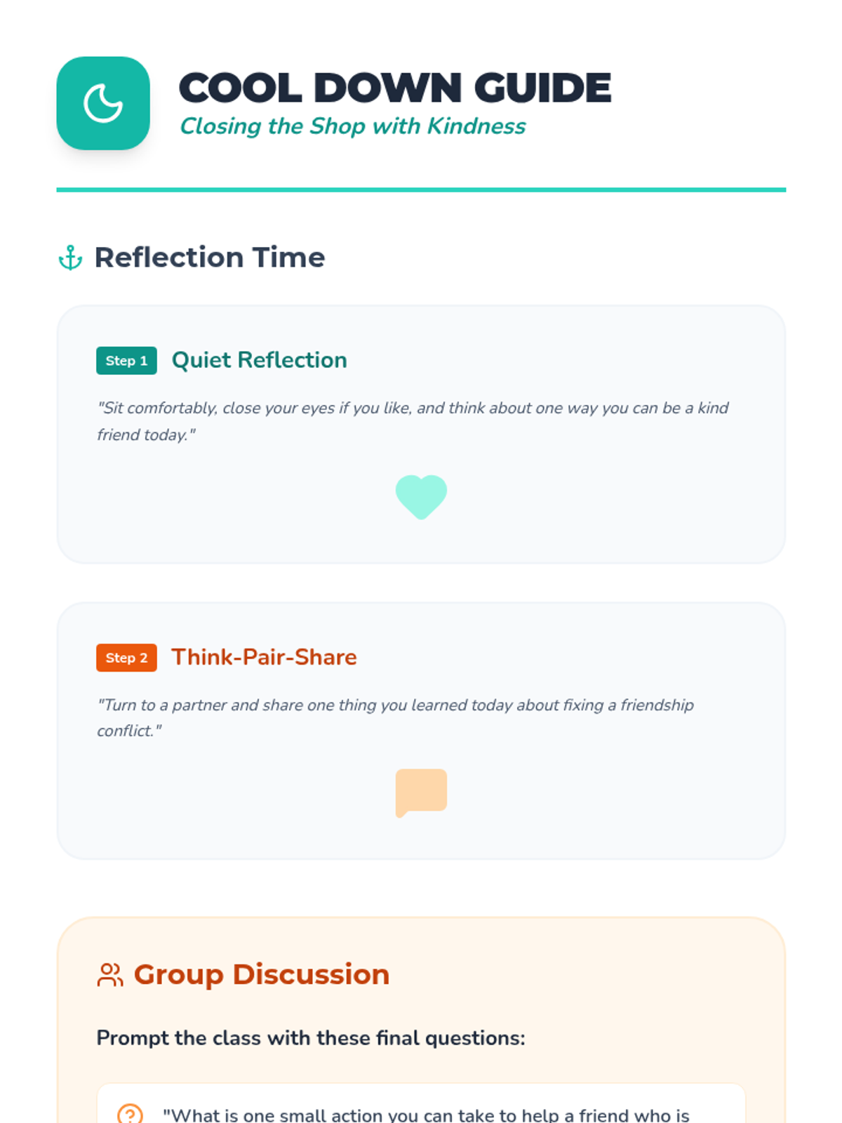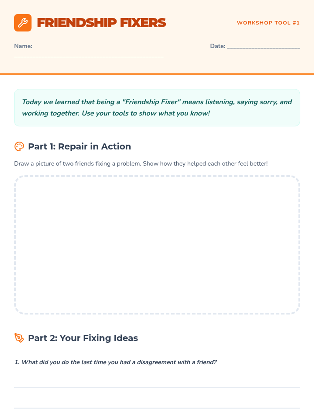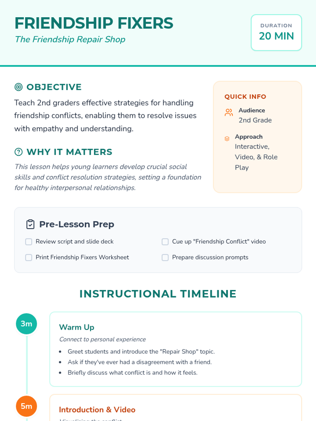 A comprehensive 20-minute social-emotional learning lesson for 2nd graders on conflict resolution, empathy, and effective communication using a 'Friendship Repair Shop' theme.