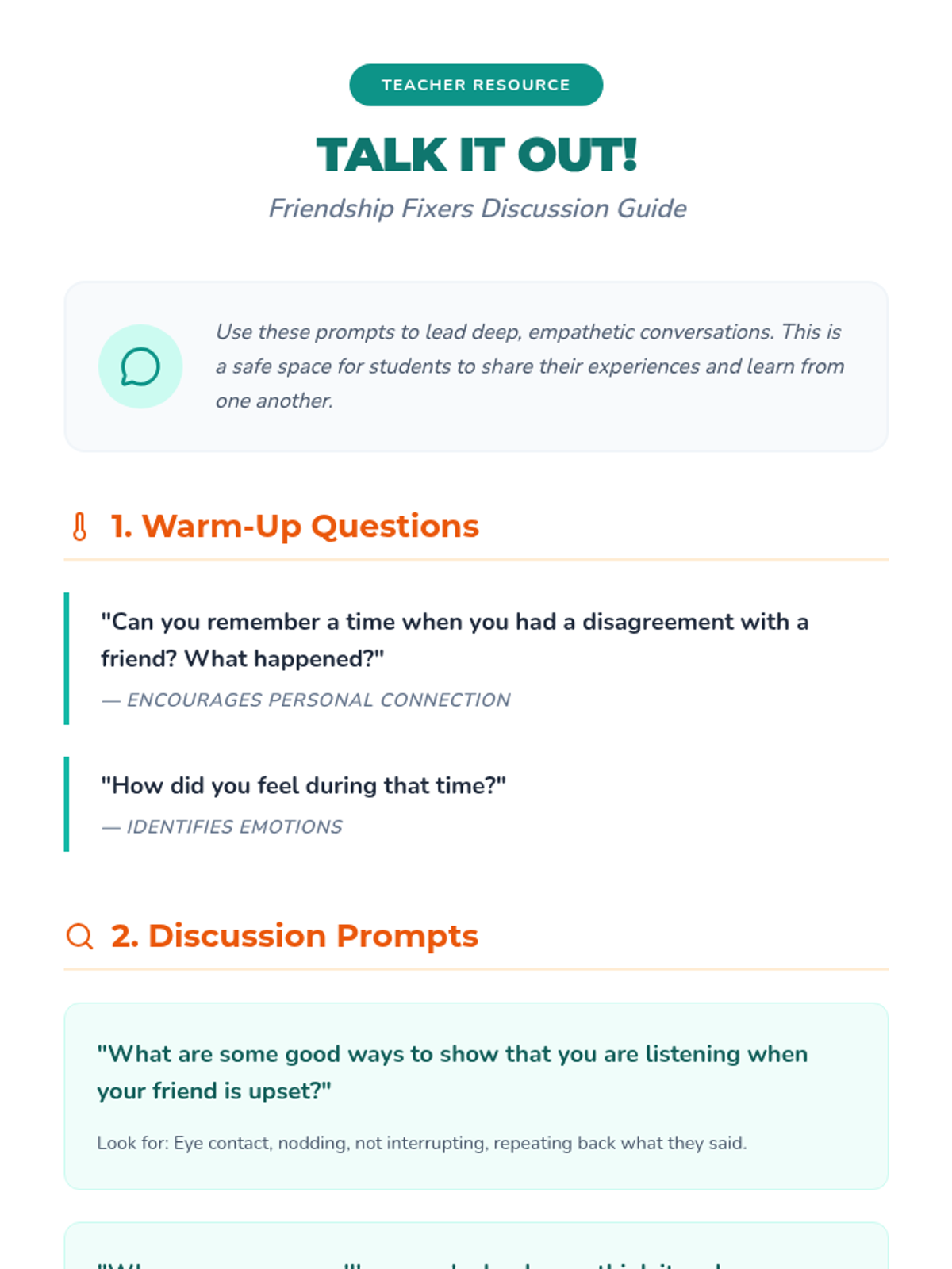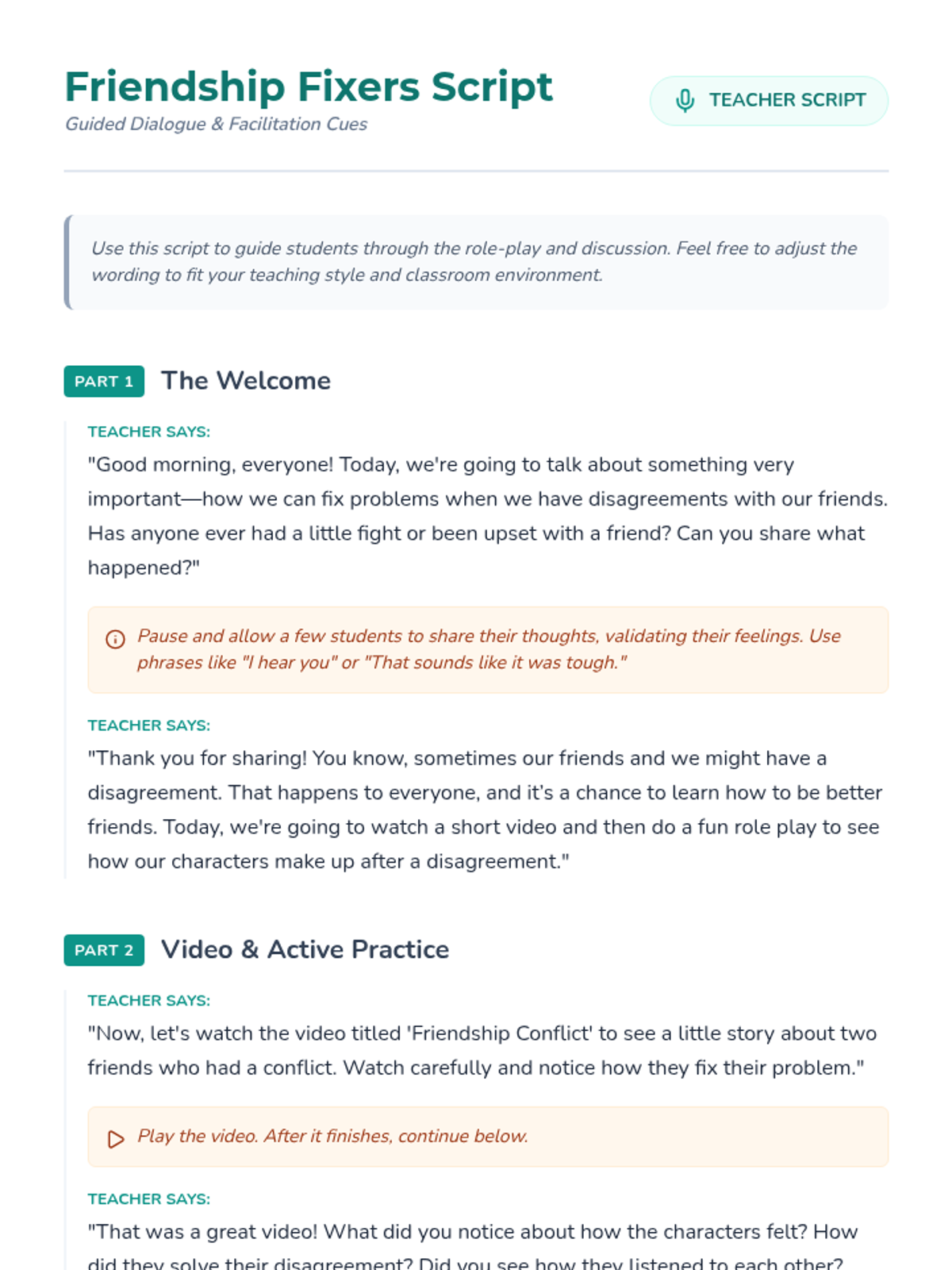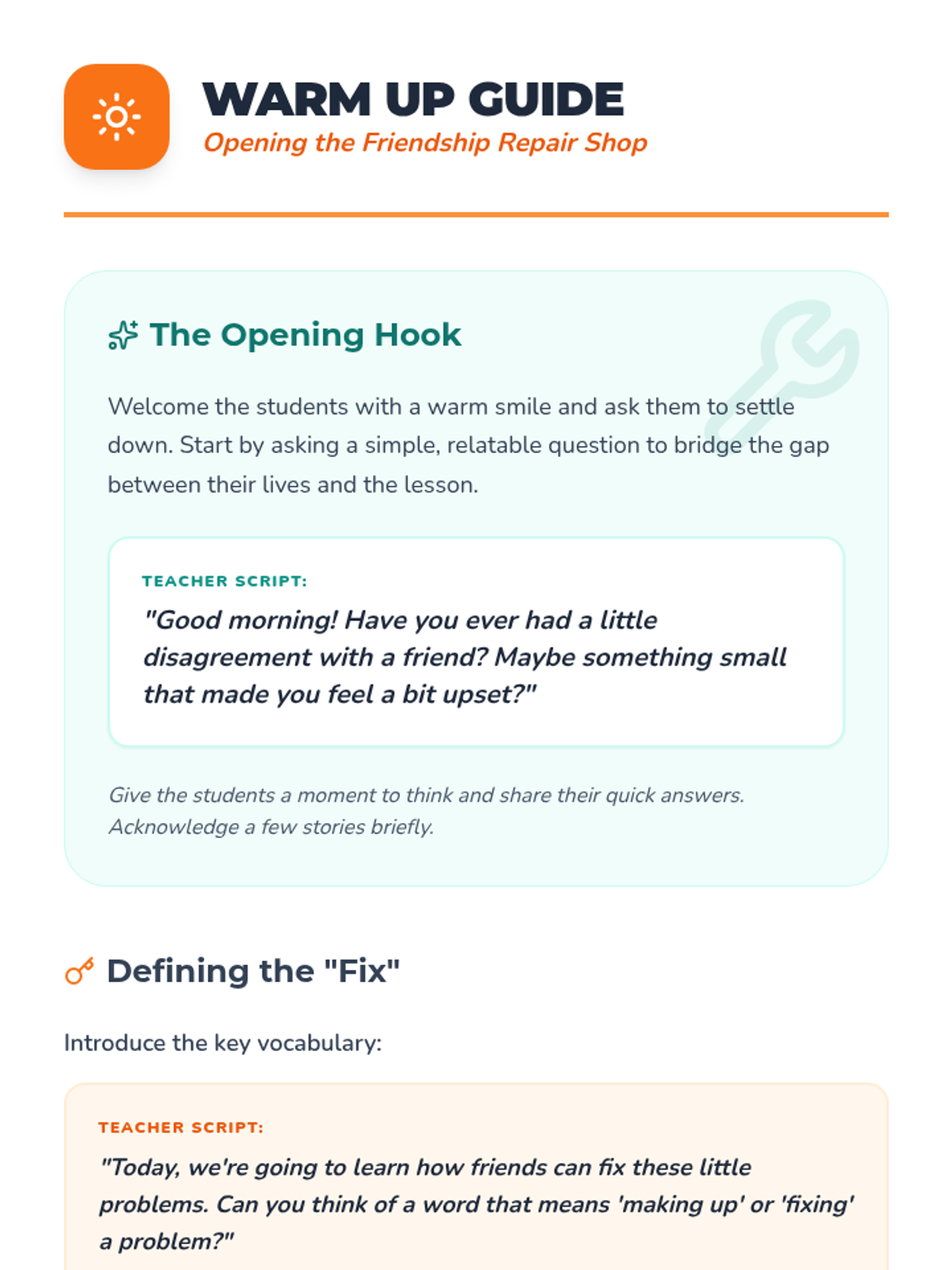 A comprehensive 20-minute social-emotional learning lesson for 2nd graders on conflict resolution, empathy, and effective communication using a 'Friendship Repair Shop' theme.