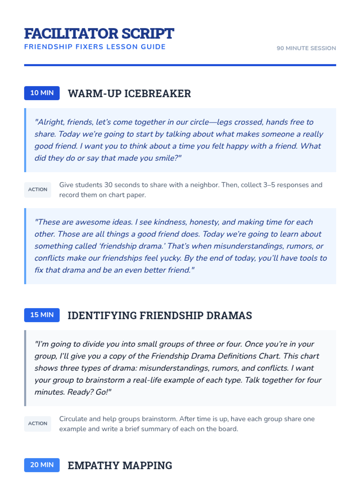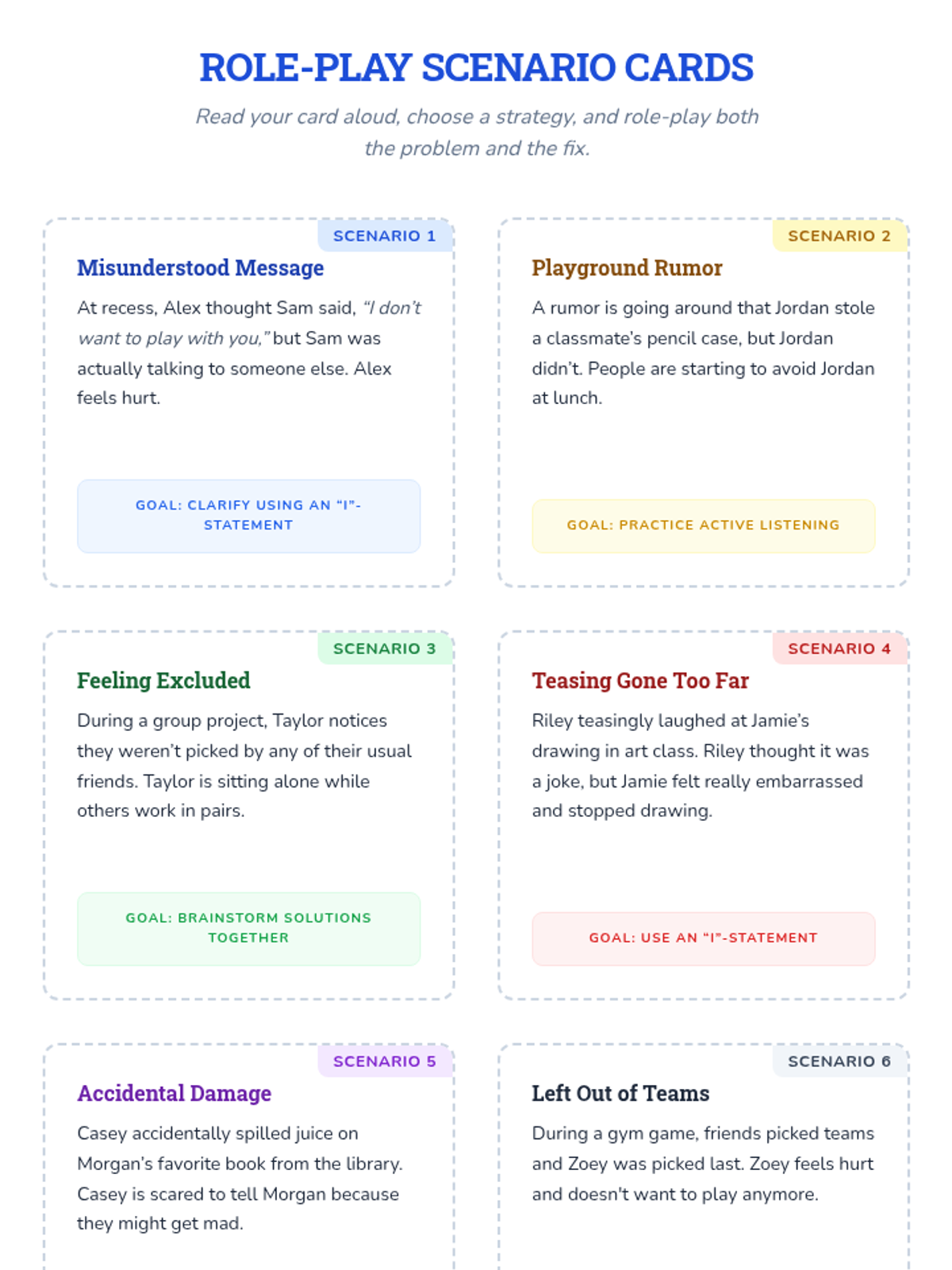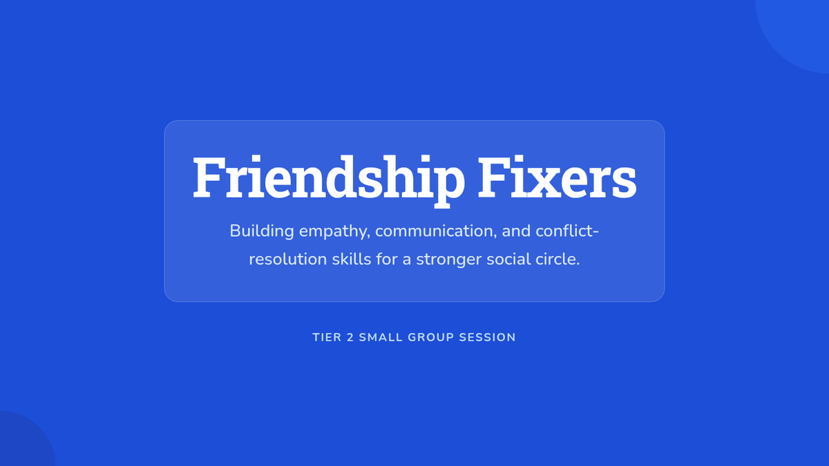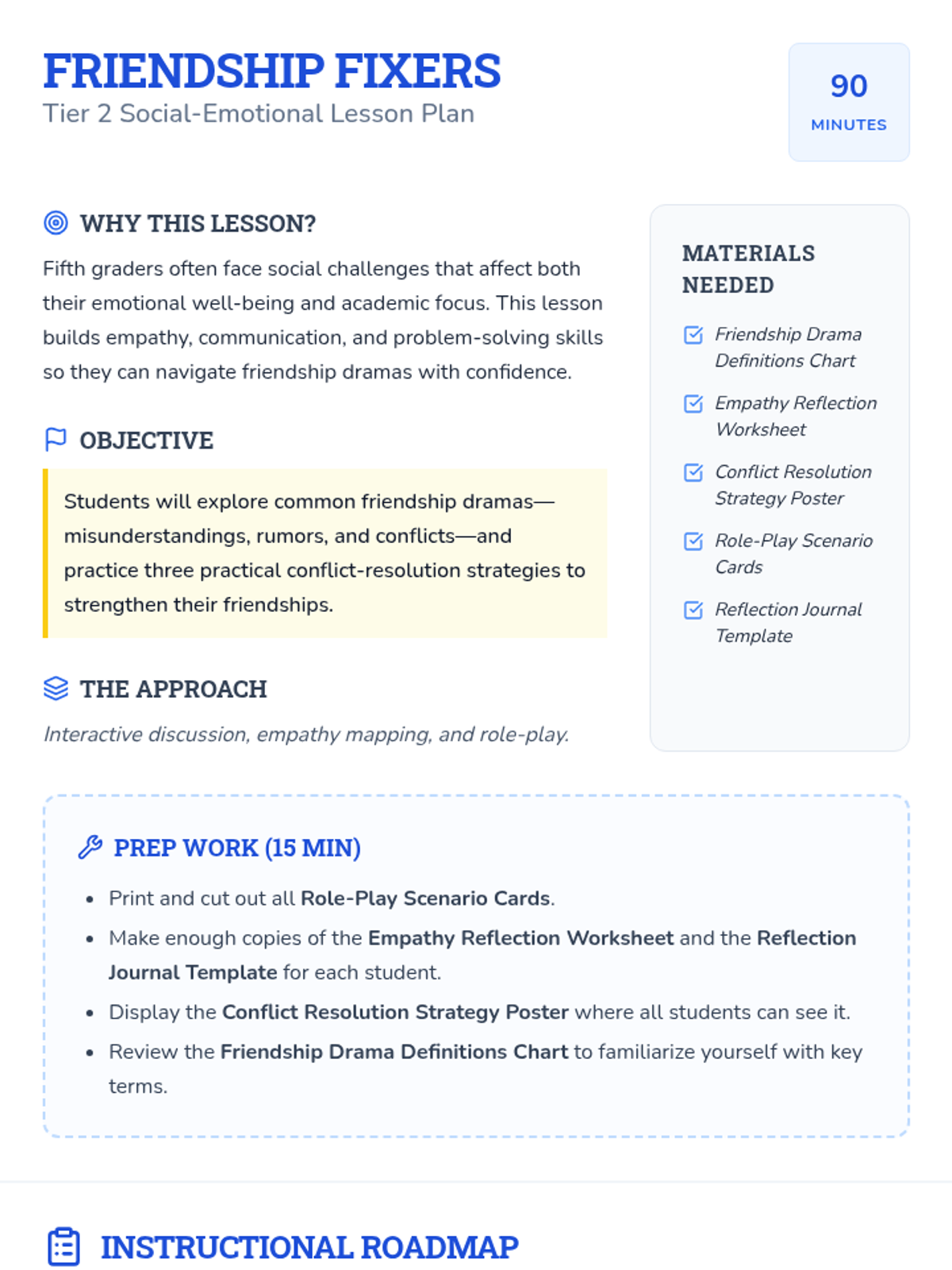 A 90-minute Tier 2 small-group lesson for 5th graders focused on identifying friendship dramas and practicing conflict resolution strategies like I-statements and active listening.