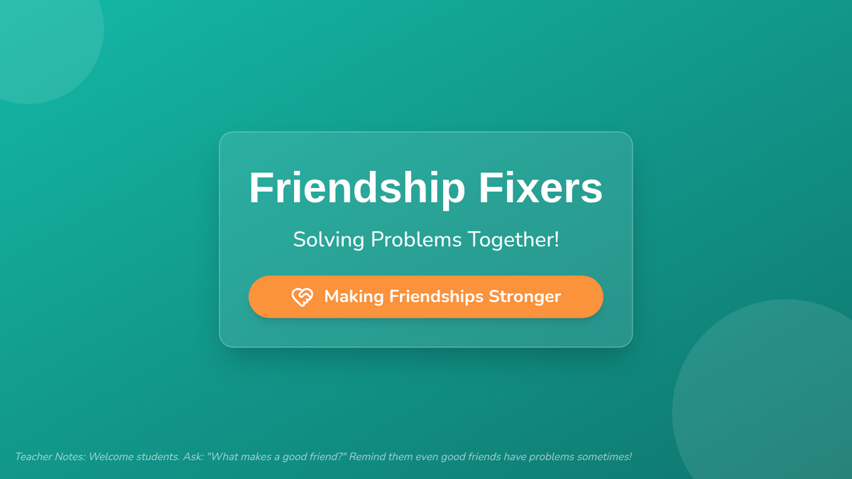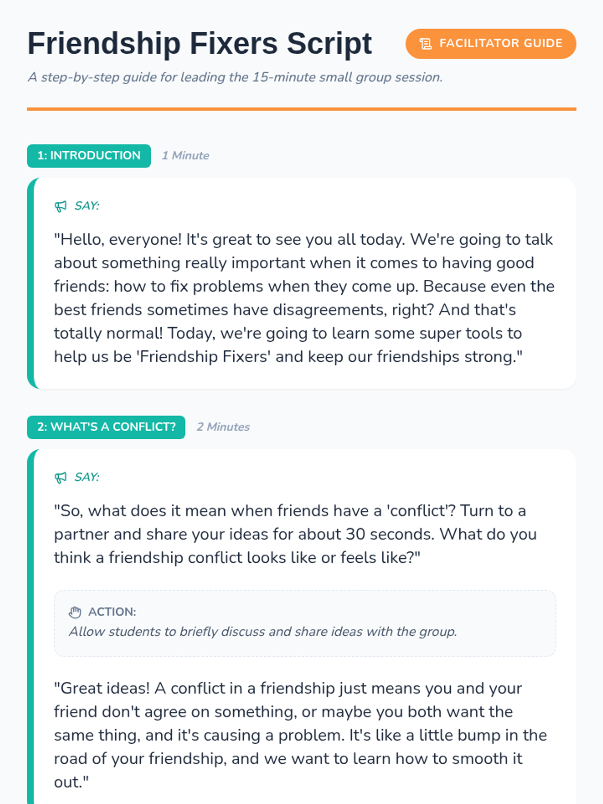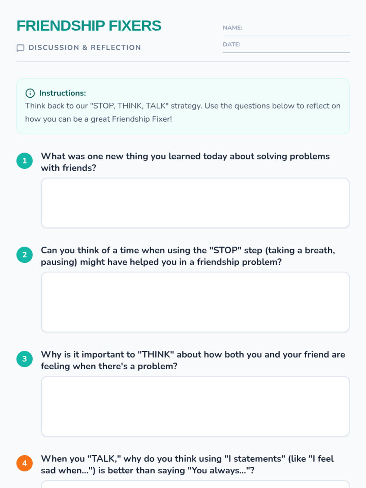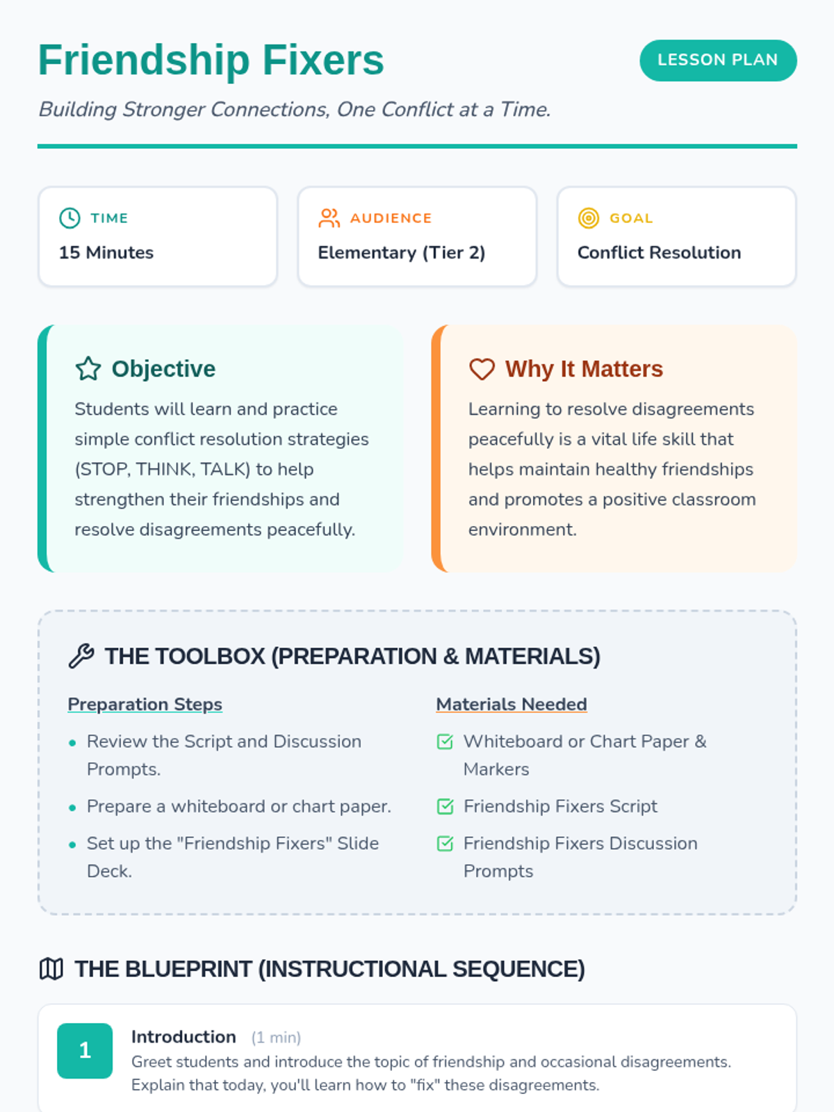 A 15-minute Tier 2 small group lesson for elementary students focused on resolving friendship conflicts using the STOP, THINK, TALK strategy. Students will learn to pause, reflect on feelings, and use 'I' statements to maintain healthy relationships.