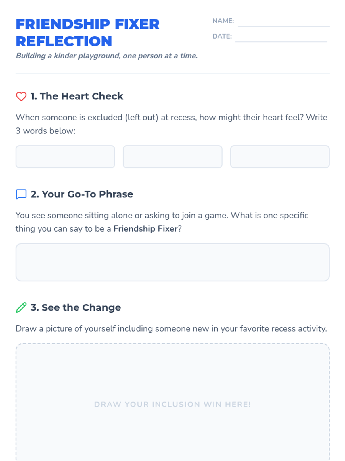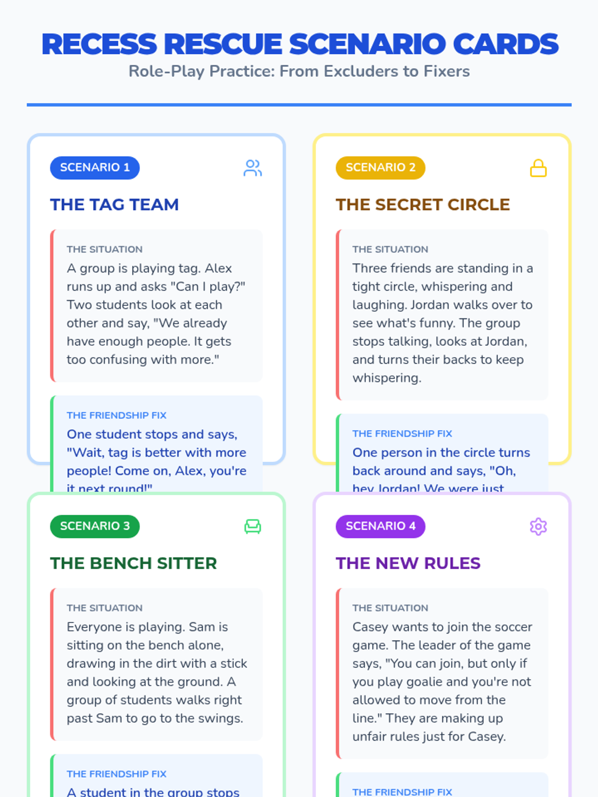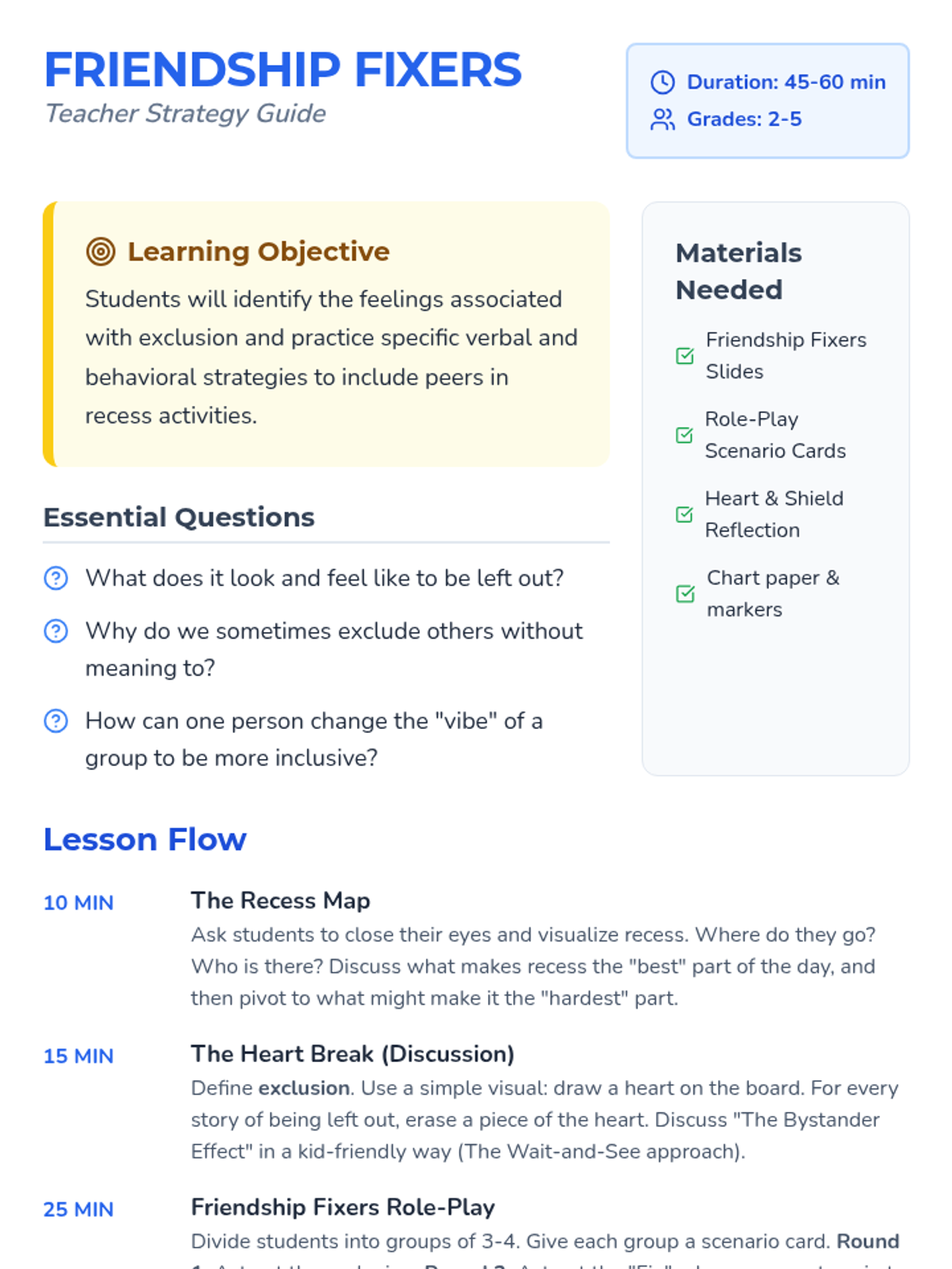 A social-emotional learning lesson designed to address exclusion and promote inclusion during recess through role-playing and guided discussion.