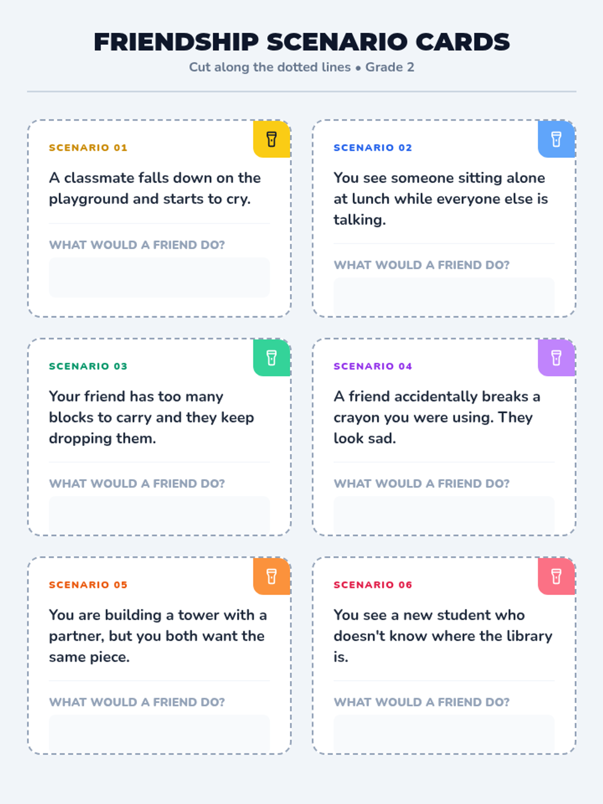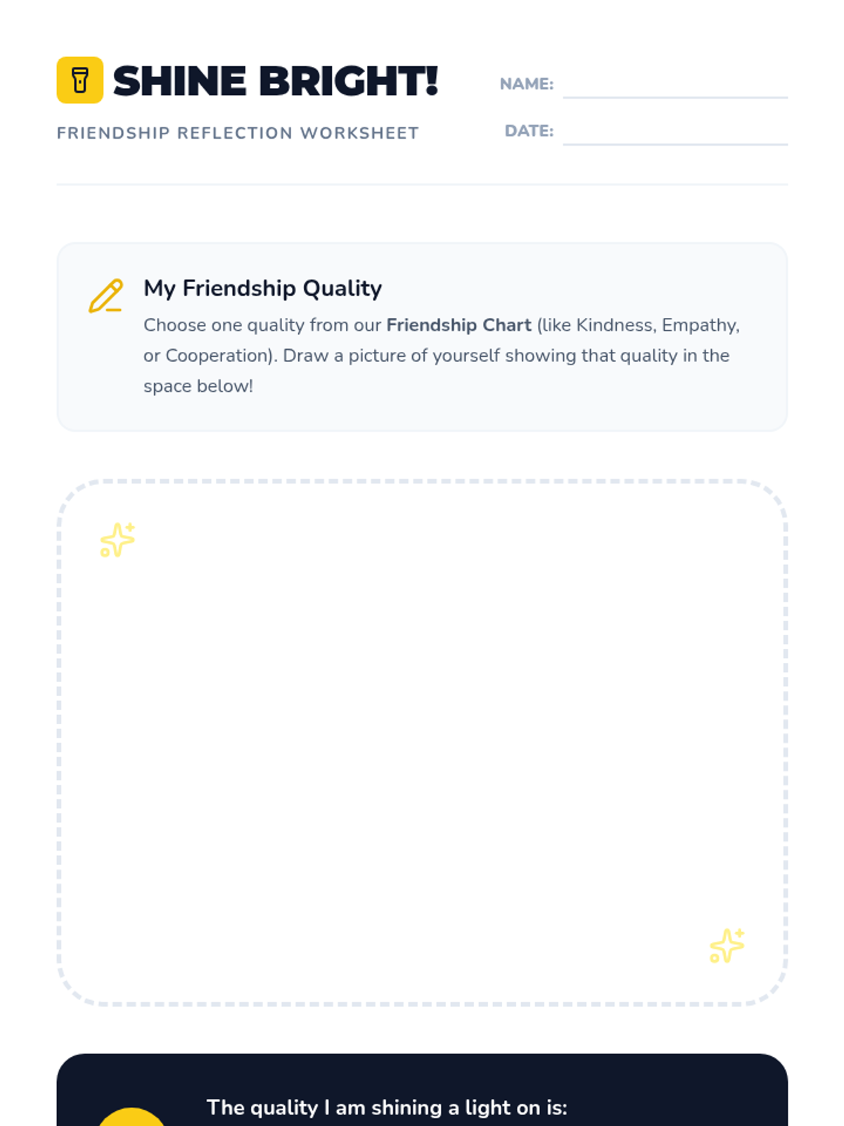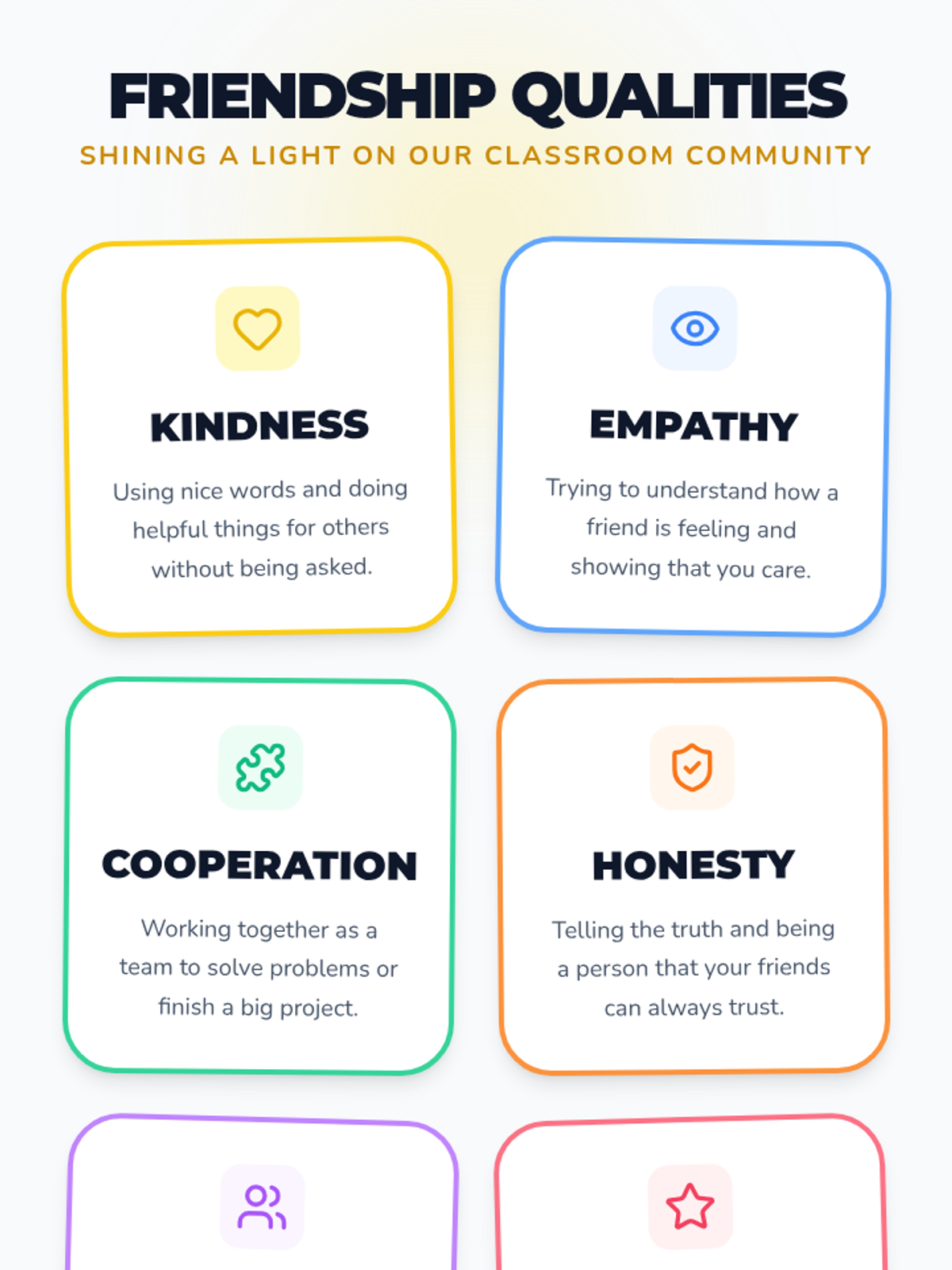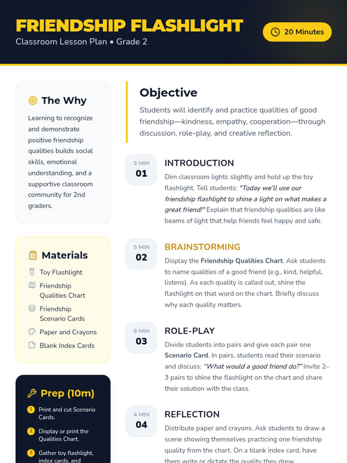 A 20-minute Tier 1 lesson for 2nd graders to explore friendship qualities like kindness, empathy, and cooperation through a 'flashlight' metaphor and interactive role-play.