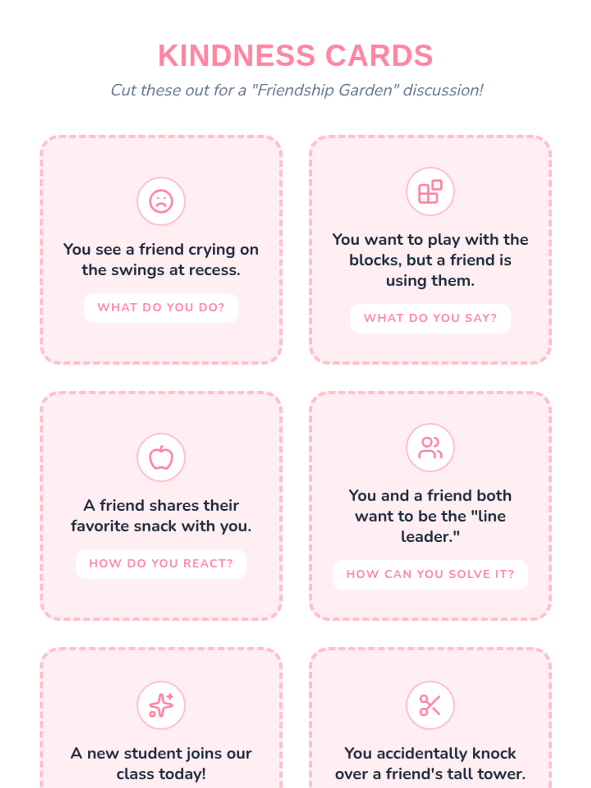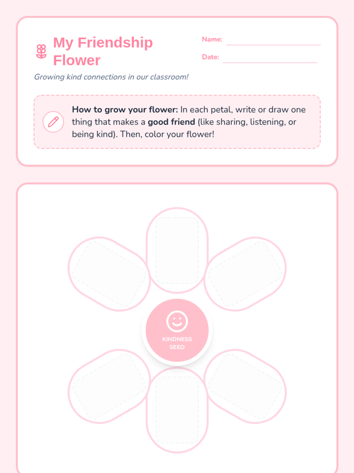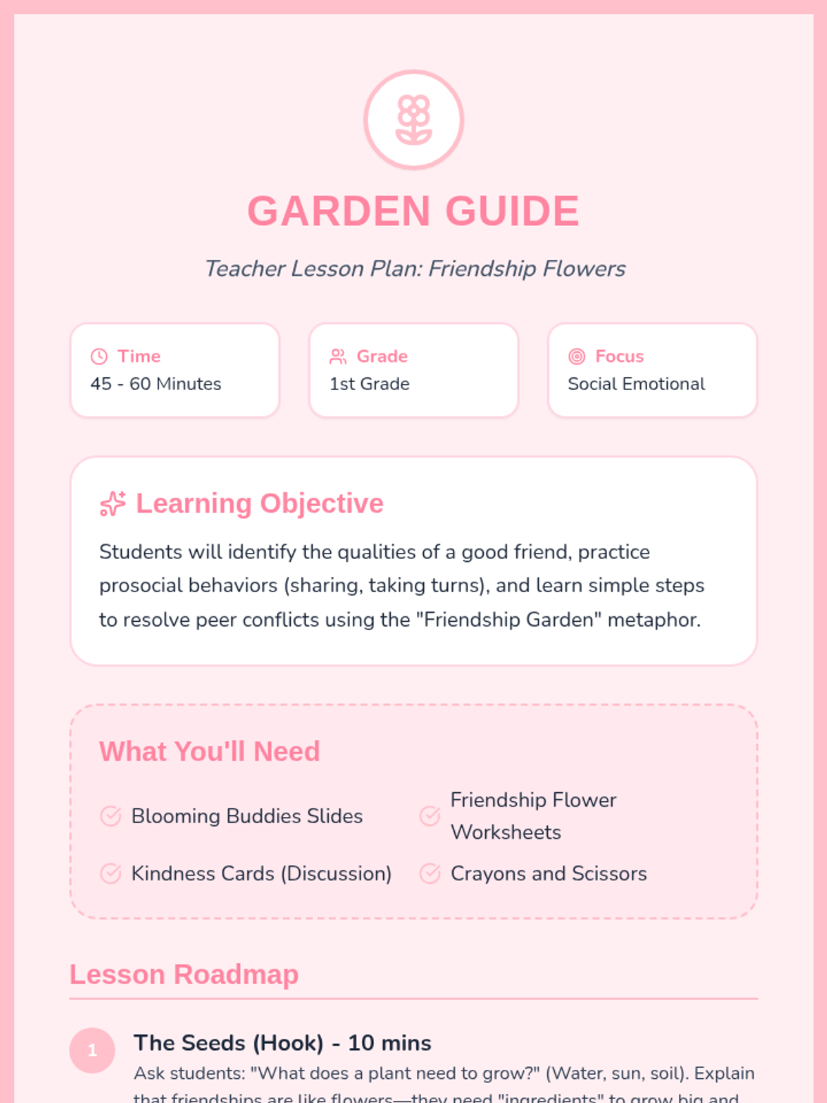 A heartwarming lesson for 1st graders using a garden metaphor to teach the ingredients of a good friendship, how to nurture connections, and how to resolve small conflicts through role-play and creative activities.