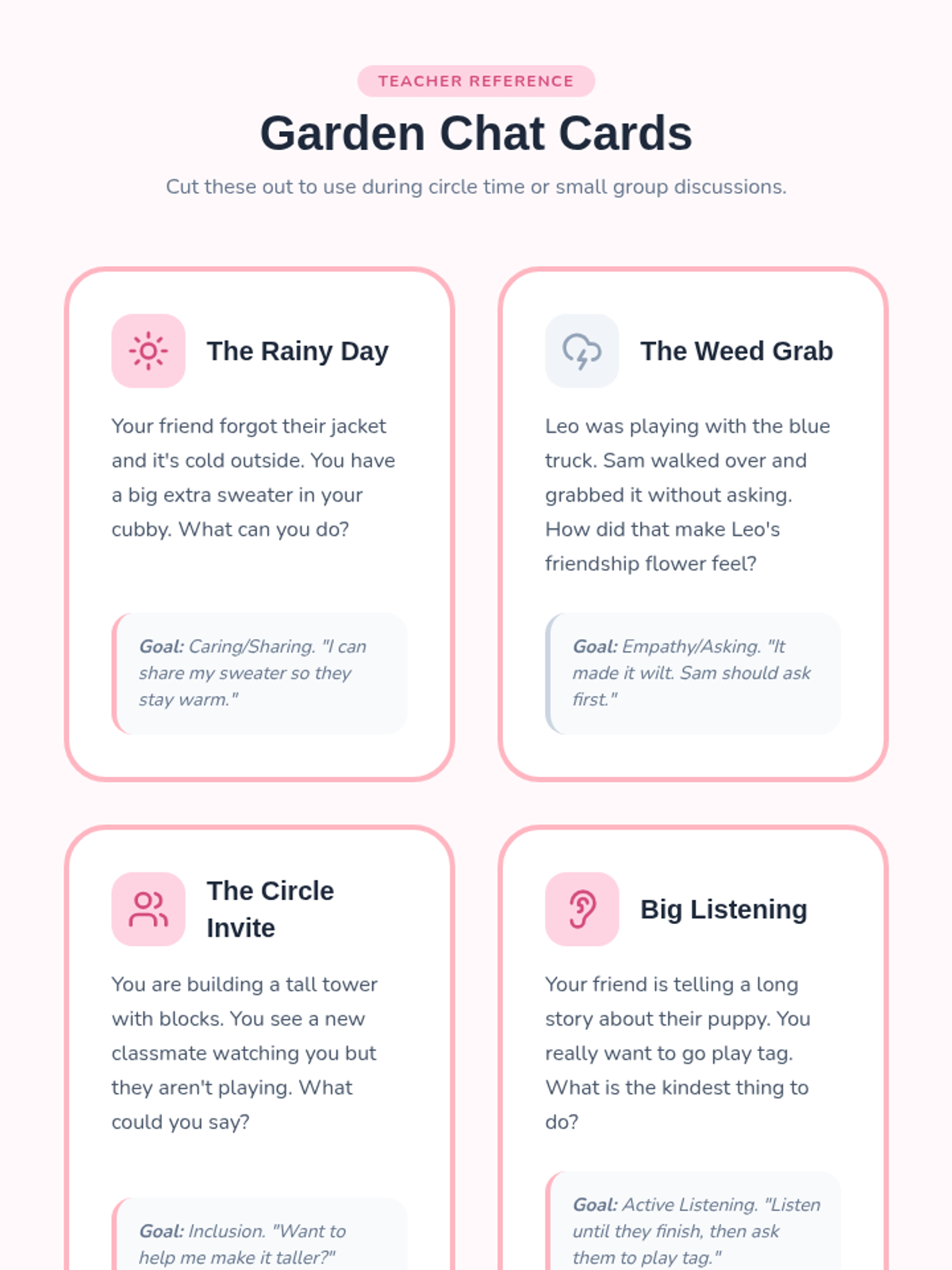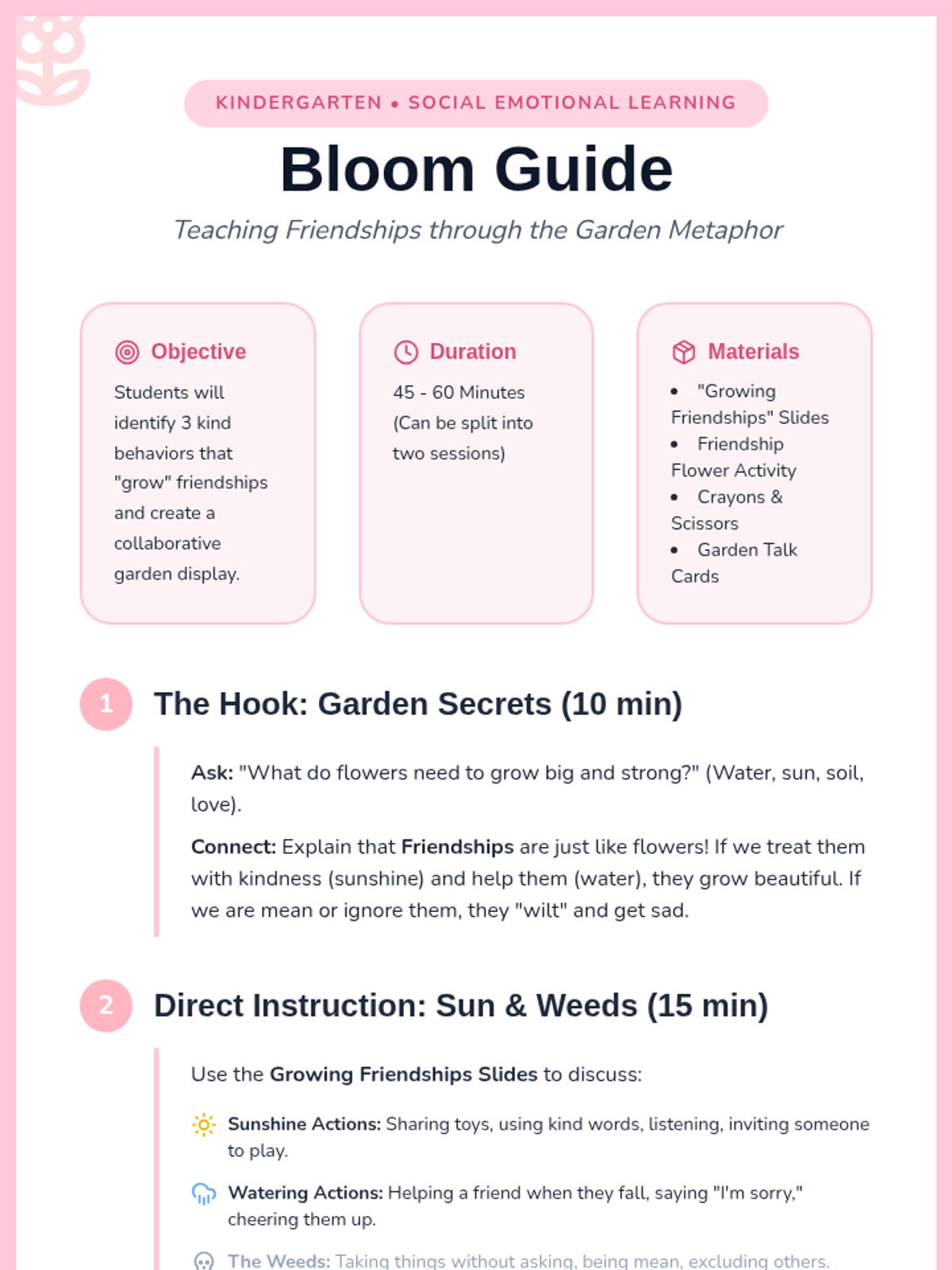 A Kindergarten lesson that uses the metaphor of a garden to teach social skills, empathy, and positive friendship behaviors through collaborative activity and discussion.