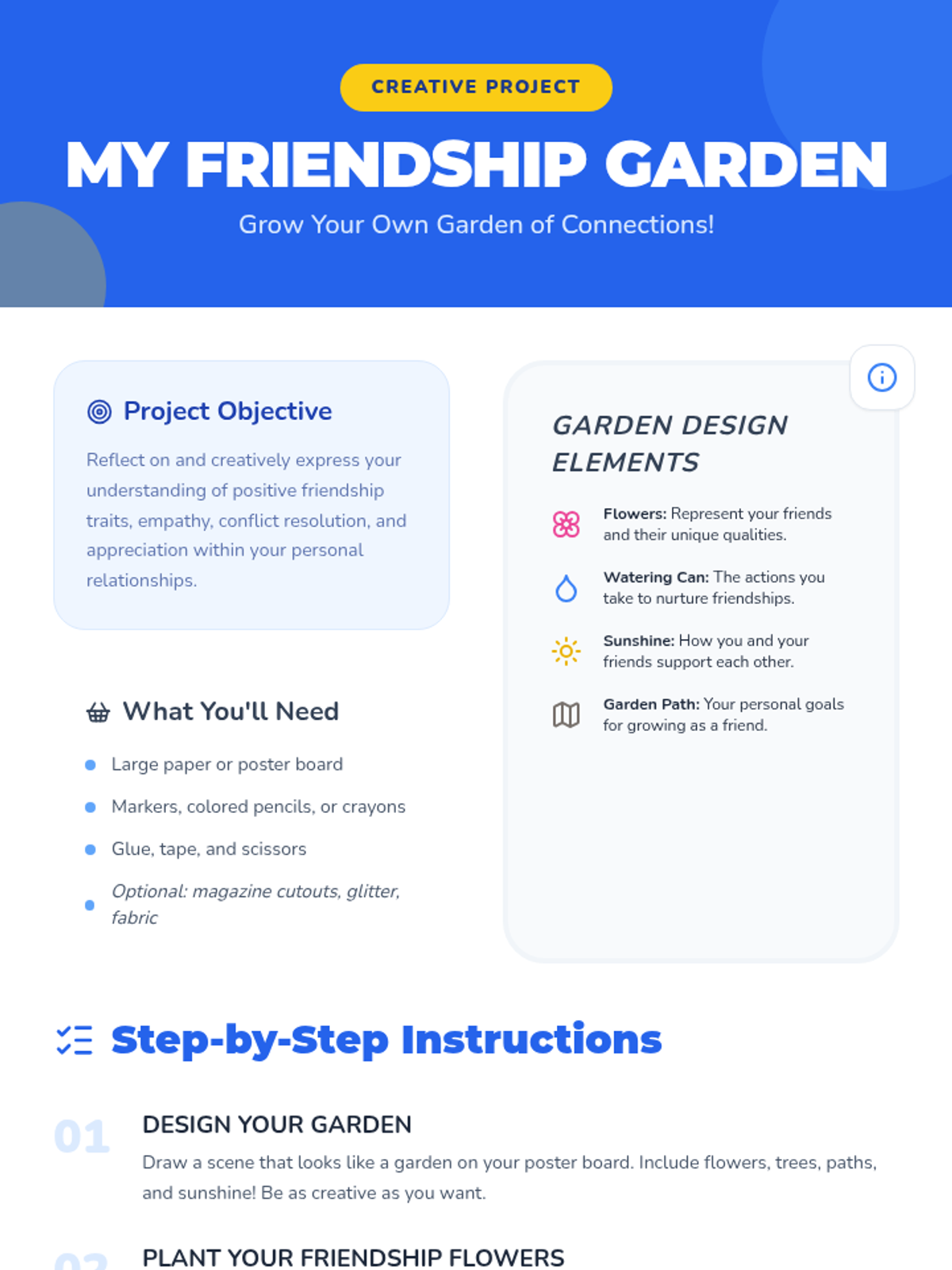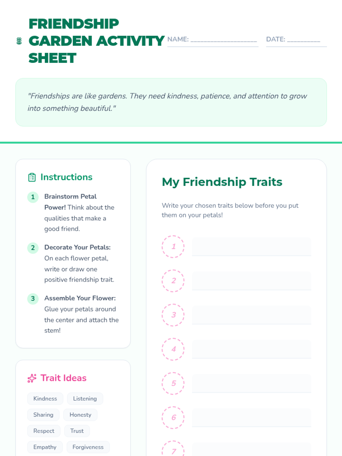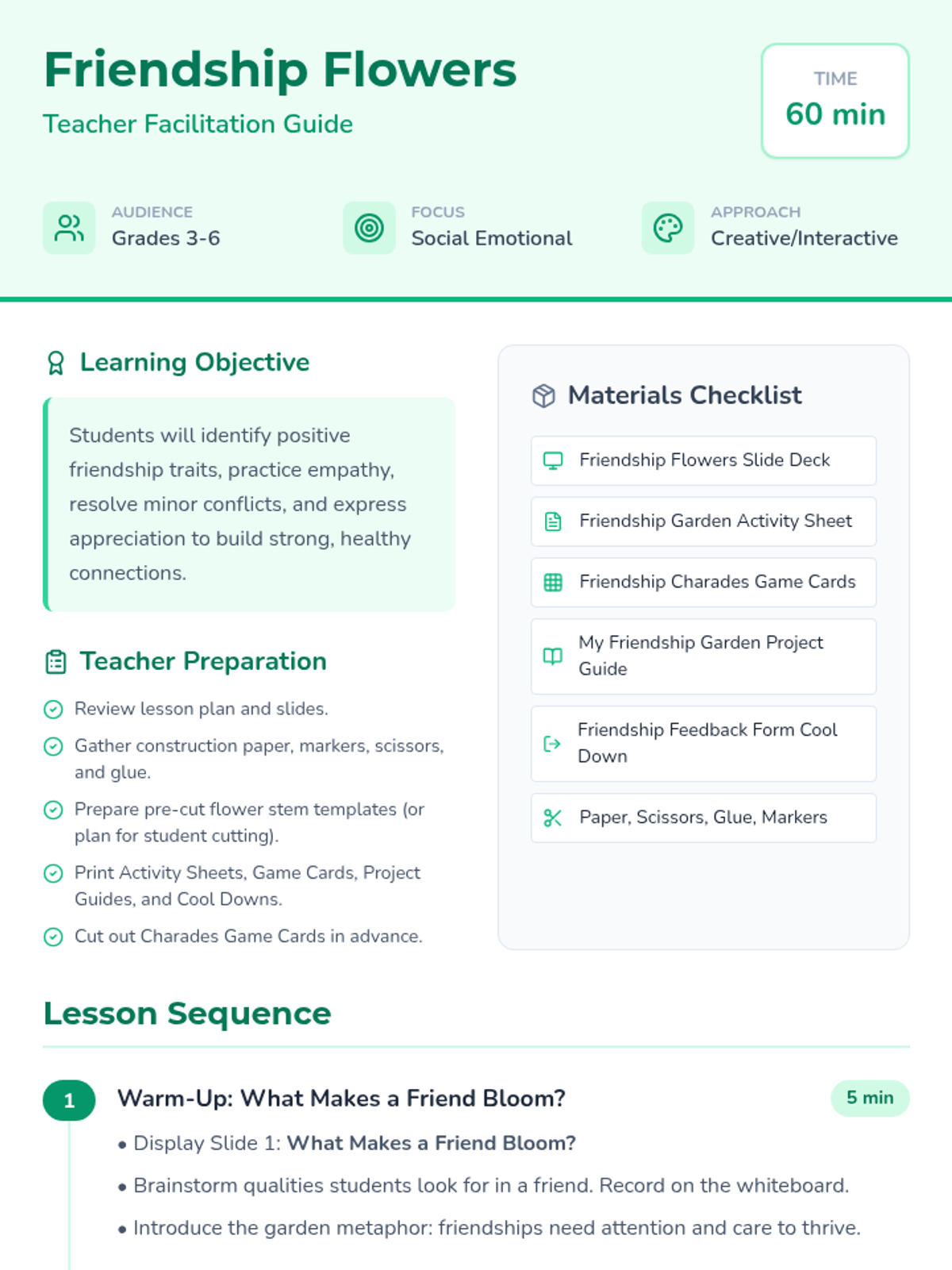 An engaging lesson for grades 3-6 exploring healthy friendship traits, empathy, and conflict resolution through a garden-themed creative project and interactive games.