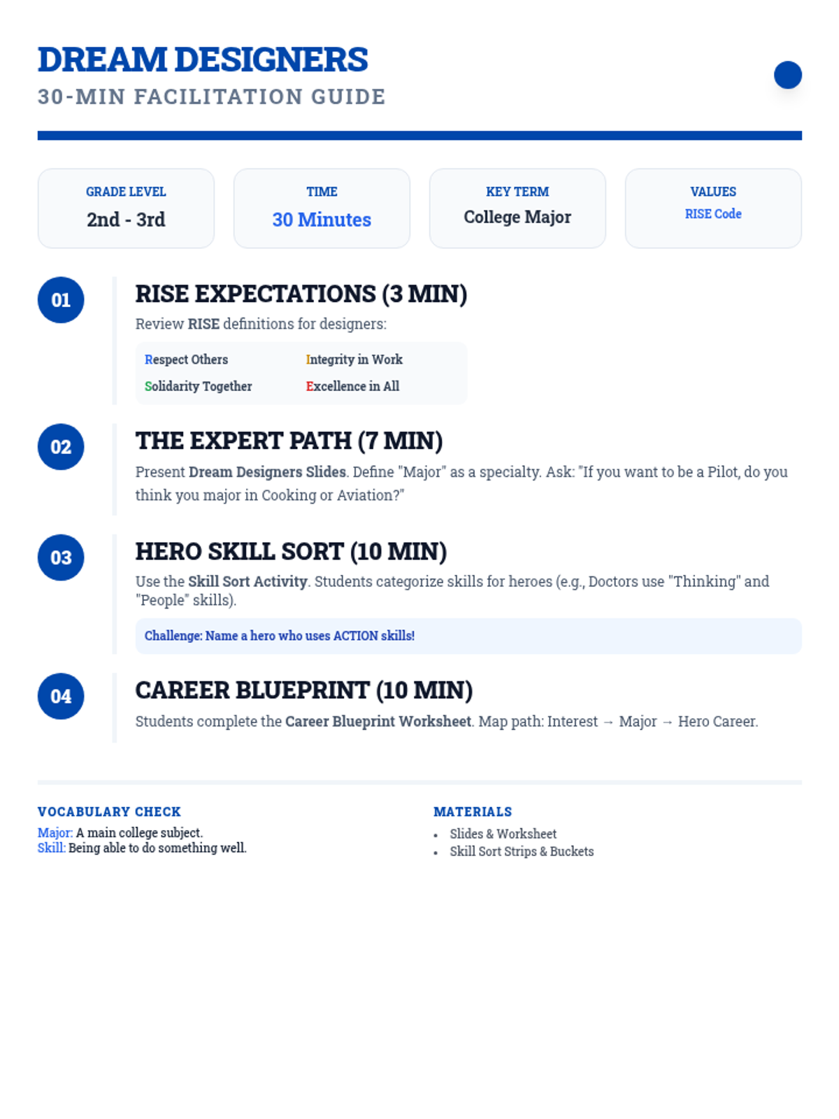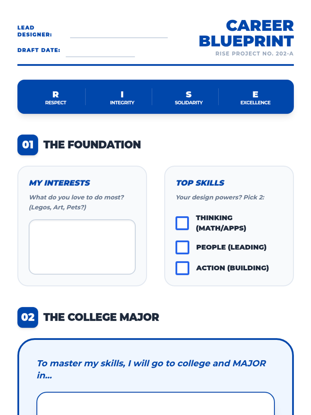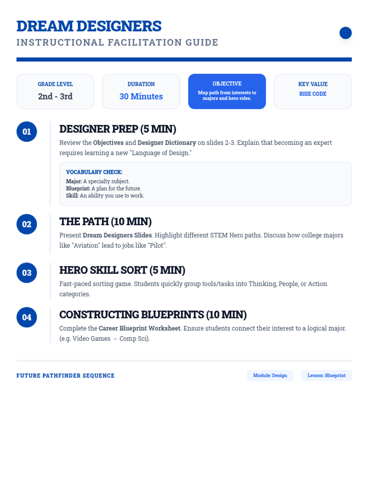 An advanced career exploration for 2nd-3rd graders, focusing on 'Majors', skill sets, and the step-by-step 'Blueprint' needed to reach career goals.