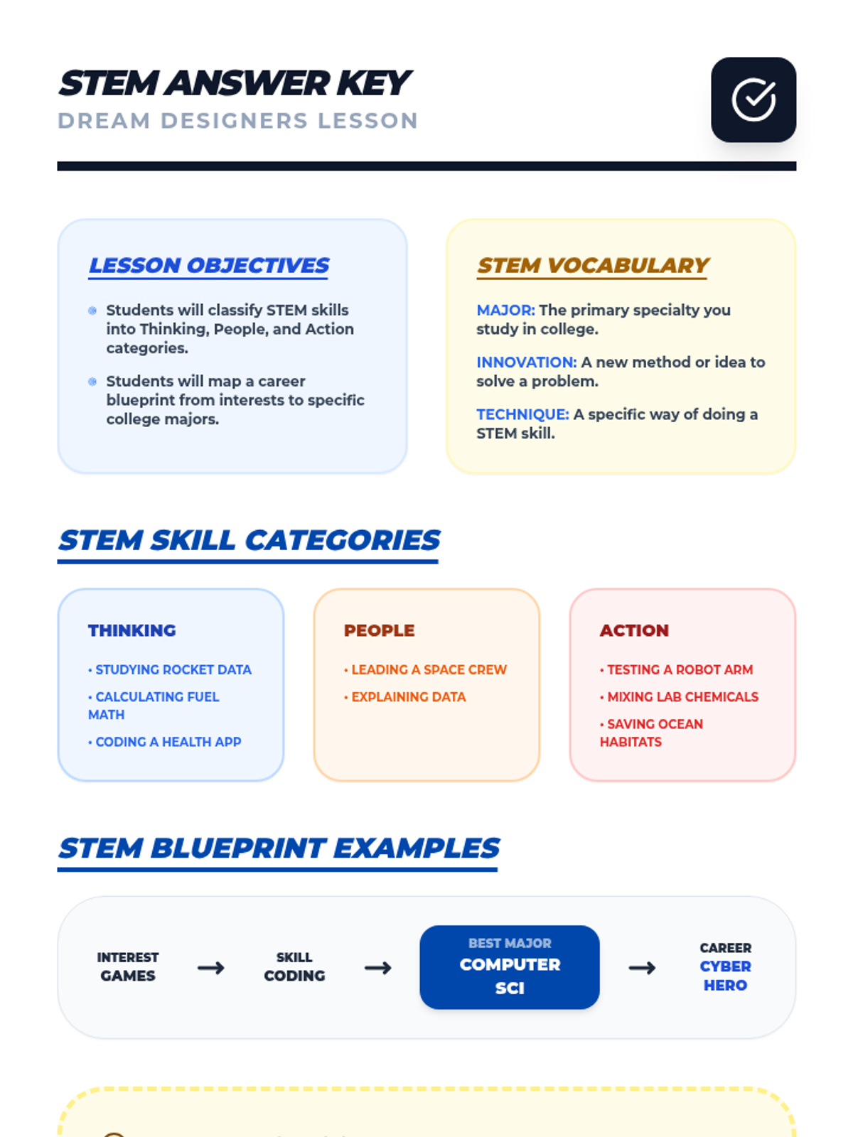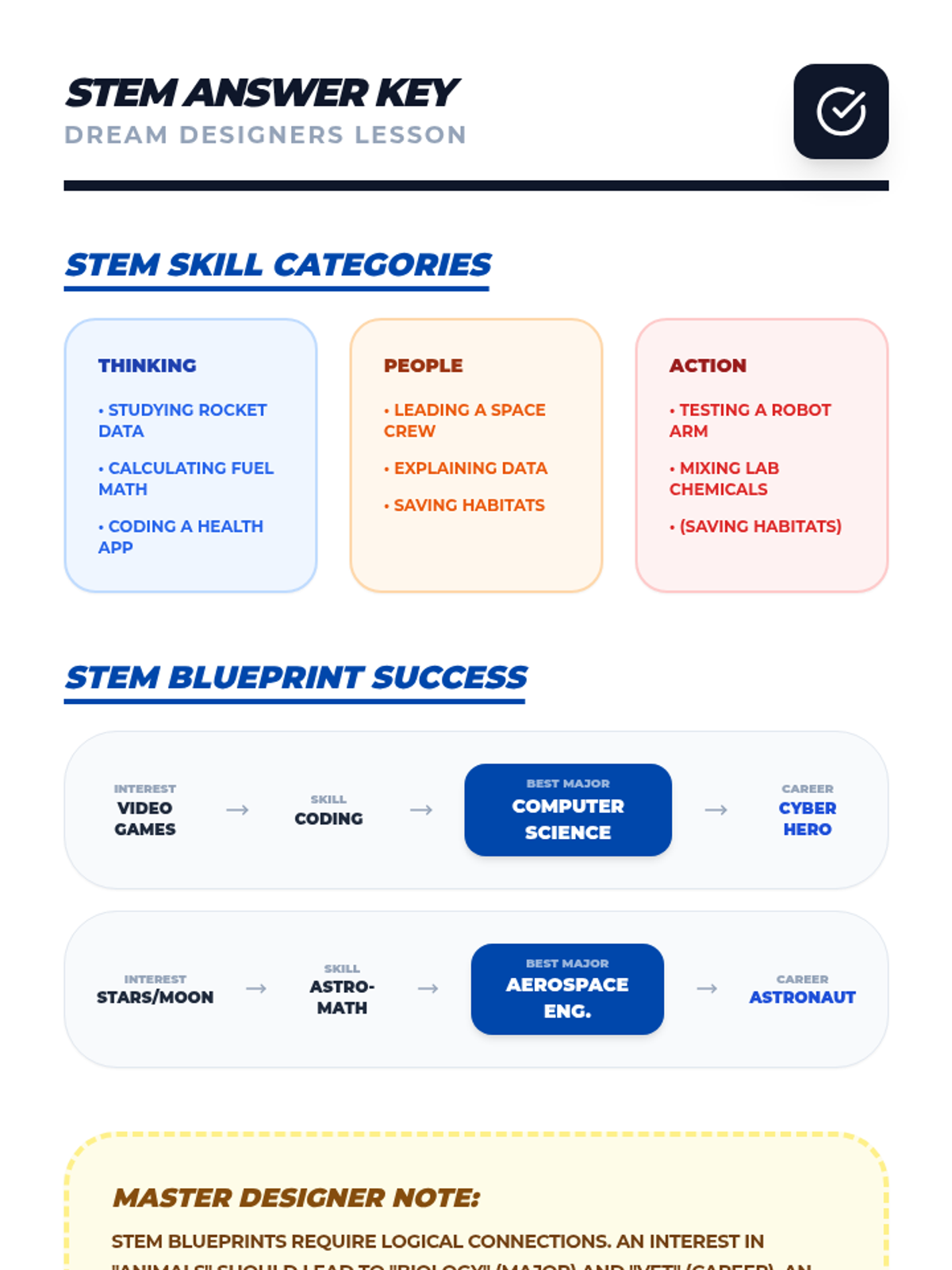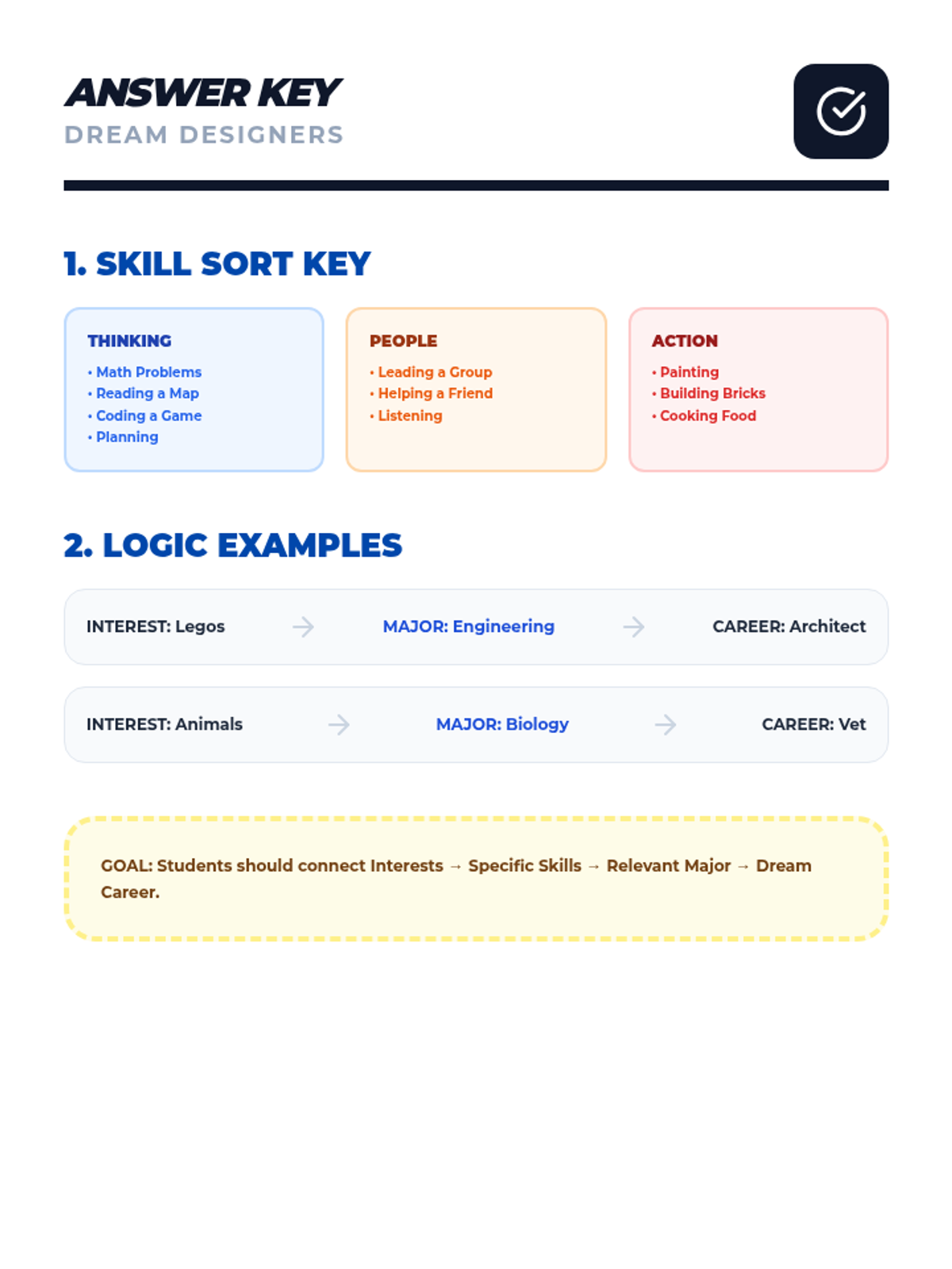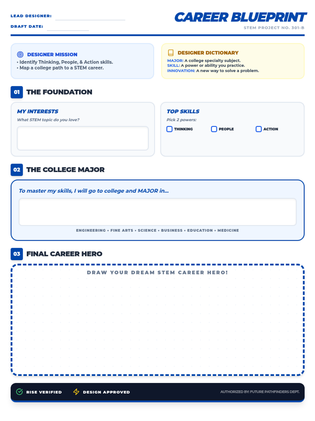 An advanced career exploration for 2nd-3rd graders, focusing on 'Majors', skill sets, and the step-by-step 'Blueprint' needed to reach career goals.