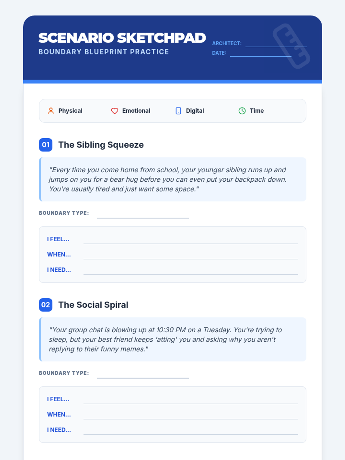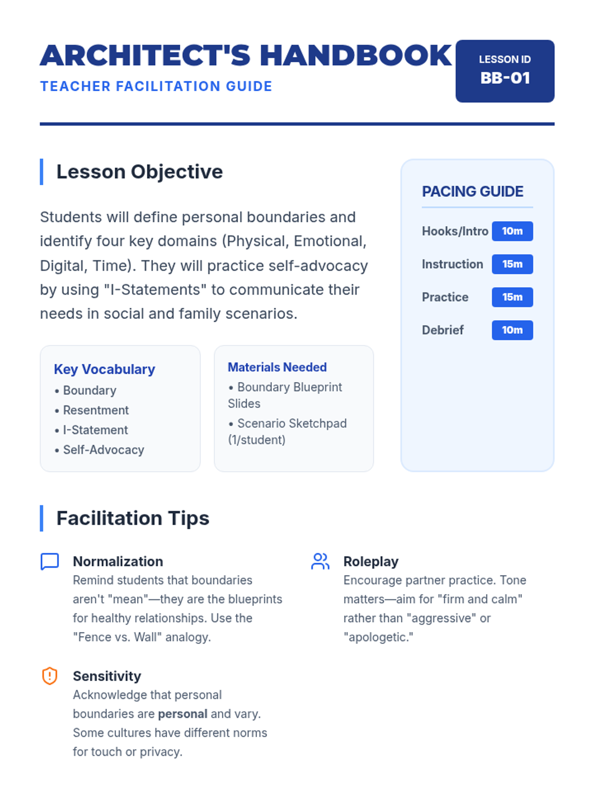 A comprehensive lesson for middle school students on identifying, communicating, and maintaining personal boundaries across physical, emotional, and digital spaces using an architectural blueprint theme.