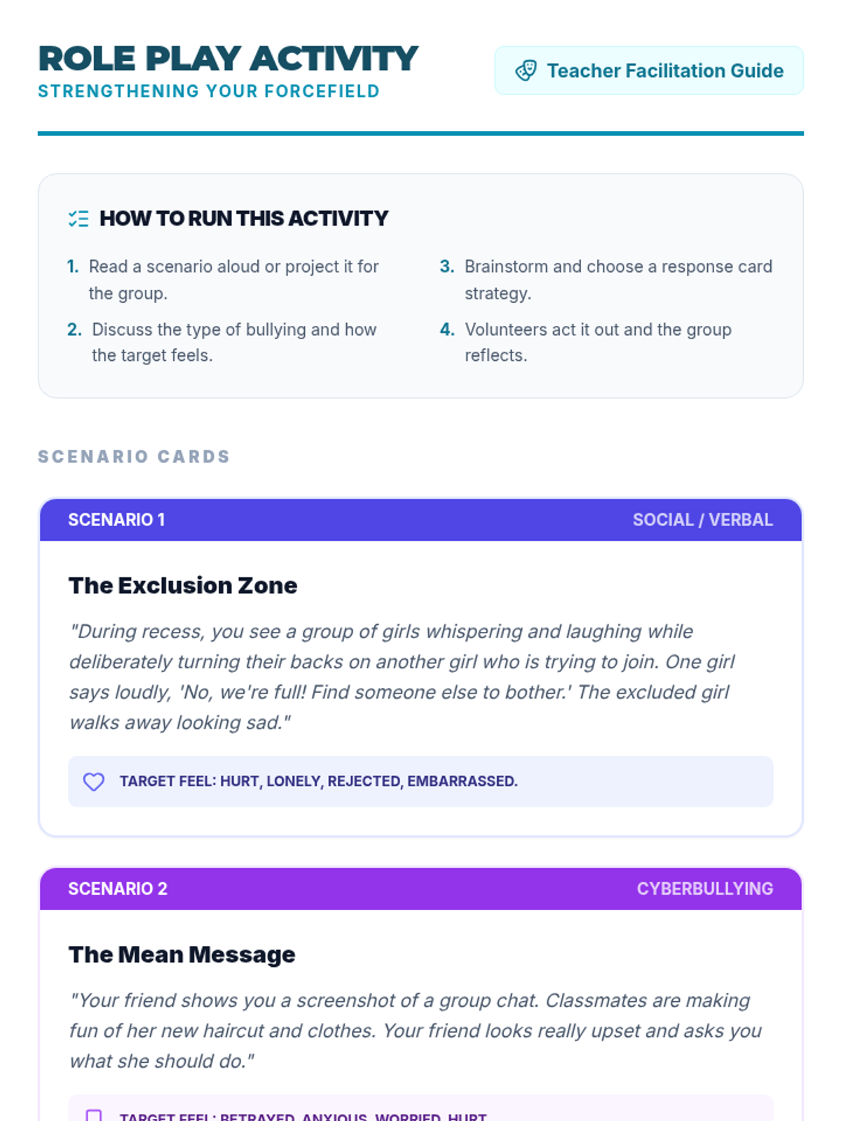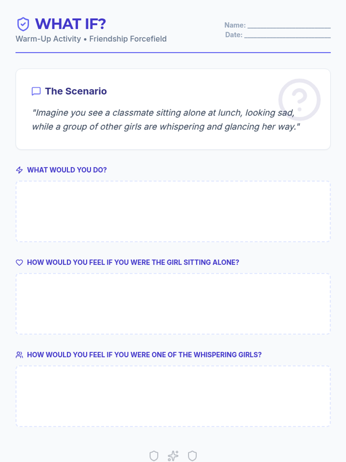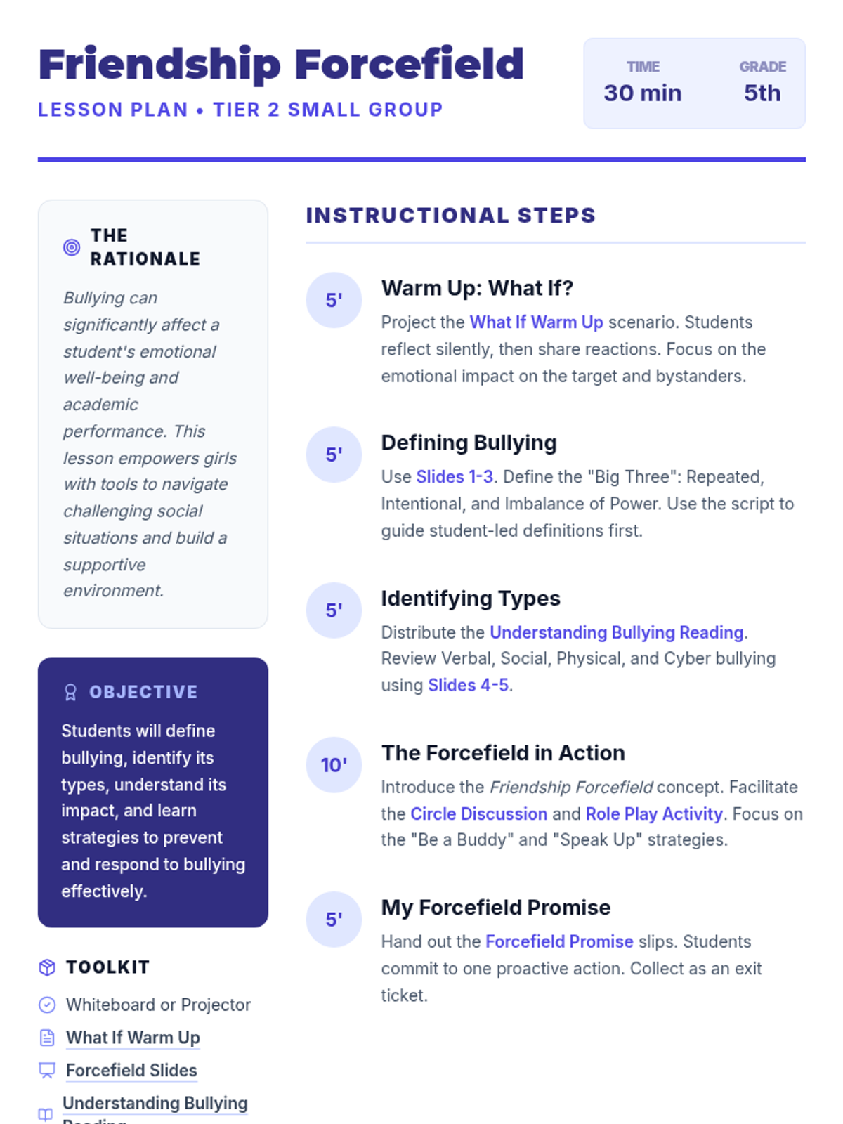 A 30-minute Tier 2 small group lesson for 5th-grade girls focusing on defining bullying, recognizing its types, and building a 'Friendship Forcefield' through proactive social strategies and role-playing.