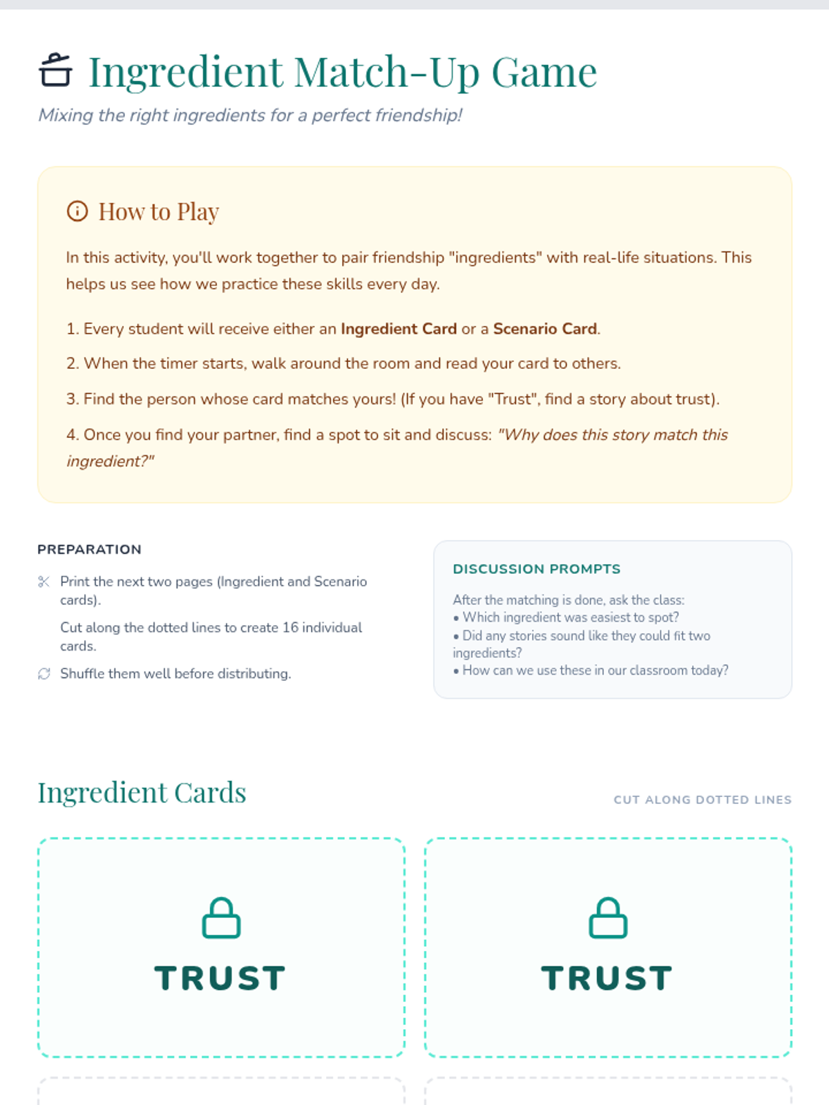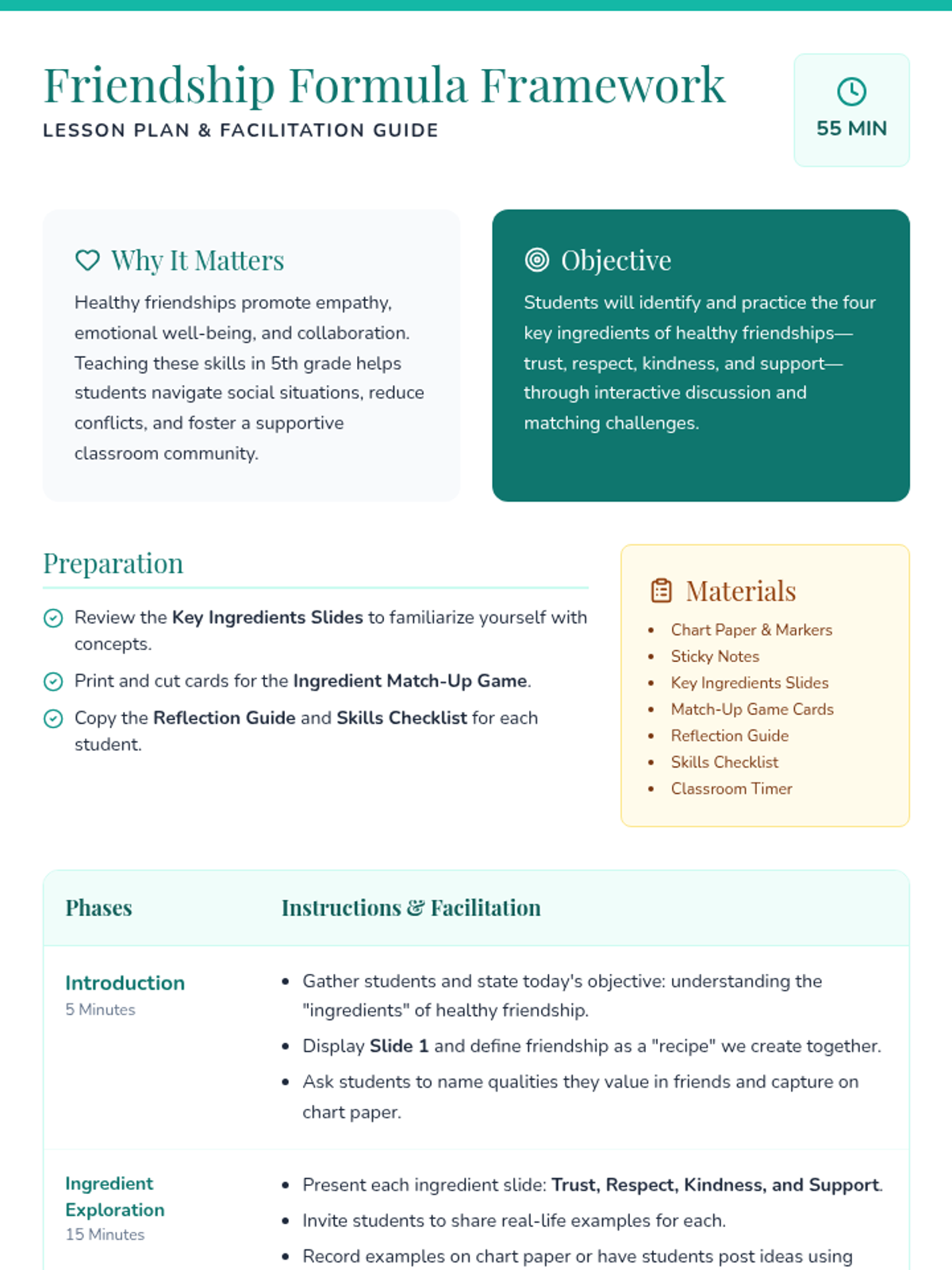 In this interactive 5th grade classroom lesson, students explore the key ingredients of healthy friendships through group challenges and partner work. Understanding these skills helps foster empathy, collaboration, and positive peer relationships both in and out of school.