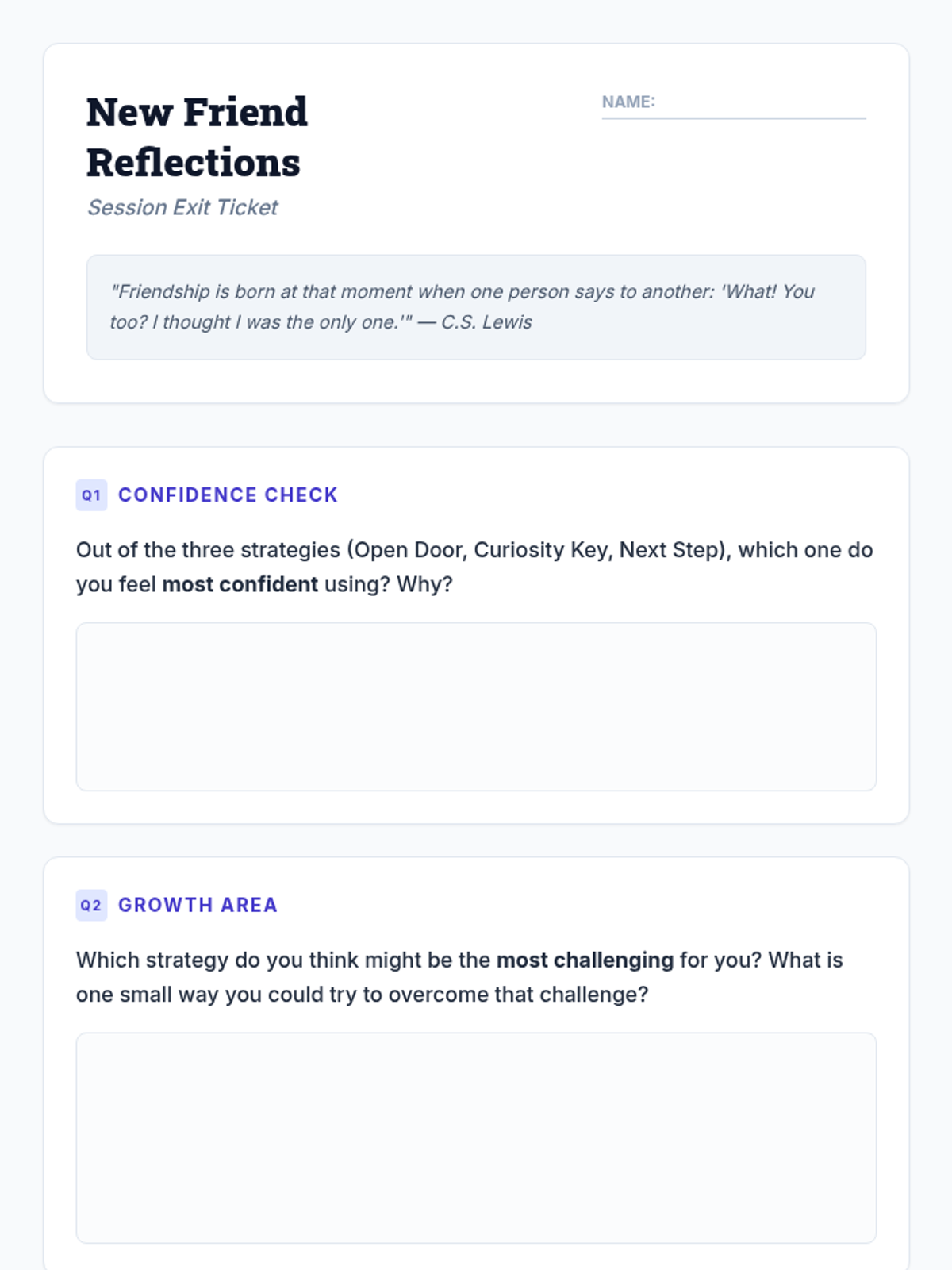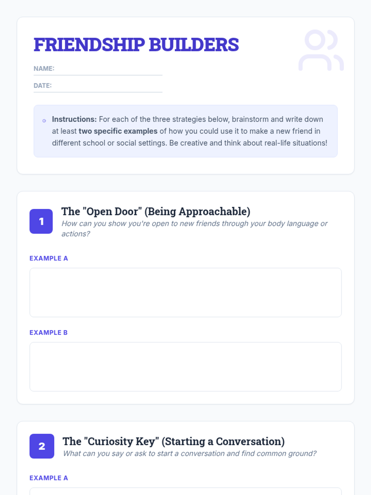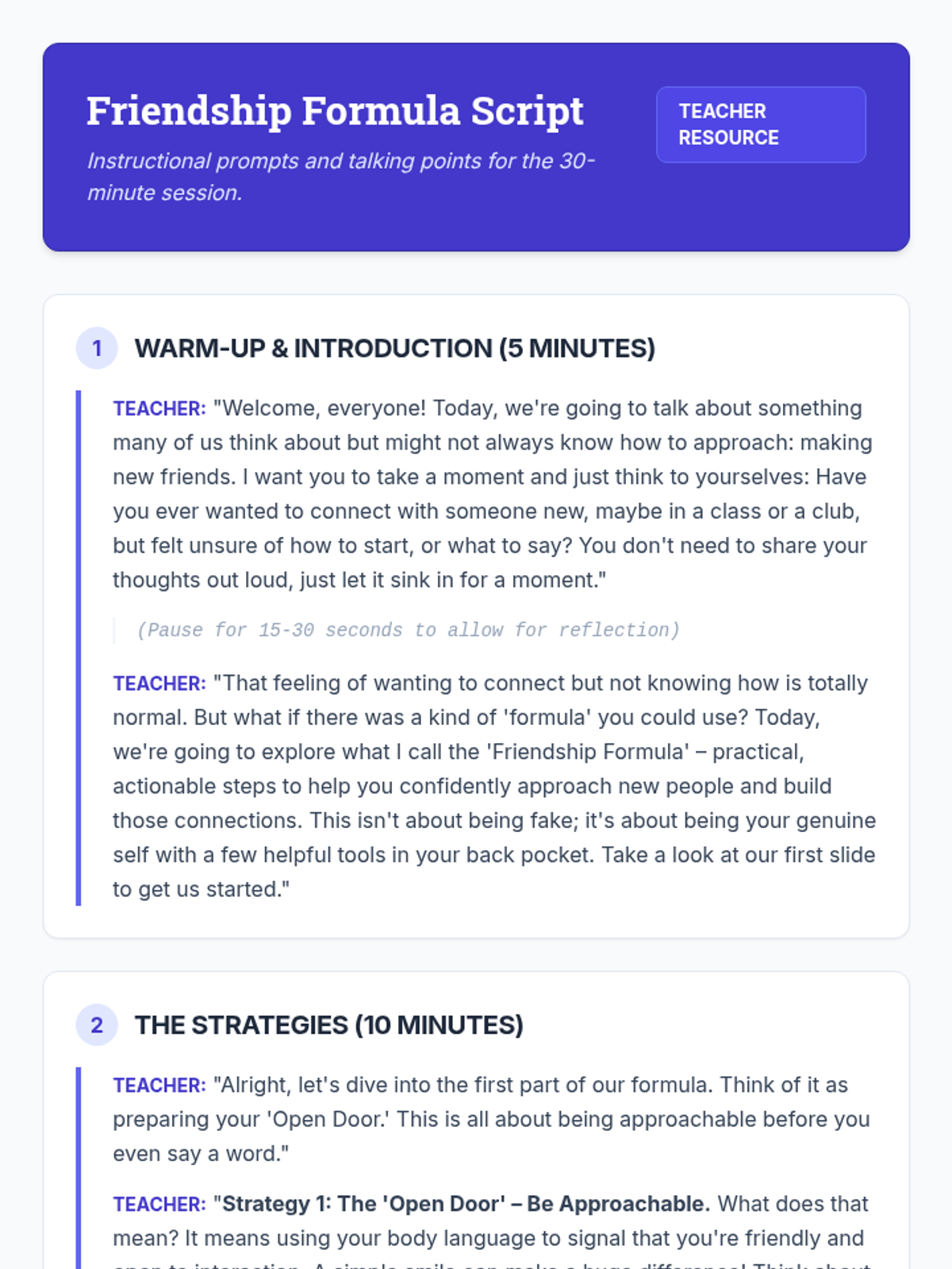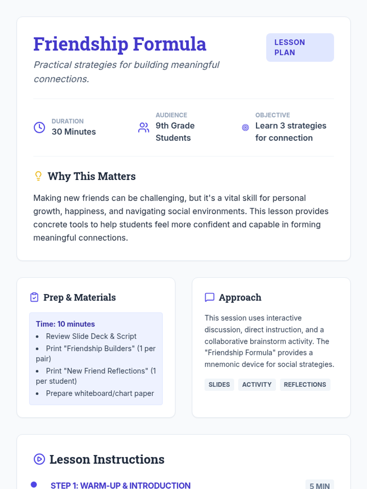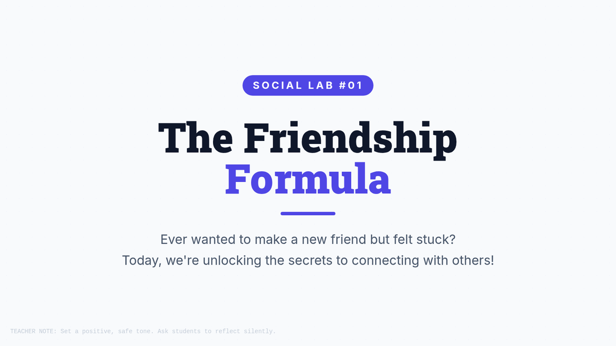 This 30-minute Tier 2 lesson for 9th-grade students focuses on practical strategies for making new friends. Using the 'Friendship Formula' framework—The Open Door, The Curiosity Key, and The Next Step—students learn actionable steps to initiate and build meaningful social connections.