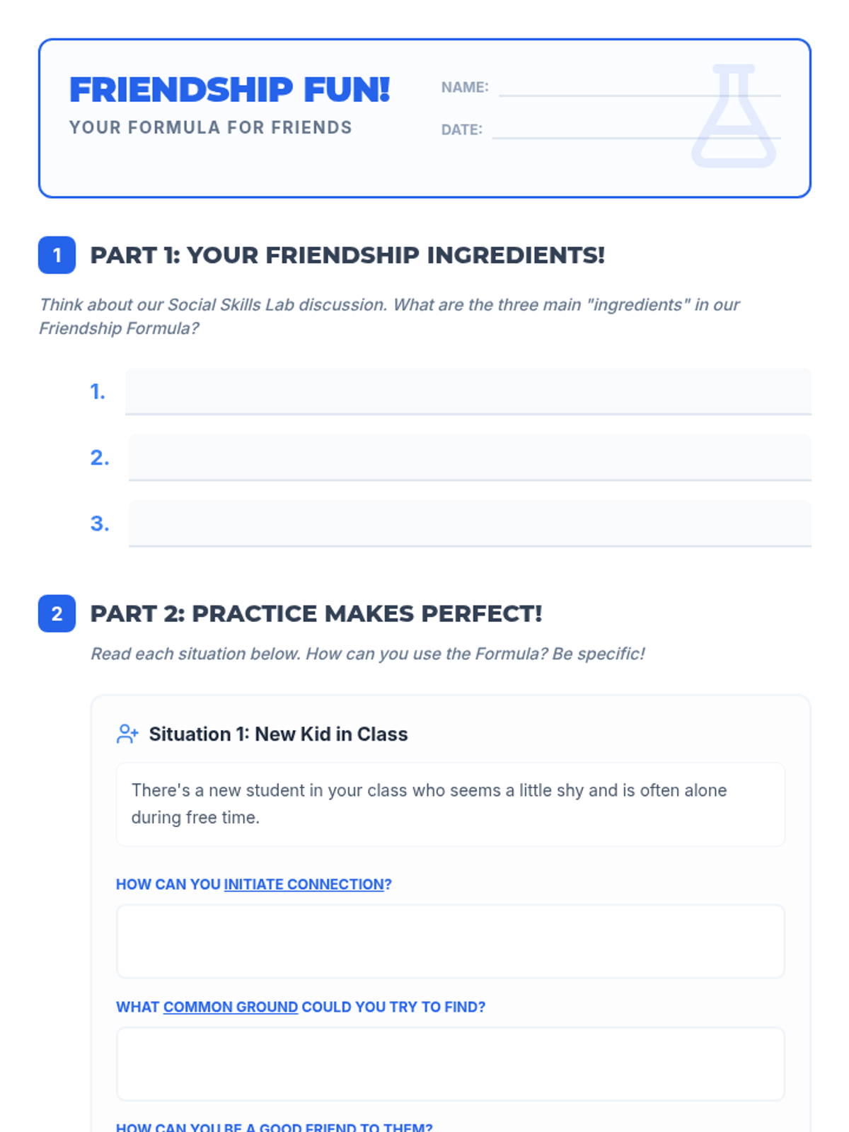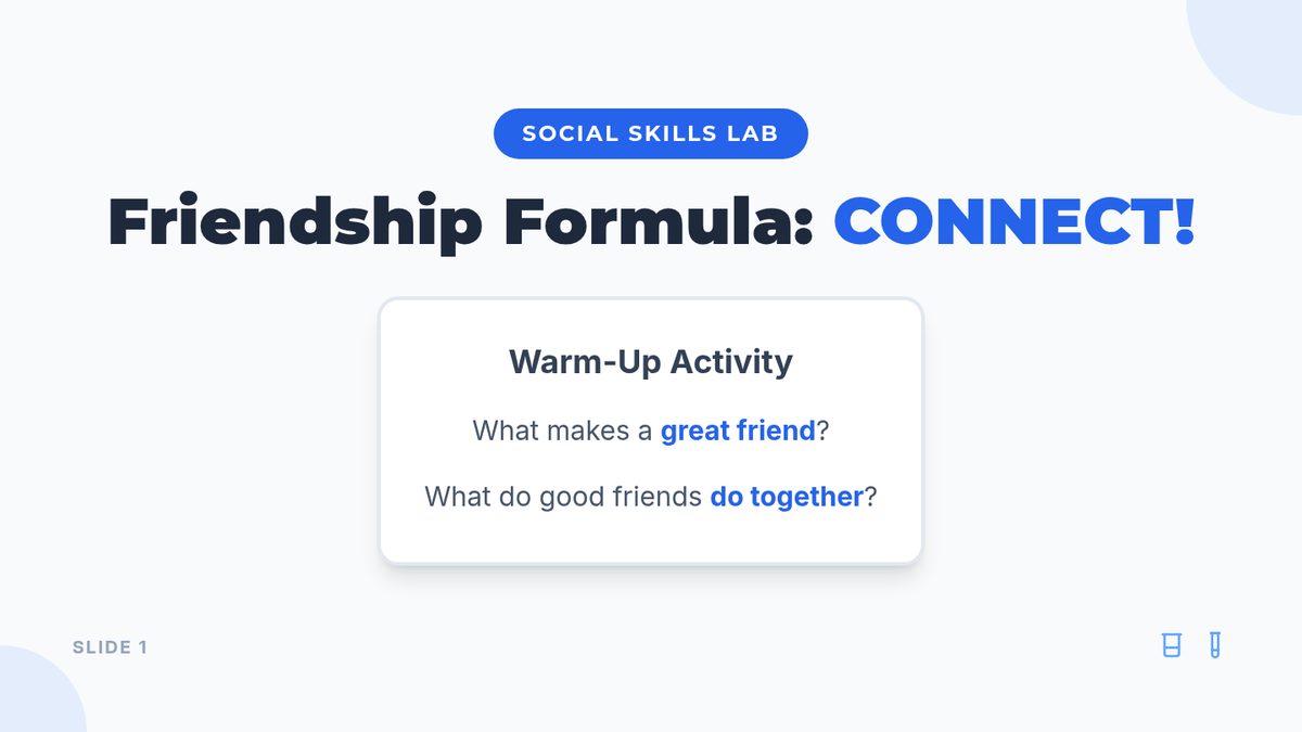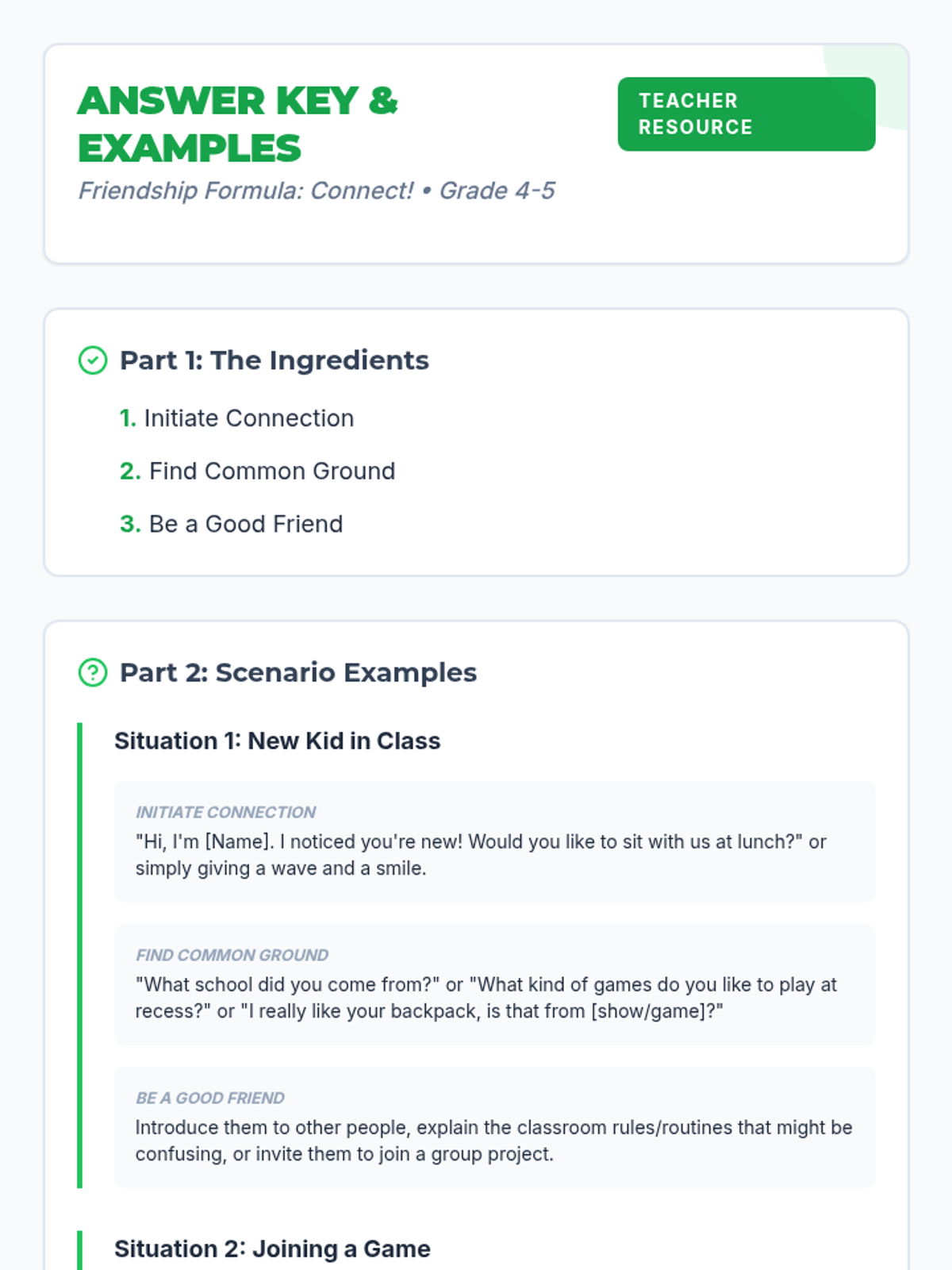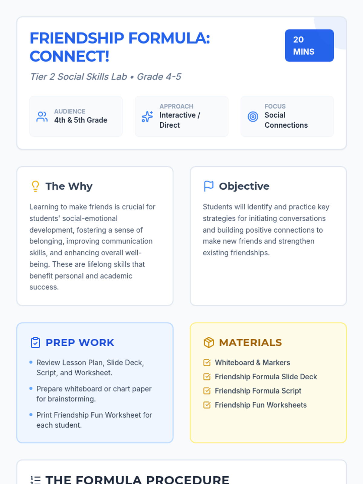 A 20-minute Tier 2 small group lesson for 4th and 5th graders focusing on the 'Friendship Formula': Initiate Connection, Find Common Ground, and Be a Good Friend. Students will learn and practice actionable strategies to build and strengthen social connections.