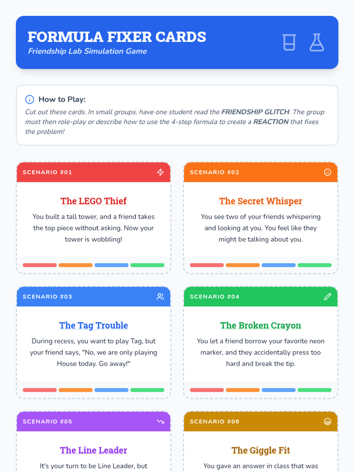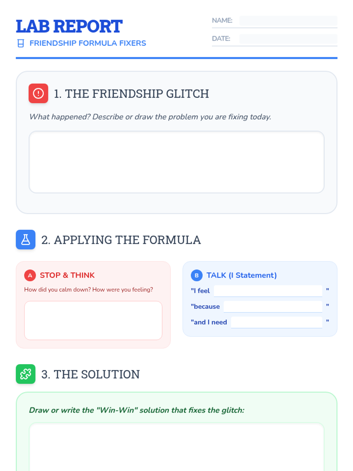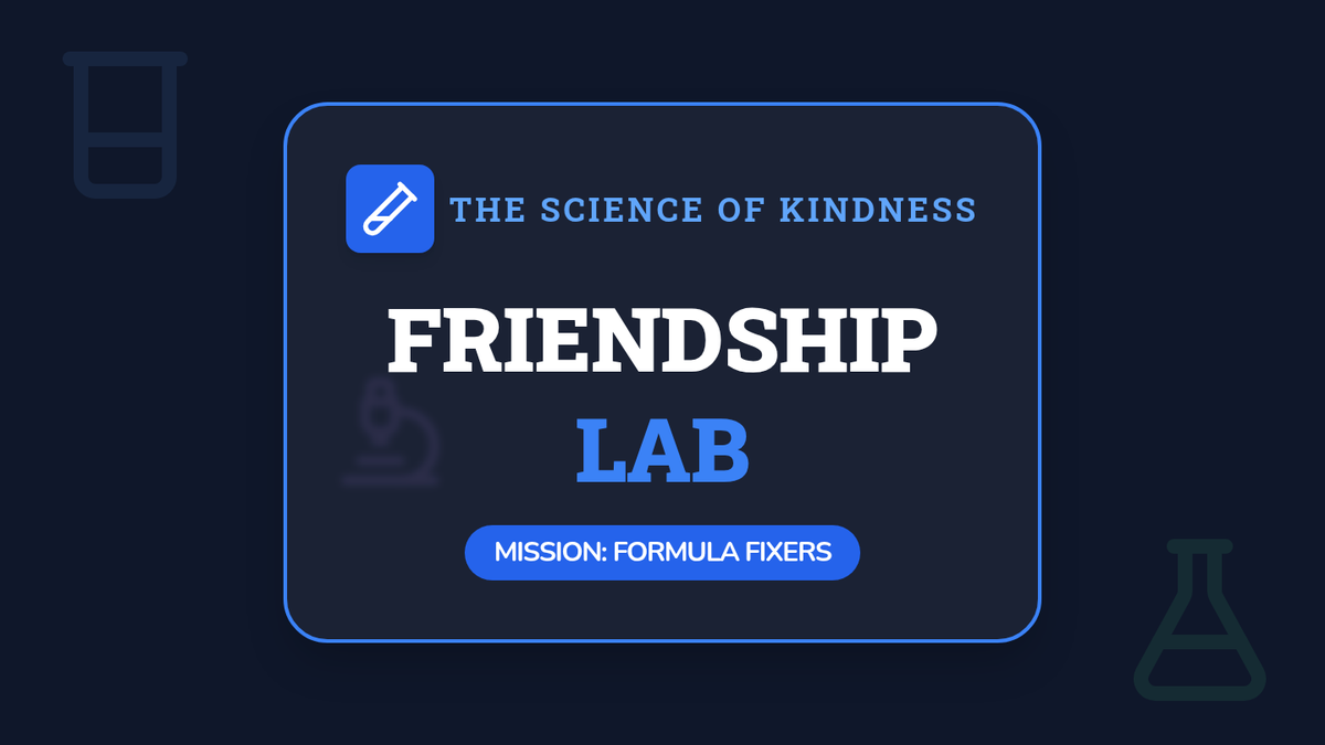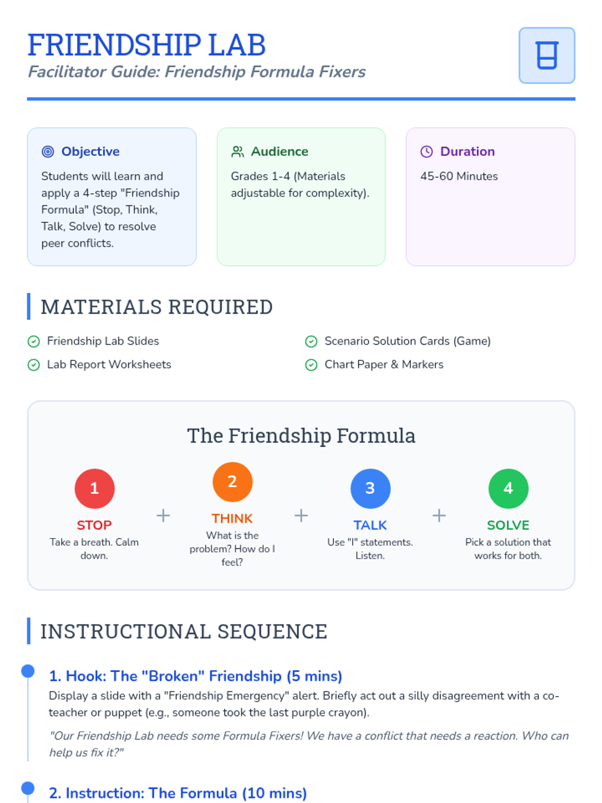 A social-emotional learning lesson where students become 'Formula Fixers' in a Friendship Lab, learning a 4-step process (Stop, Think, Talk, Solve) to resolve peer conflicts through role-play and collaborative problem-solving.