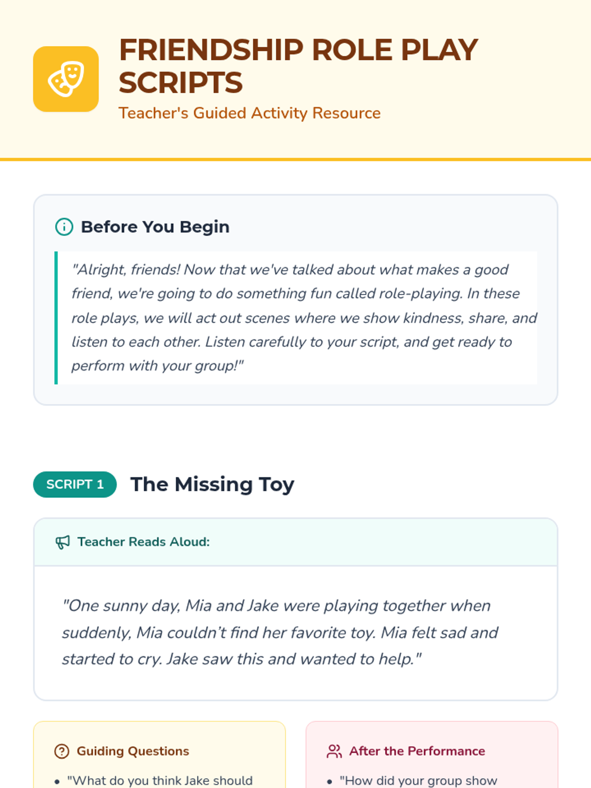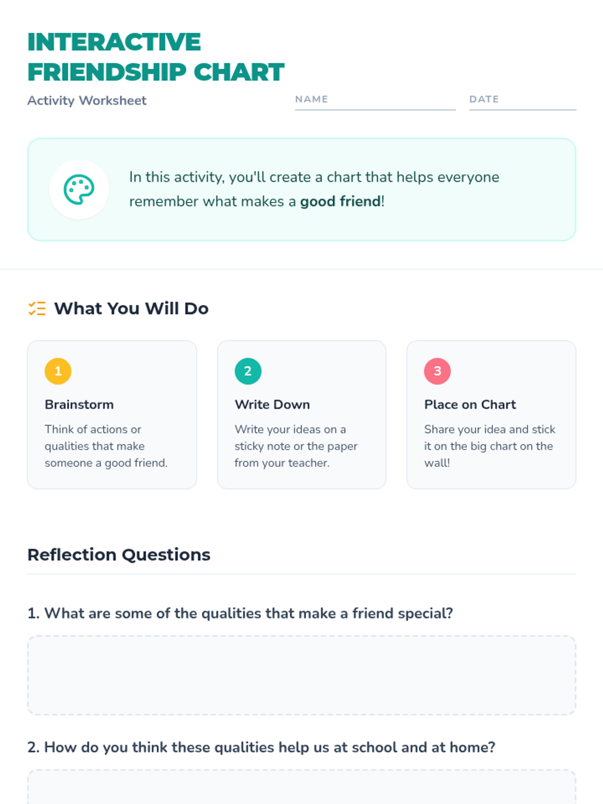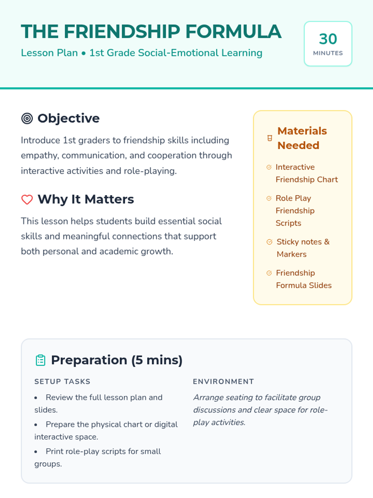 A heart-warming lesson for 1st graders on the 'formula' for being a great friend, focusing on empathy, sharing, and communication through role-play and interactive charting.