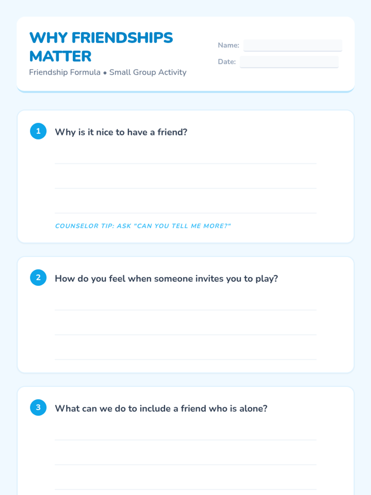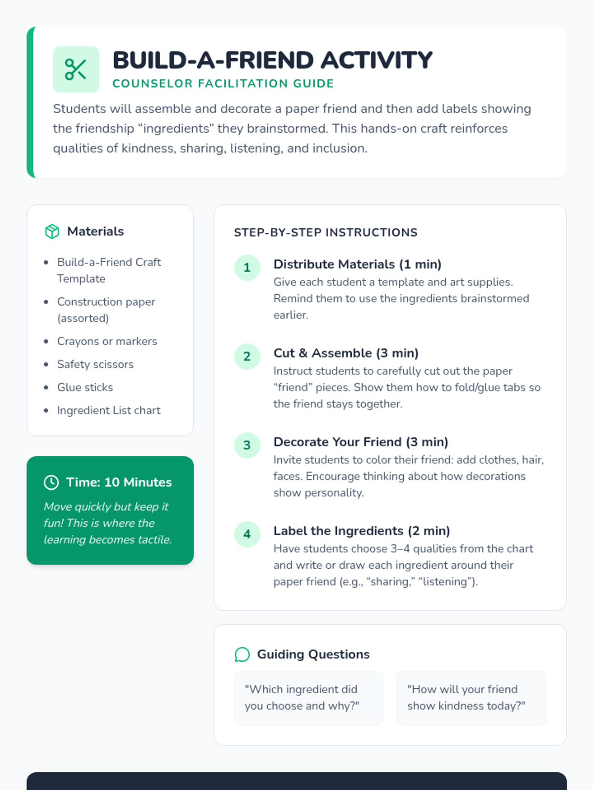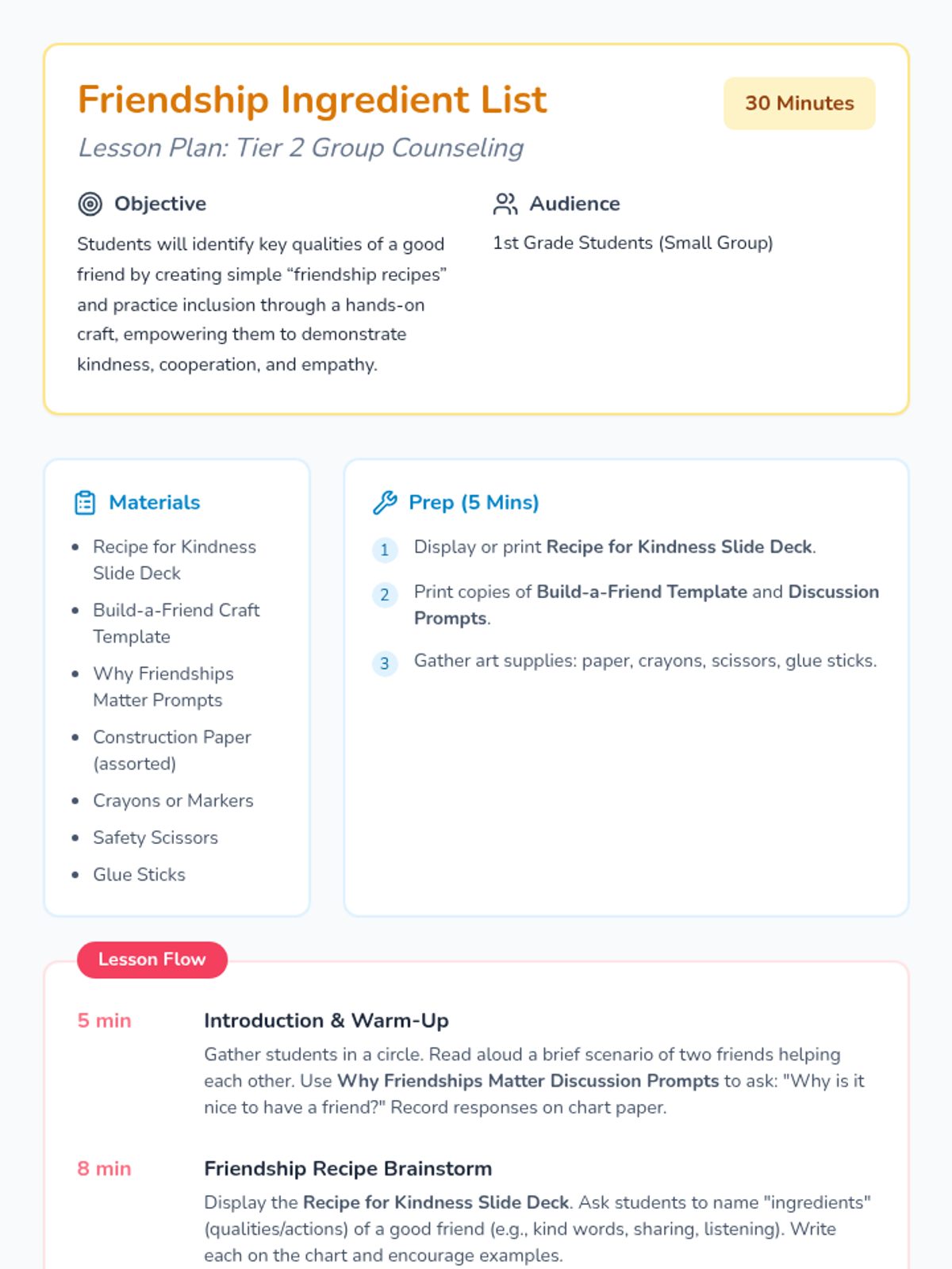 A 30-minute Tier 2 small-group counseling lesson for 1st graders focused on identifying friendship qualities and practicing inclusion through a 'recipe' metaphor.