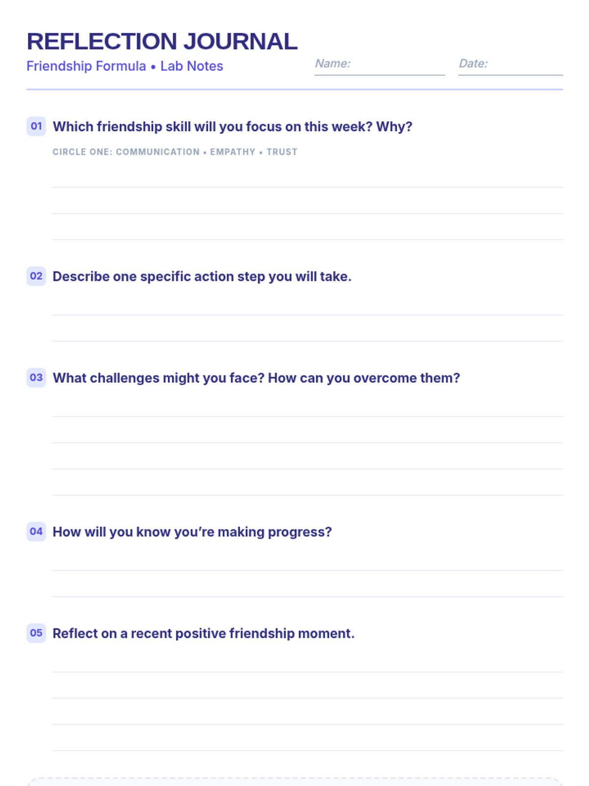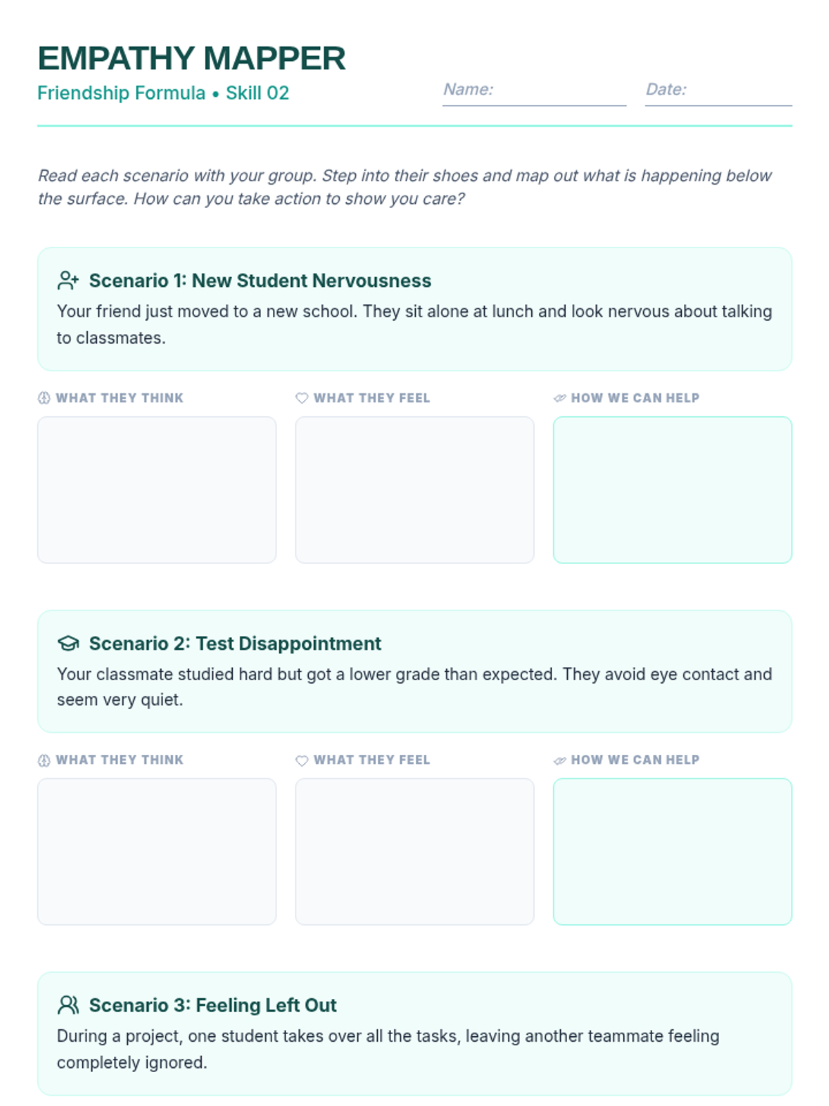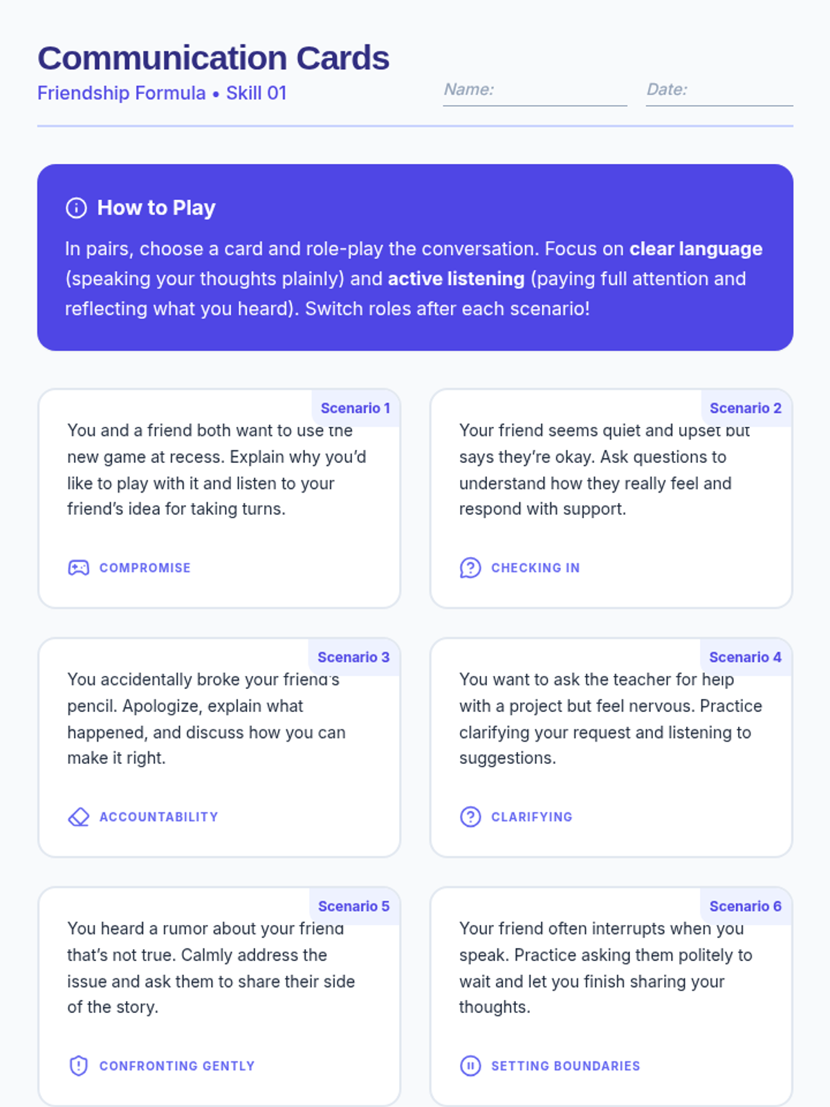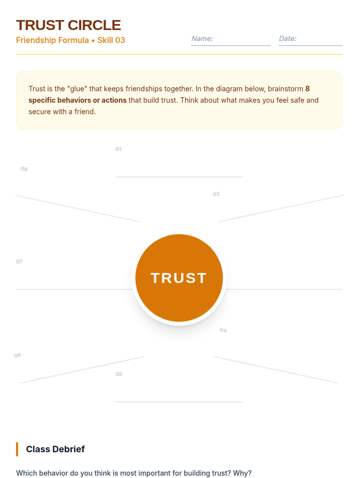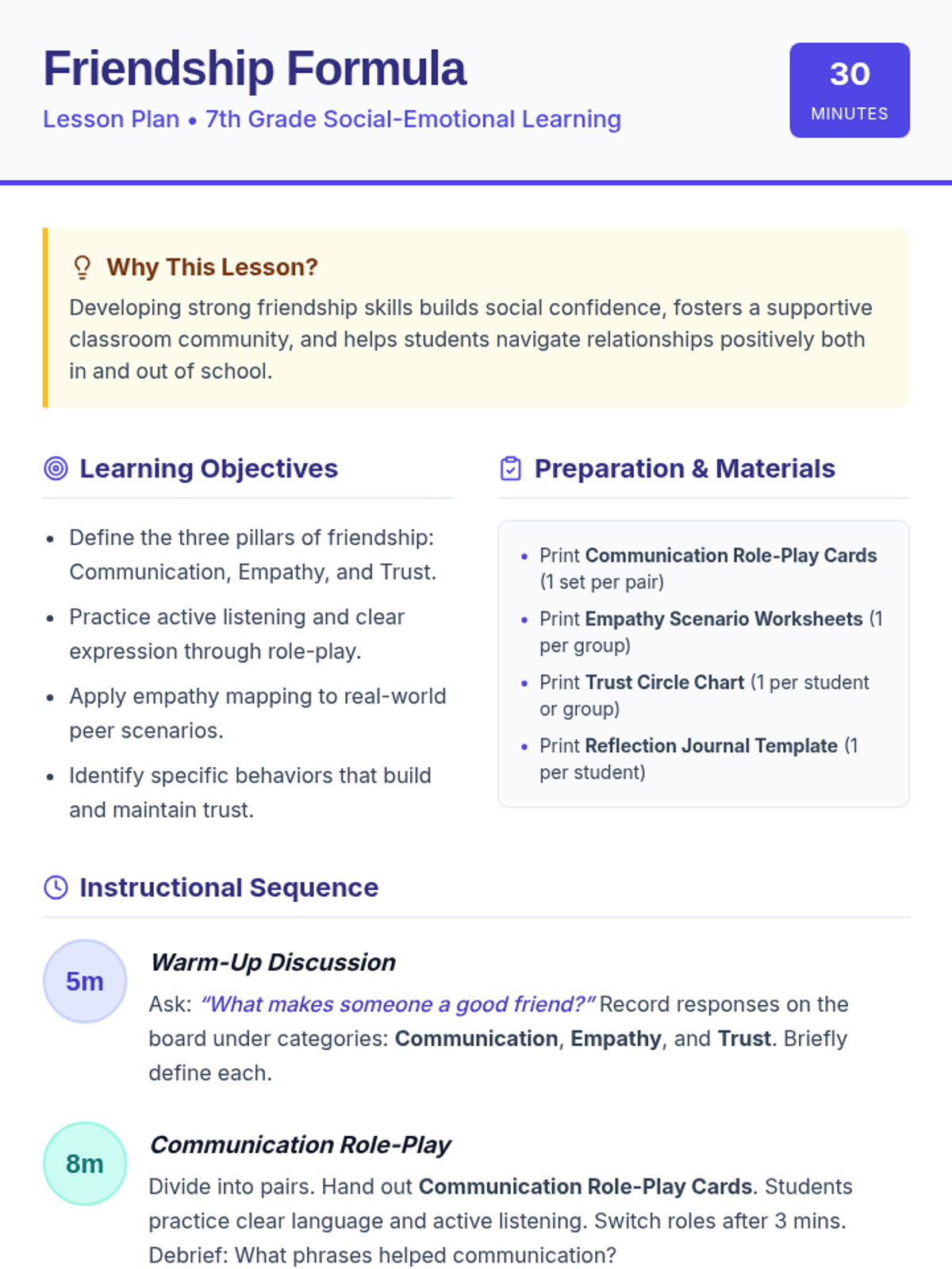 A 30-minute interactive lesson for 7th graders focusing on communication, empathy, and trust to build strong friendships and a supportive classroom community.