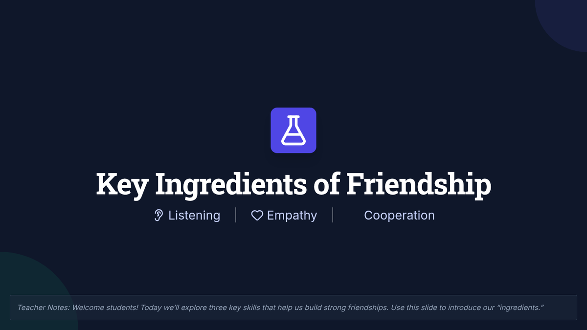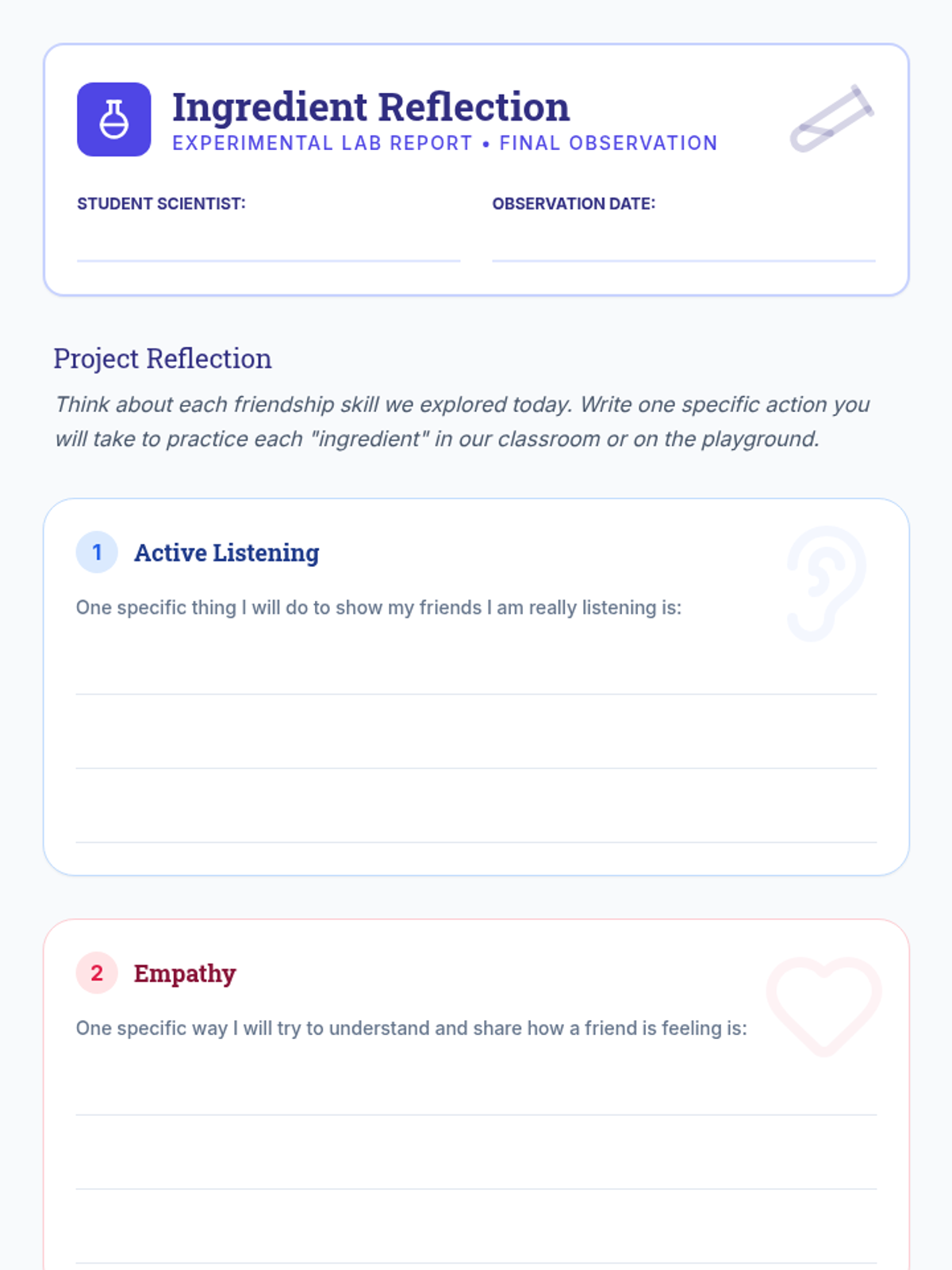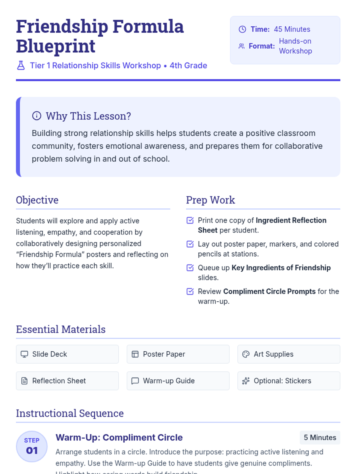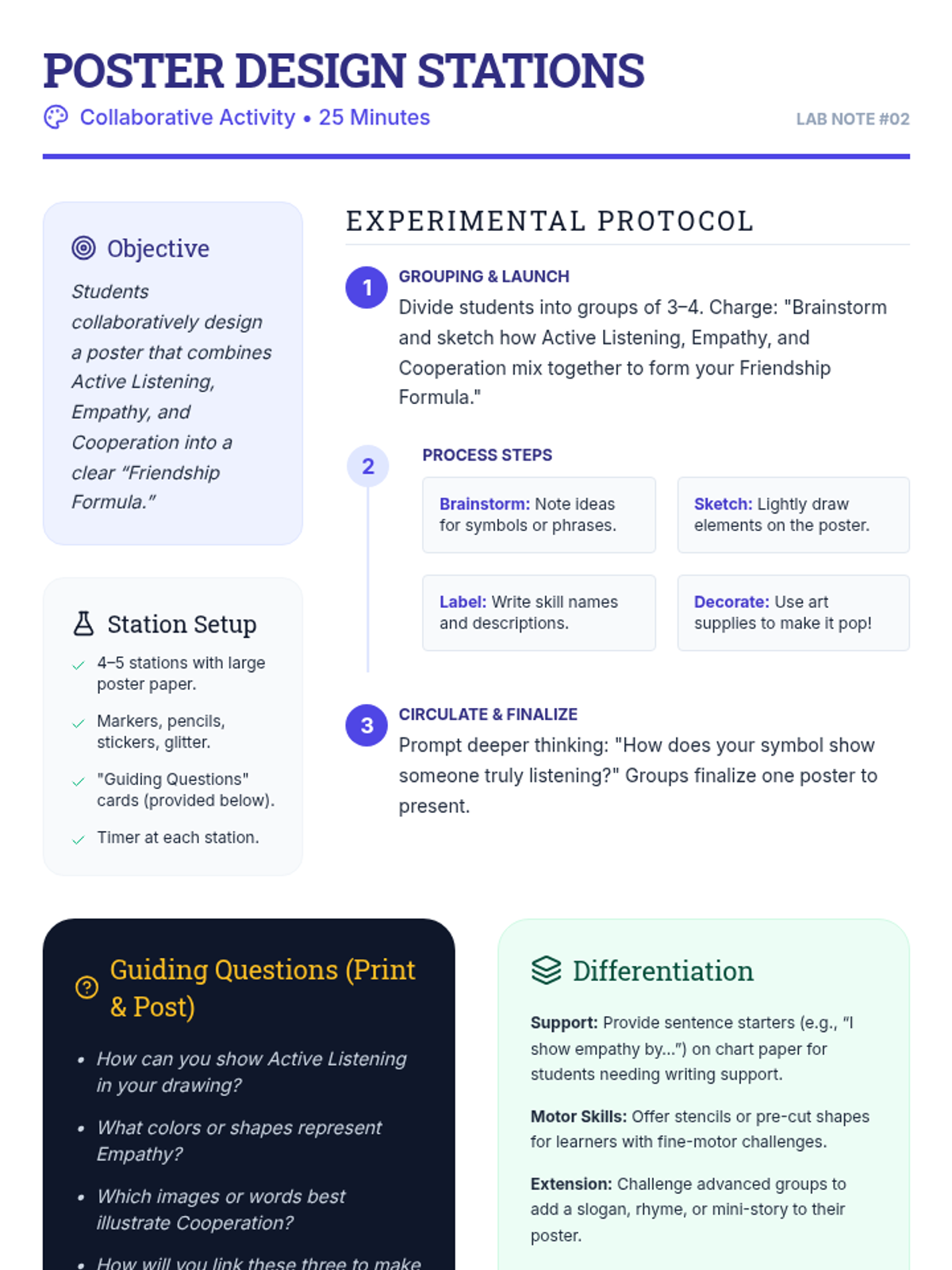 A creative workshop where 4th grade students design their own 'Friendship Formula' posters to explore relationship skills—active listening, empathy, and cooperation.