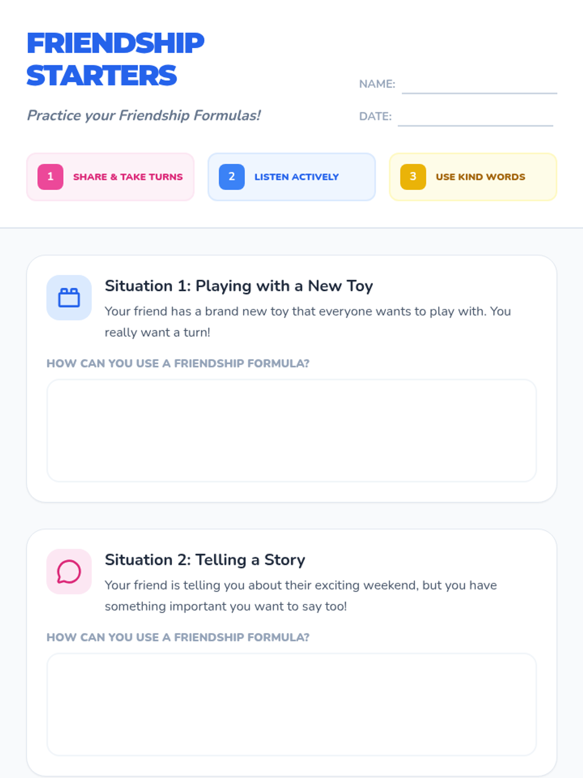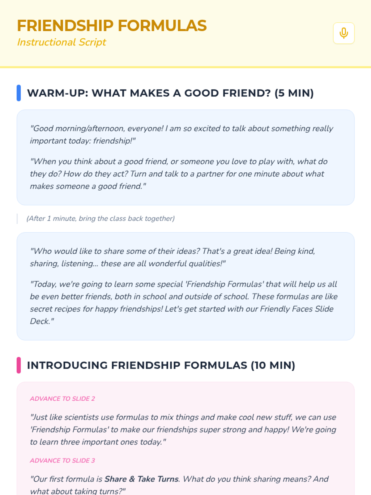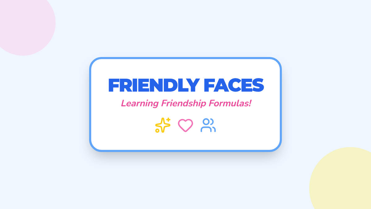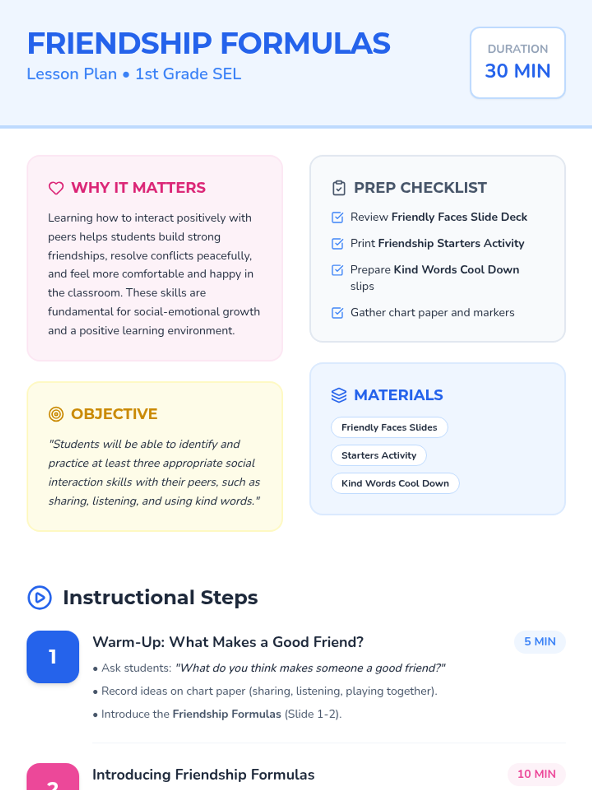 A 30-minute Tier 1 SEL lesson for 1st grade focused on learning 'Friendship Formulas'—simple social strategies like sharing, active listening, and using kind words to build strong relationships.