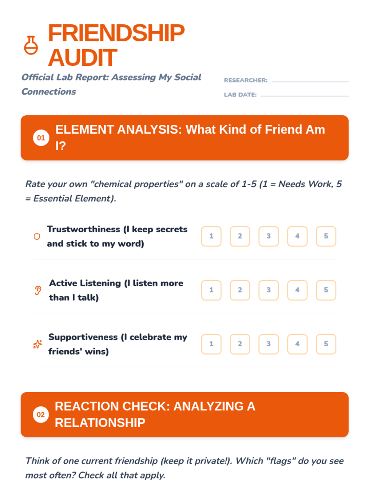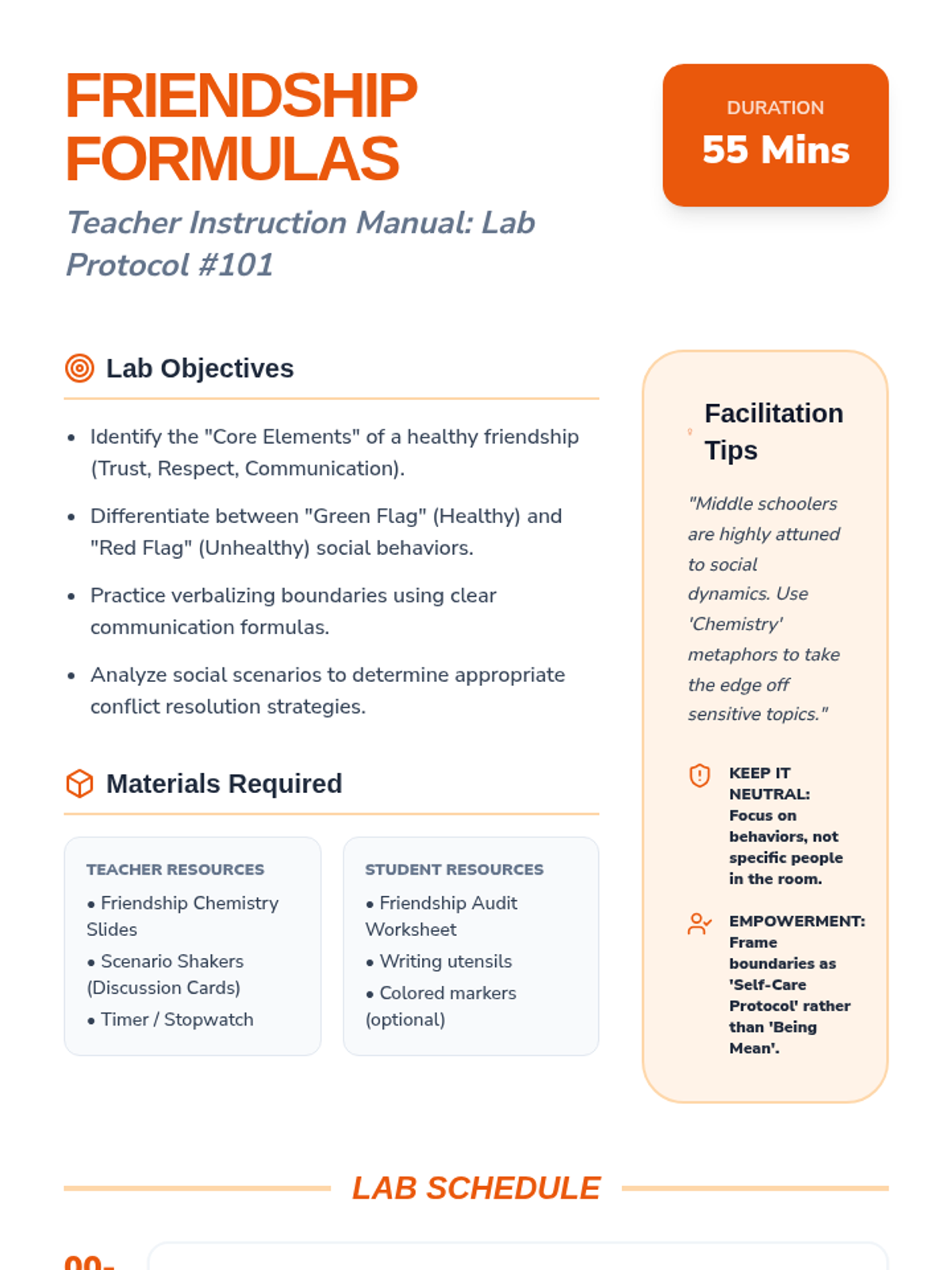 Students explore the "chemistry" of healthy relationships, identifying key ingredients like trust, respect, and boundaries while learning to spot red flags and navigate social challenges in middle school.