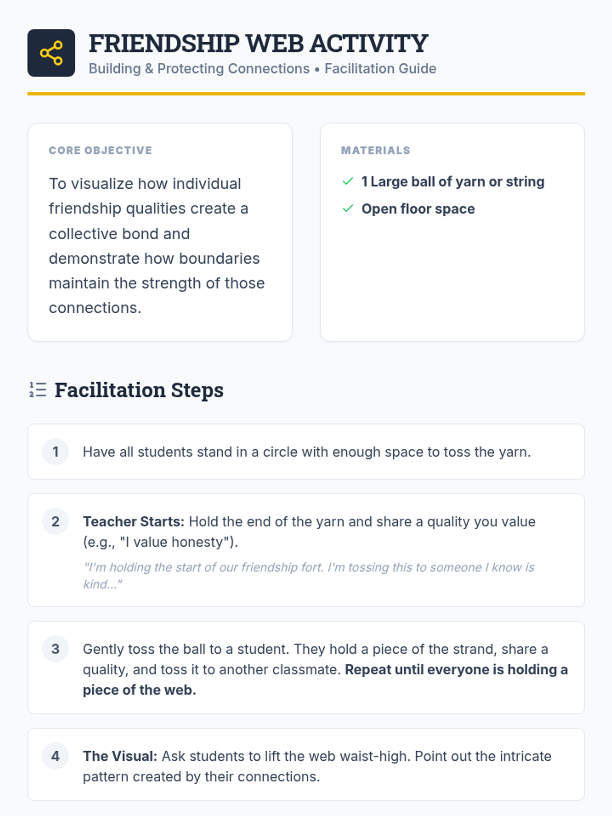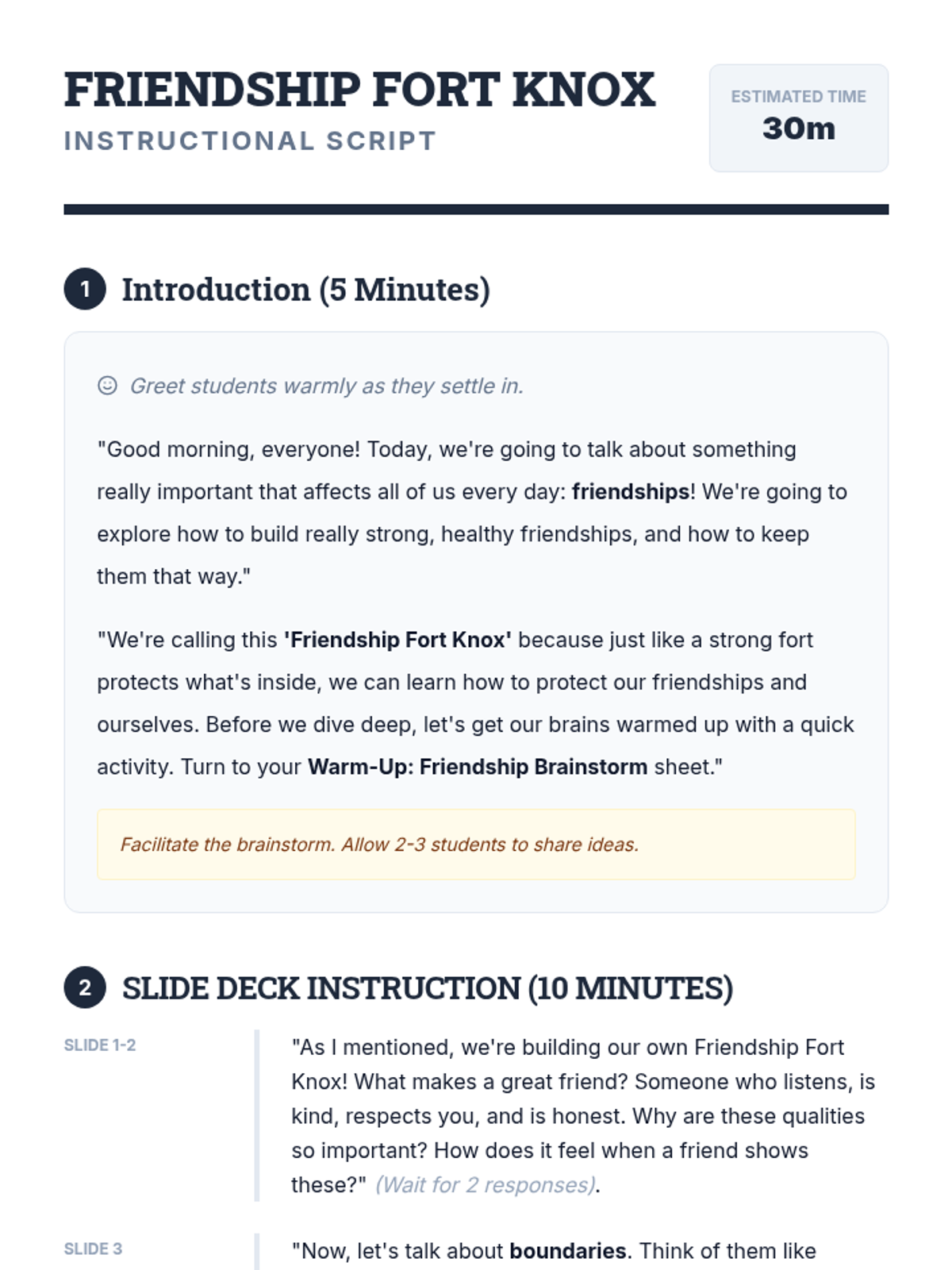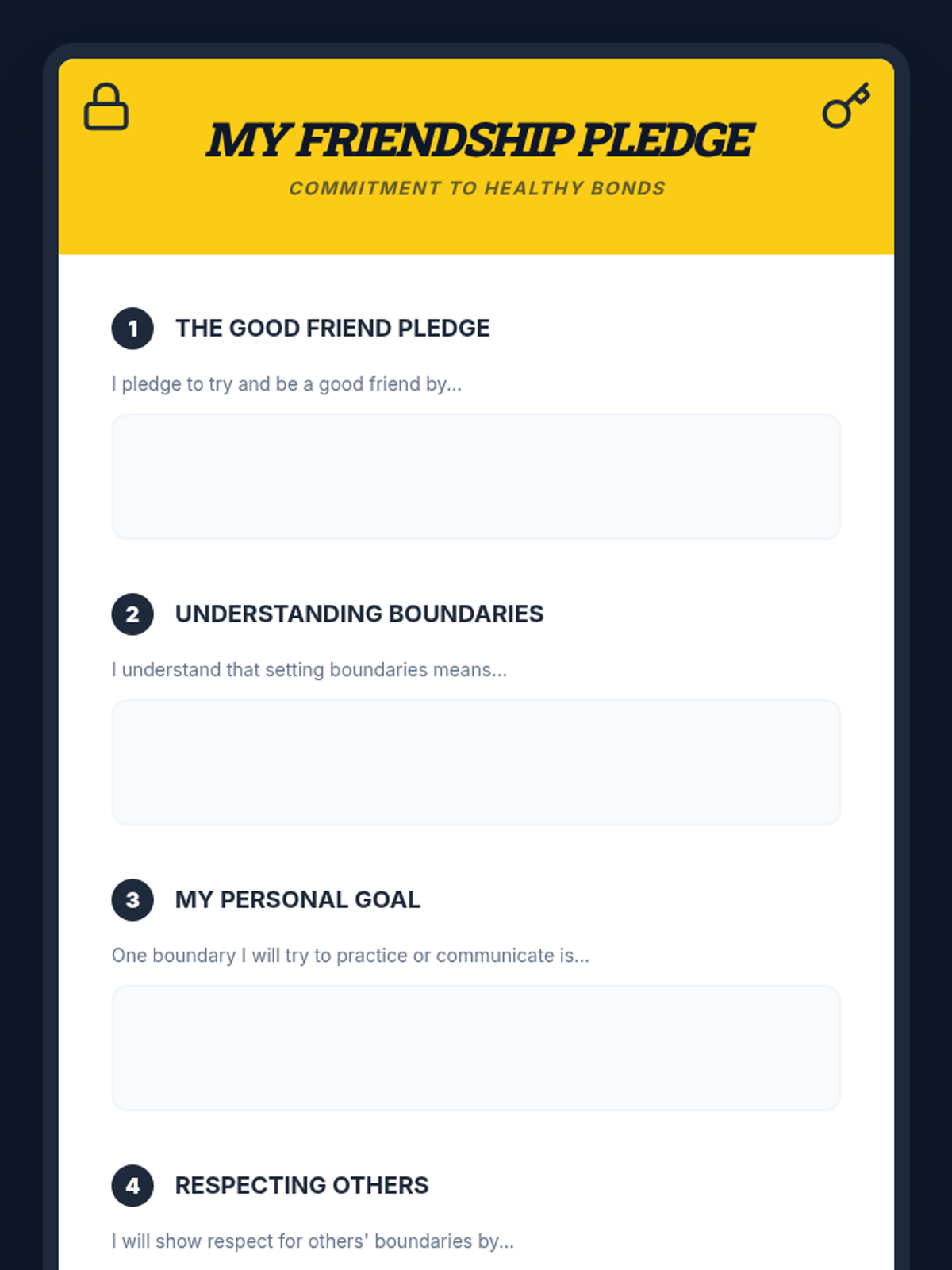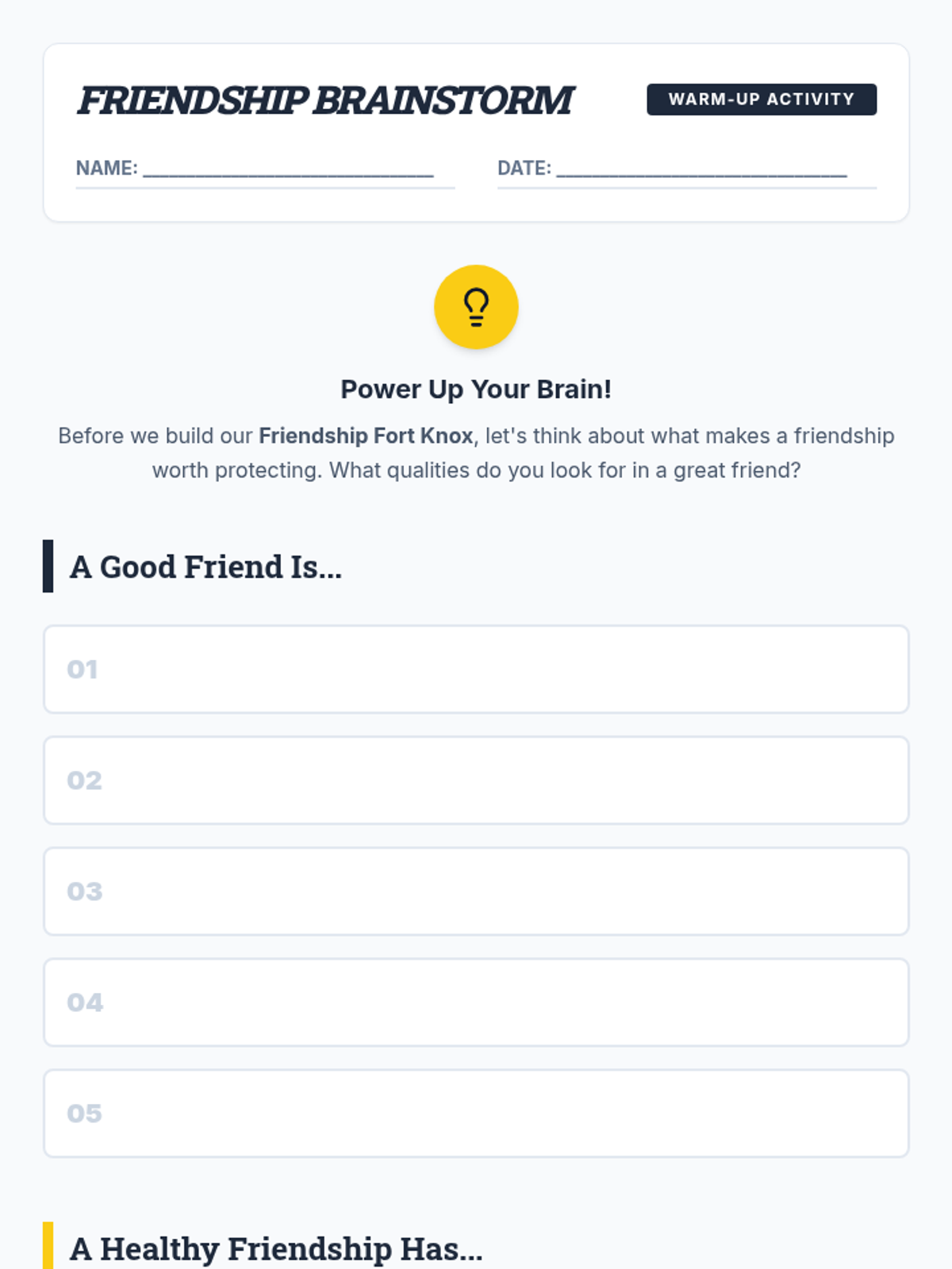 A 30-minute counseling lesson for 5th graders on building healthy friendships and setting personal boundaries through the 'Fort Knox' metaphor of security and respect.