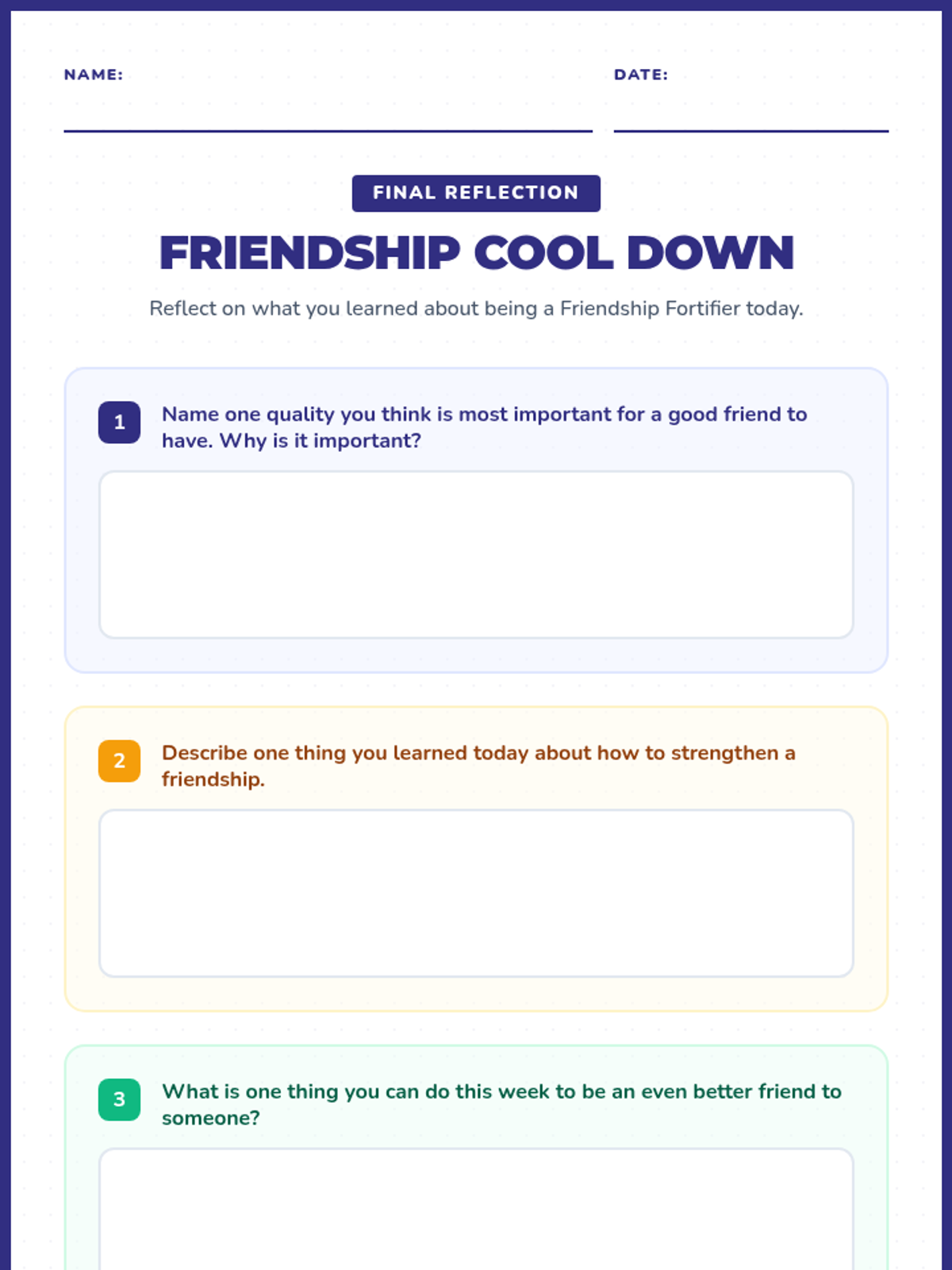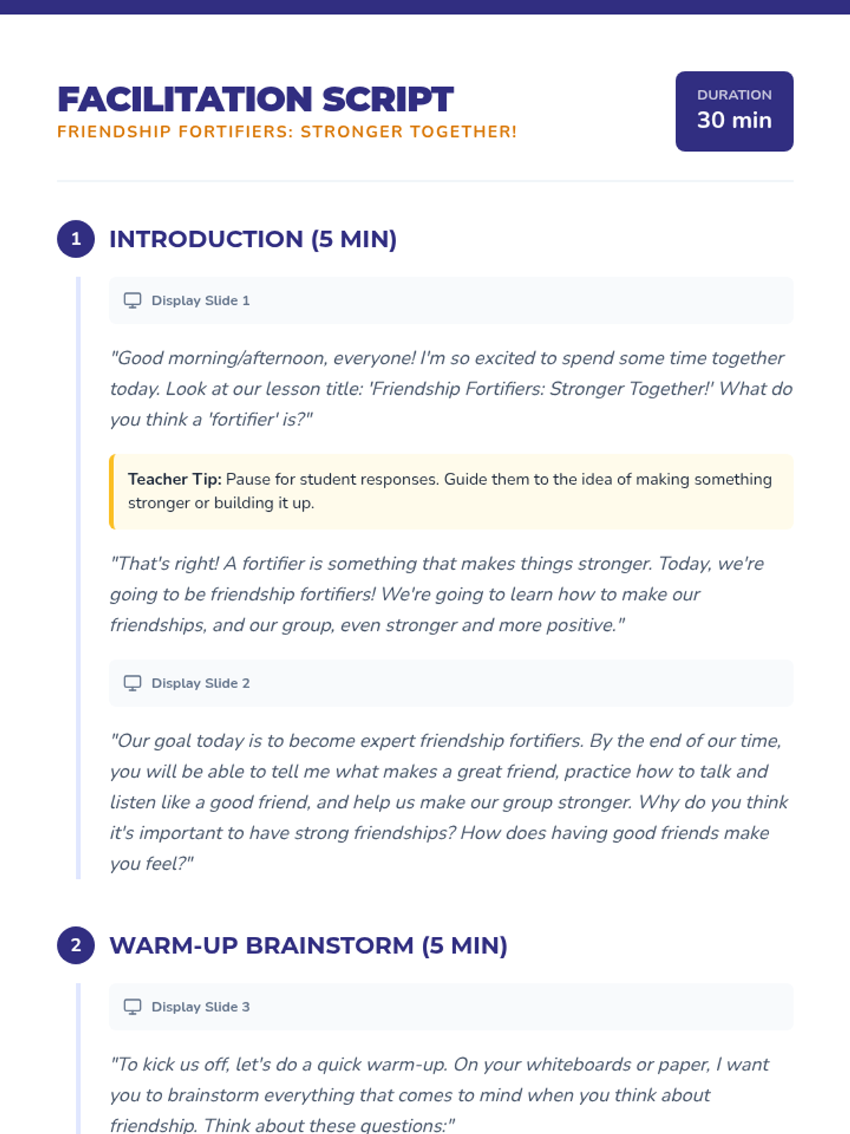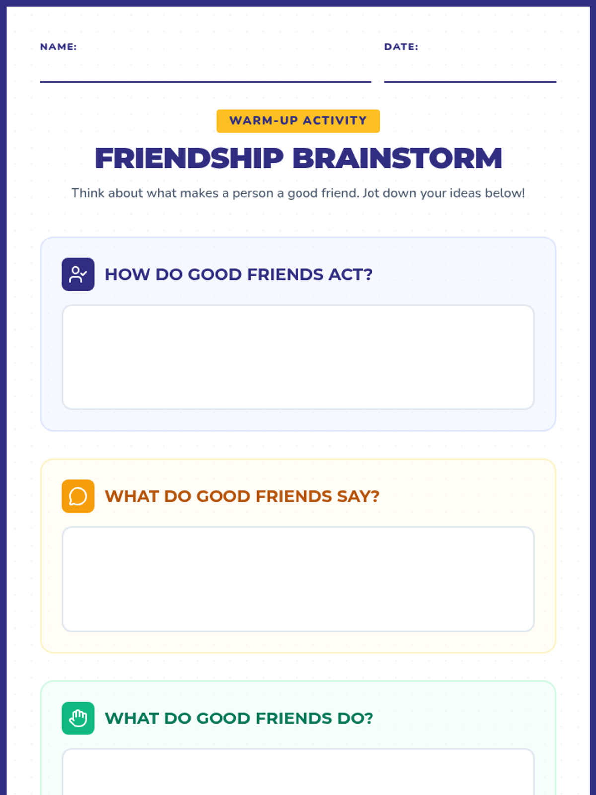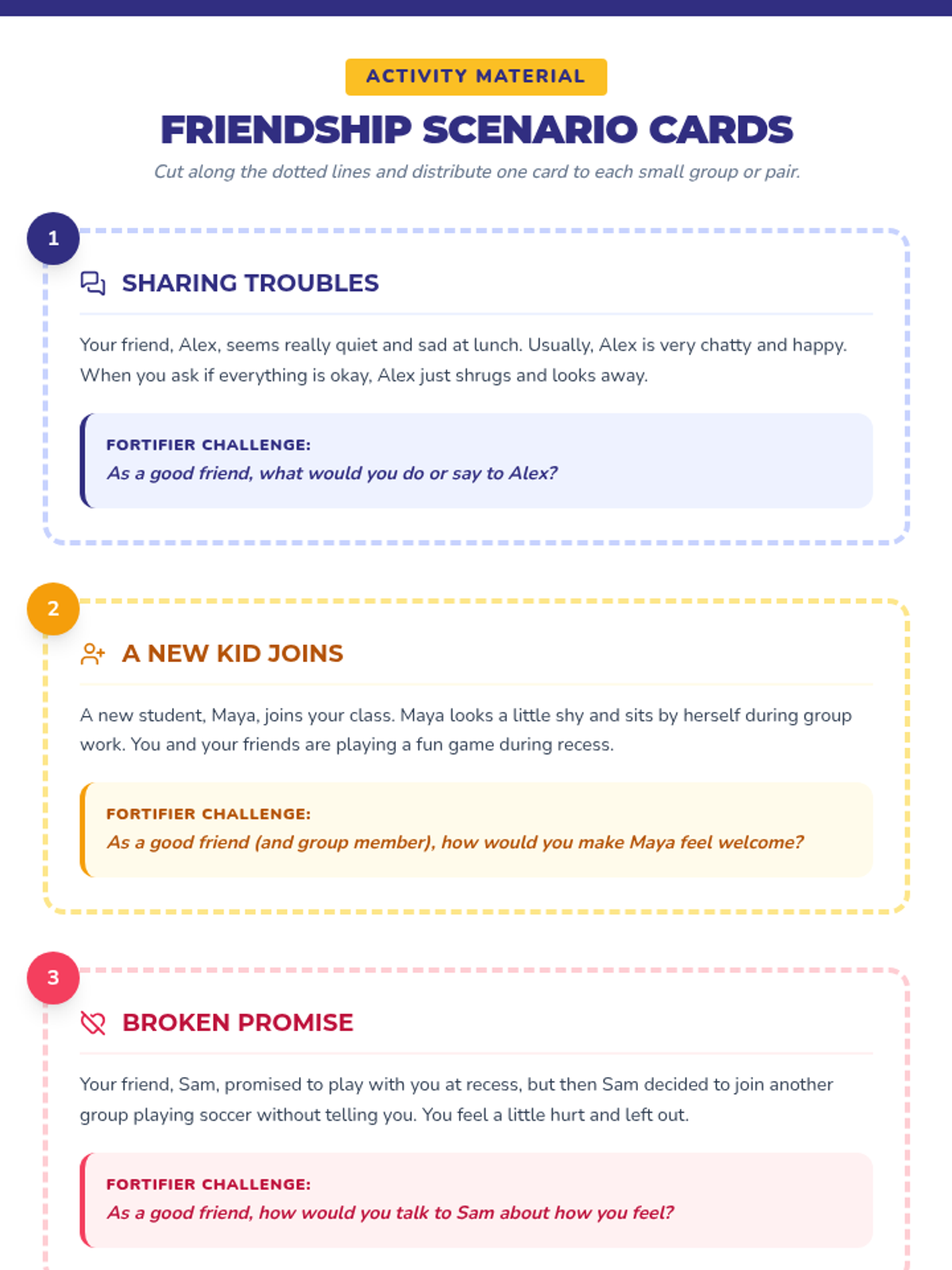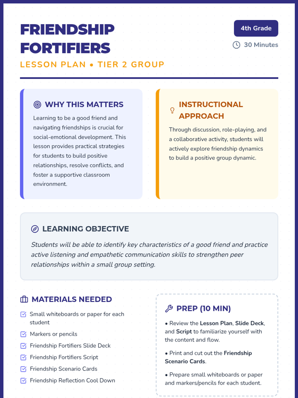 A 30-minute Tier 2 small group lesson for 4th graders focused on identifying qualities of a good friend and practicing communication skills to strengthen peer relationships. Students engage in brainstorming, role-playing with scenario cards, and reflective writing.